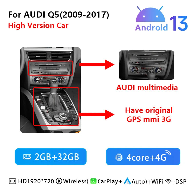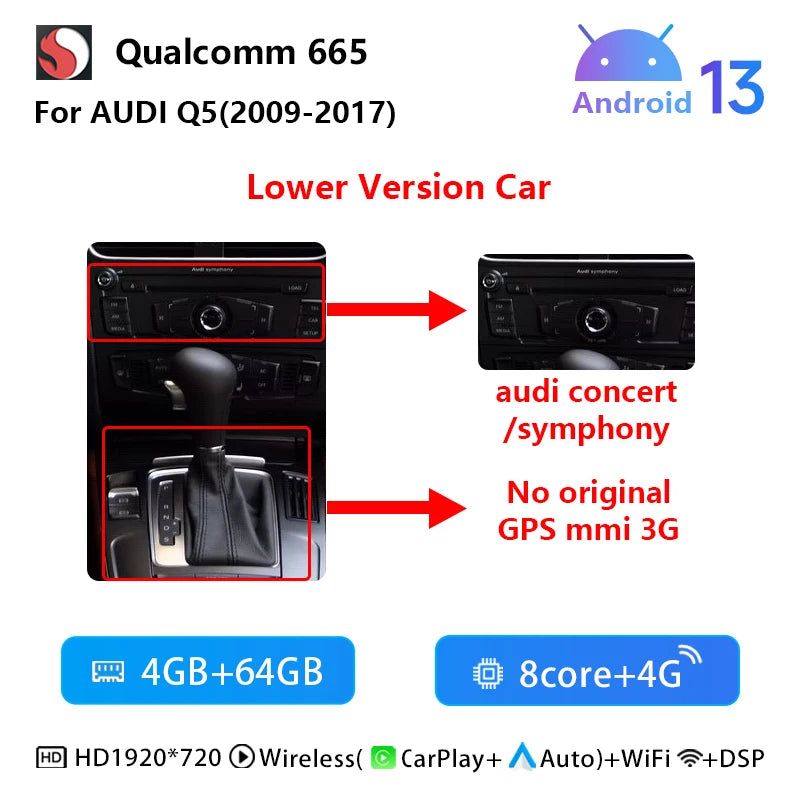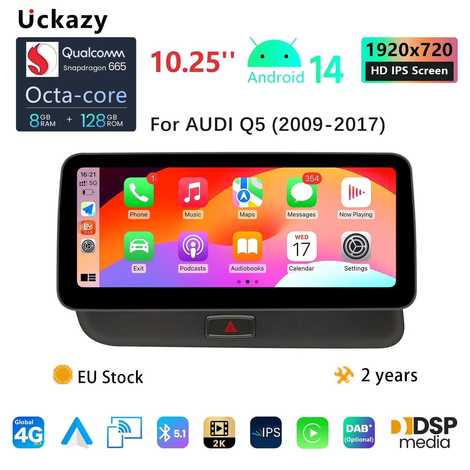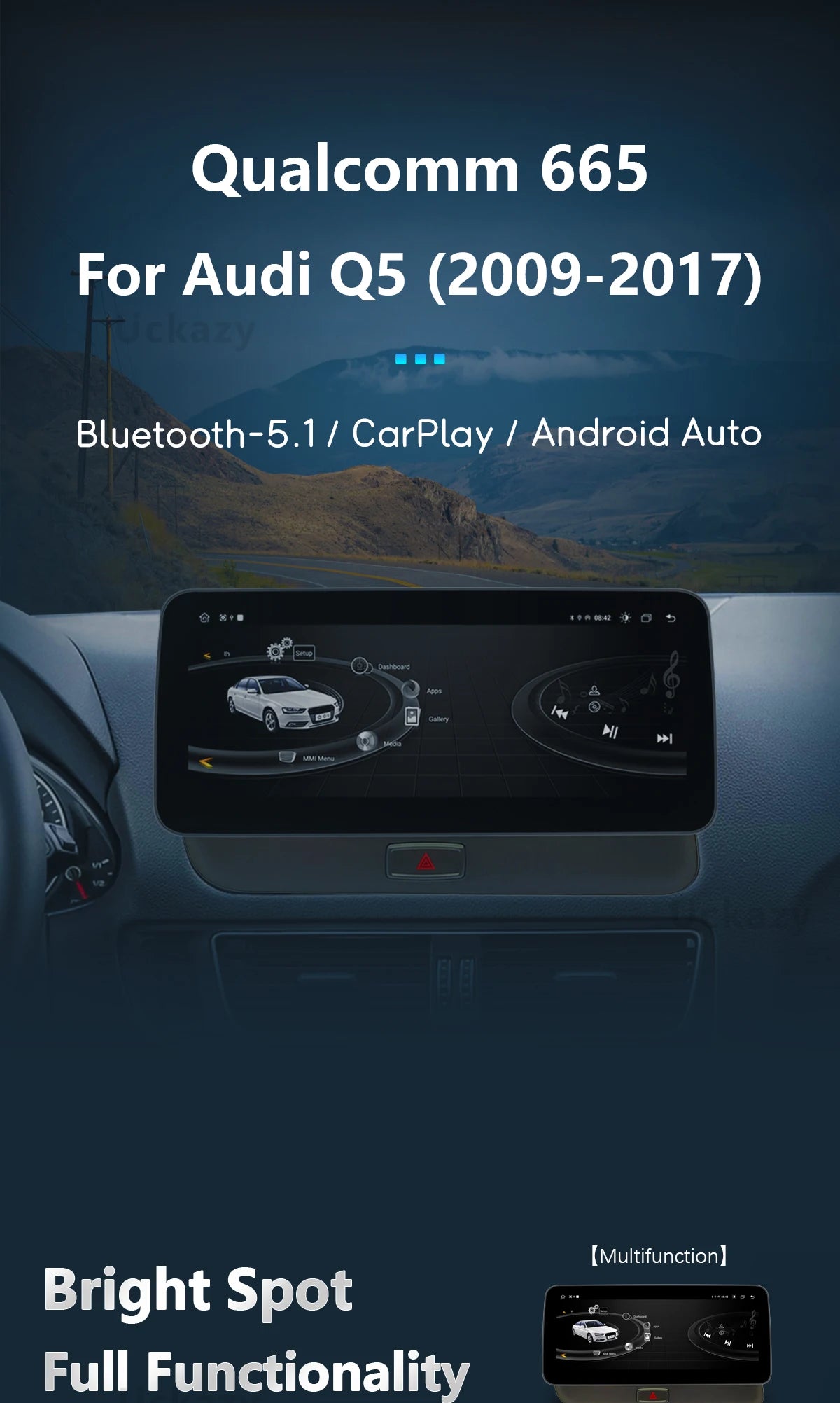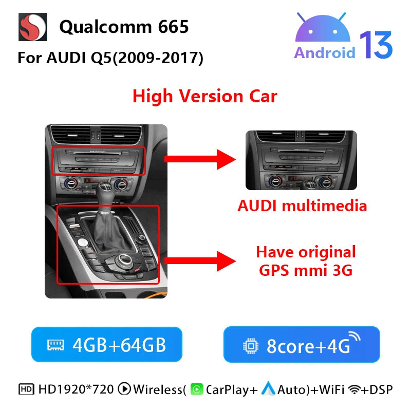 Experience advanced in-car entertainment and navigation with the 10.25-inch Snapdragon 665 Wireless CarPlay AutoRadio, designed specifically for Audi Q5 models from 2009 to 2016. Running on Android 14, this multimedia head unit offers seamless wireless CarPlay connectivity, a responsive touchscreen, and integrated GPS navigation. Enhance your driving experience with smooth performance, intuitive controls, and comprehensive multimedia support tailored to your vehicle.