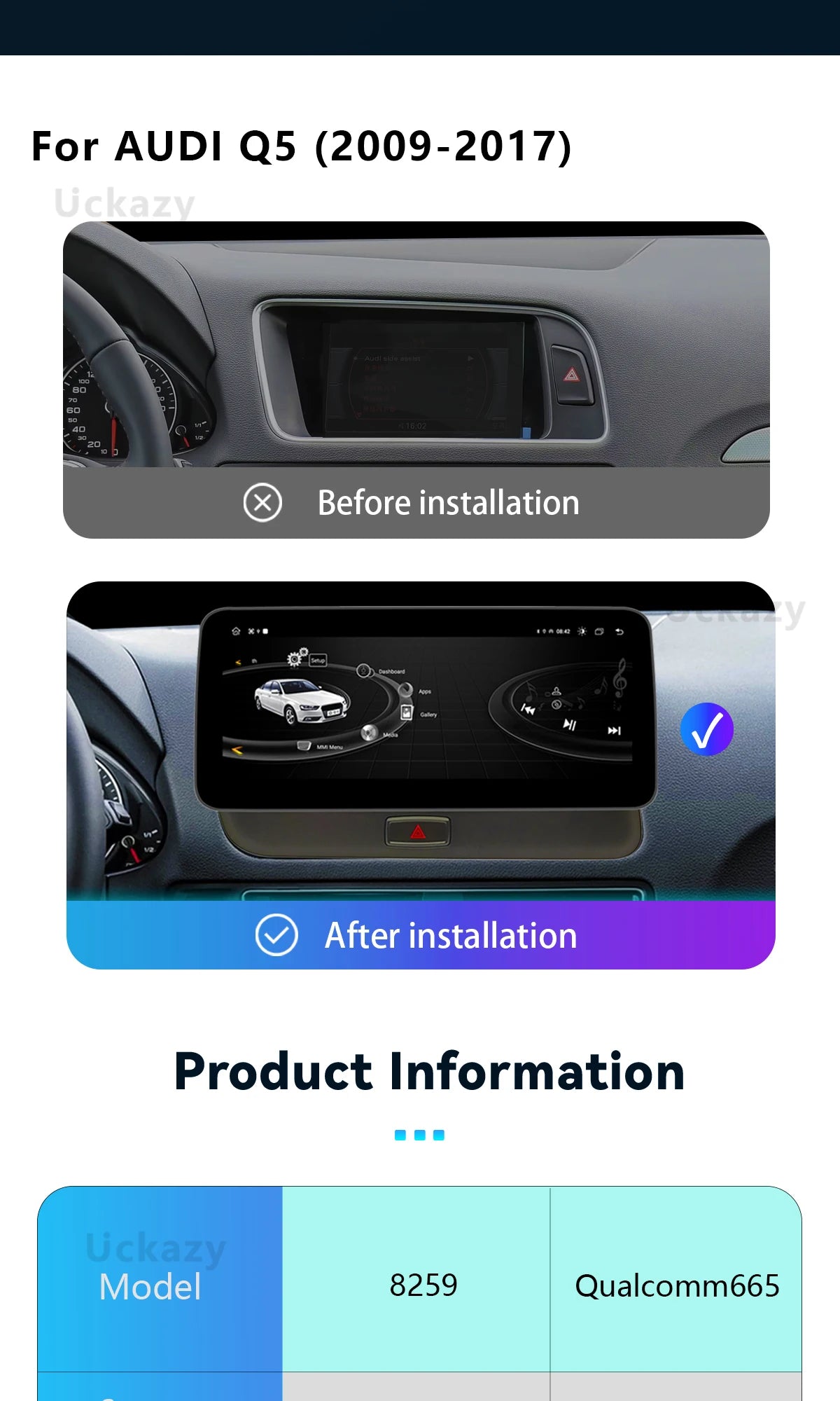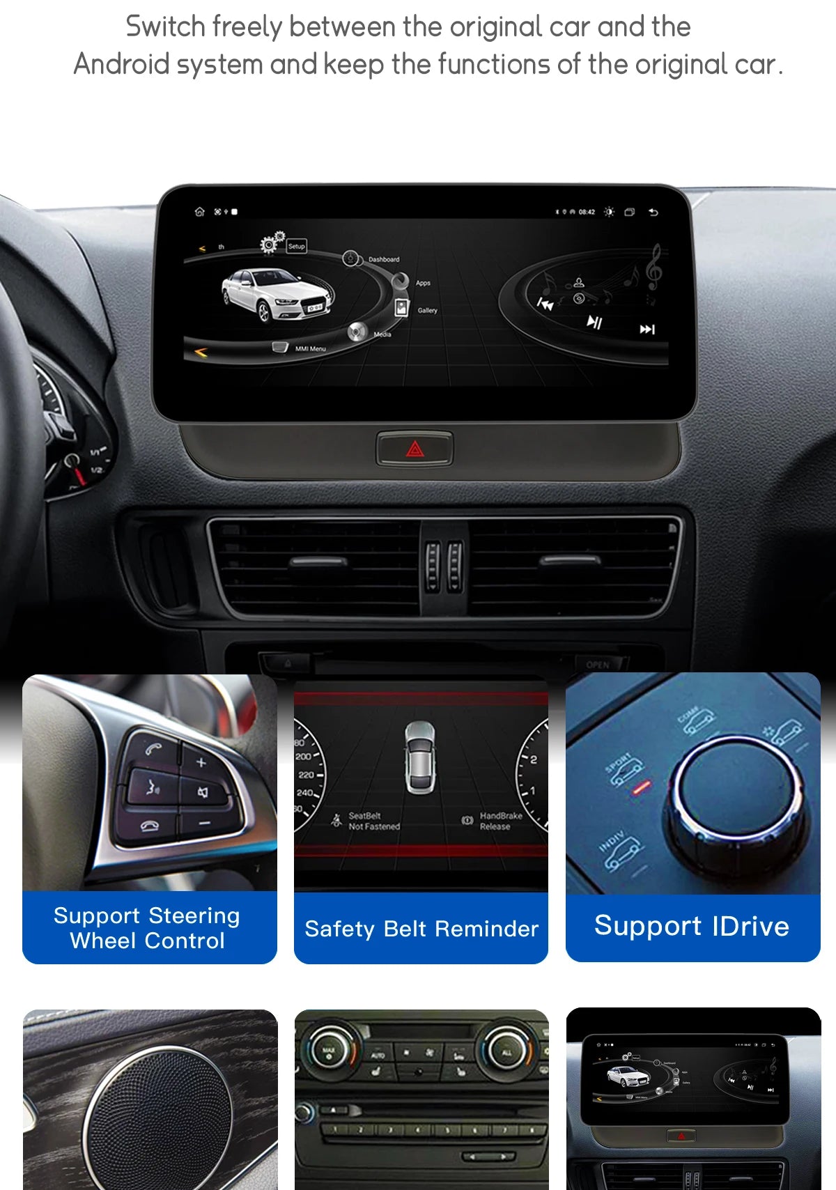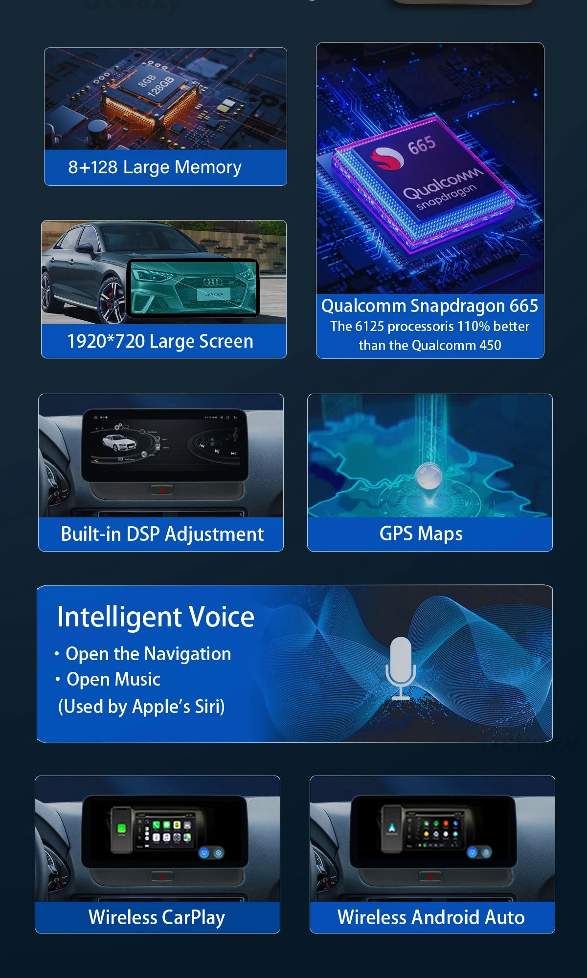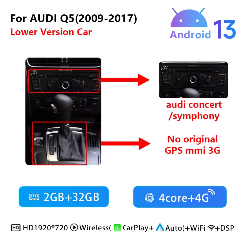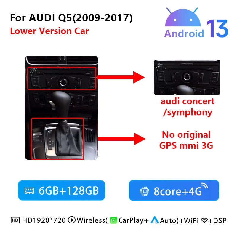Experience advanced in-car entertainment and navigation with the 10.25-inch Snapdragon 665 Wireless CarPlay AutoRadio, designed specifically for Audi Q5 models from 2009 to 2016. Running on Android 14, this multimedia head unit offers seamless wireless CarPlay connectivity, a responsive touchscreen, and integrated GPS navigation. Enhance your driving experience with smooth performance, intuitive controls, and comprehensive multimedia support tailored to your vehicle.