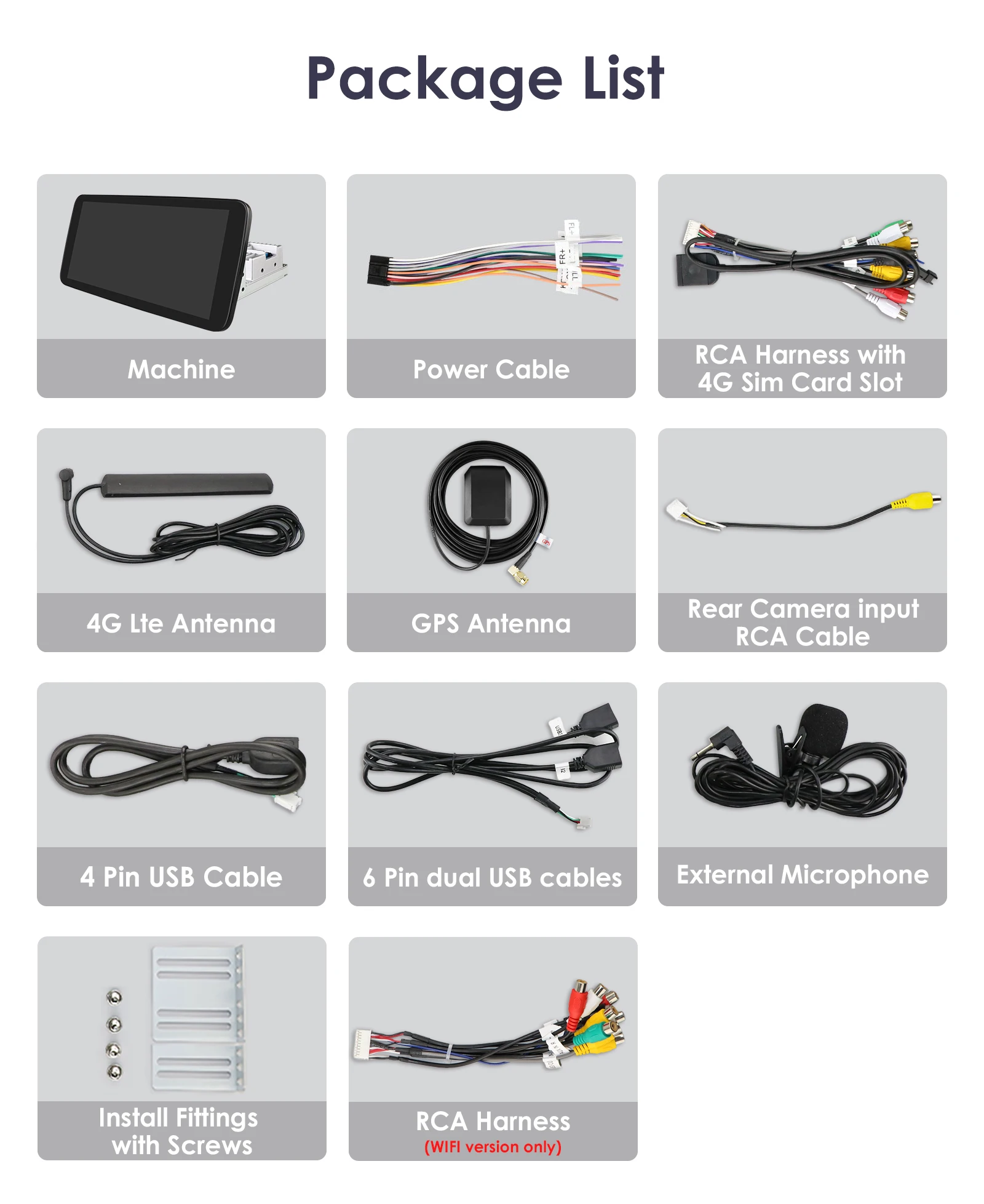 Standard Accessories: which ship with the head unit together(but please pay attension to the red words of accessory whether can get or not which depends on the item option you choose to buy it)
