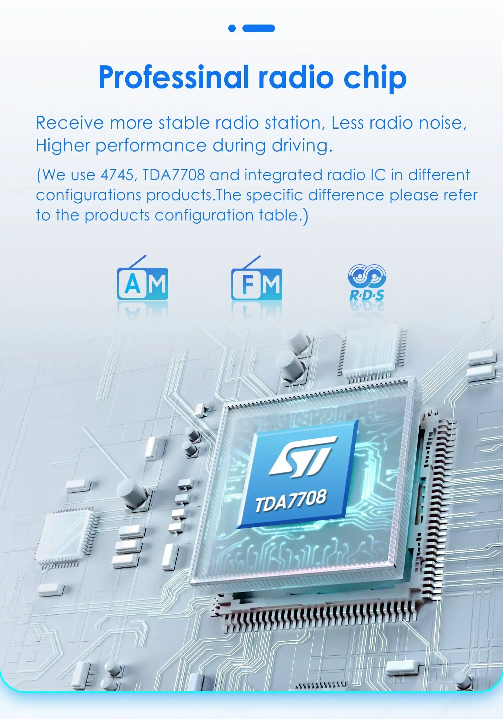 Professional radio chip: Receive more stable radio station ,less radio noise, higher performance during driving.  (We use 4745,TDA7708 and integrated radio IC in different configurations products, the specific different please refer to the products configuration table.)