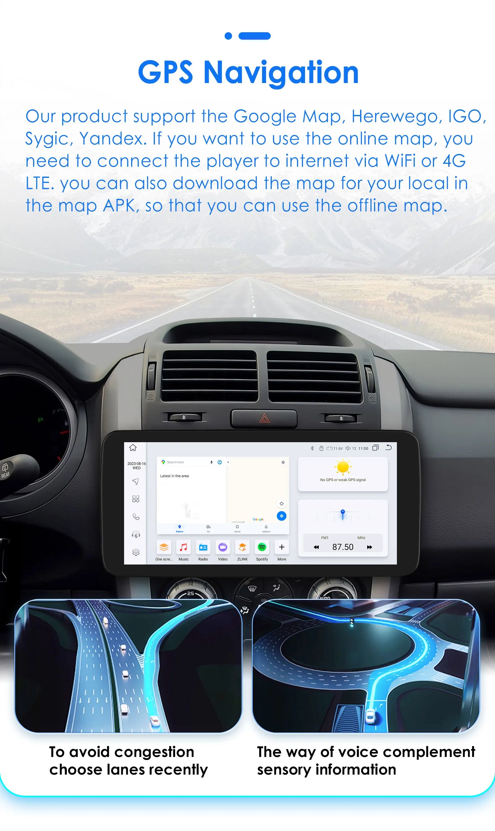 GPS Navigation: Supports Online and Off line Google map, Navitel, Waze, Herewego To avoid congestion choose lanes recently , the way of voice complement sensory information.