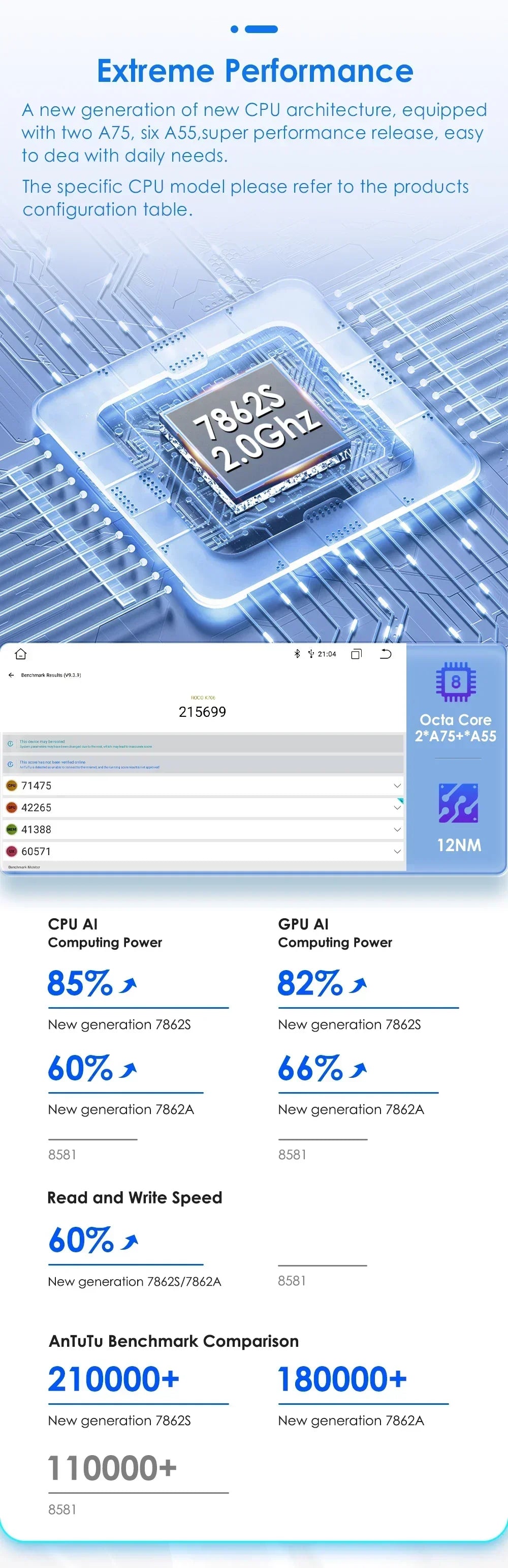 Extreme Performance: A new generation of new CPU architecture, equipped with Two A75,six A55,super performance release ,easy to deal with daily needs. The specific CPU model please refer to the products configuration table. 7862A 1.8Ghz.