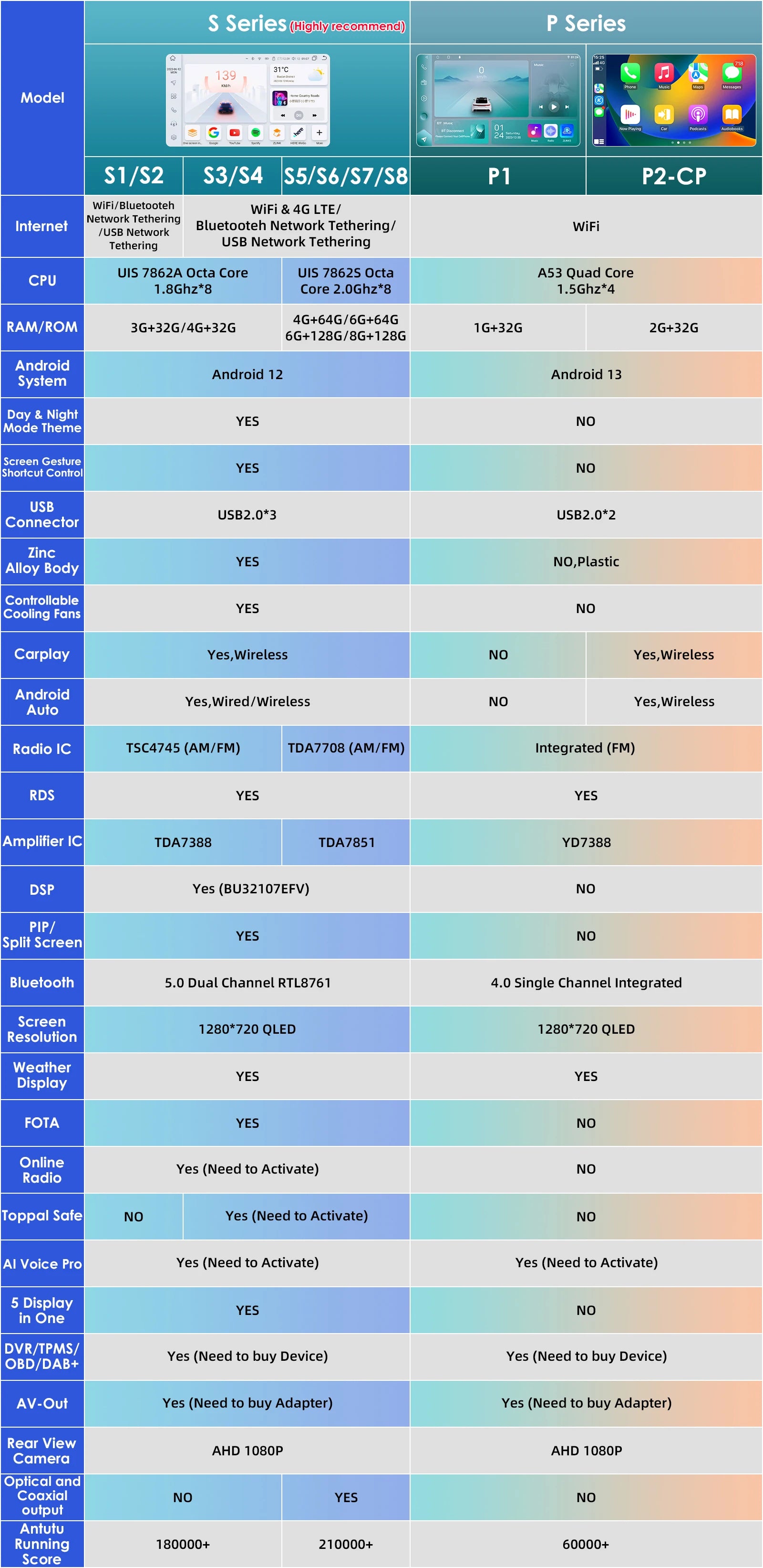 2) Built-in Carplay/ Android Auto: P2-CP/S1/S4/S6/S8 version supporting, just use your phone cable connect it, stable and easy to use;