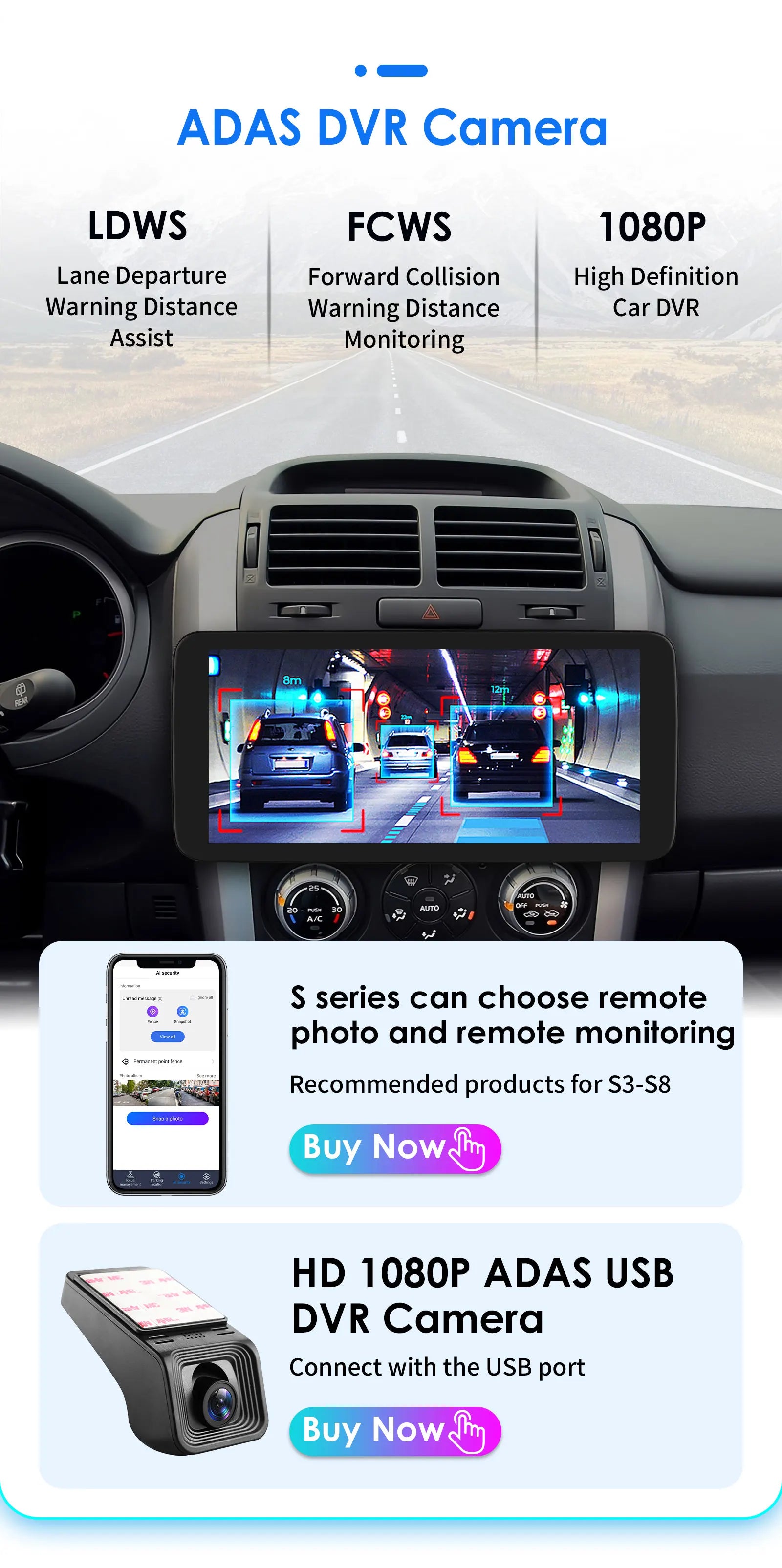 HD 1080P ADAS DVR Camera(Needs to order separately) --connect with the USB port:  LDWS(Lane Departure Warning Distance),FCWS(Forward Collision Warning Distance), 1080P(High Definition Car DVR)
