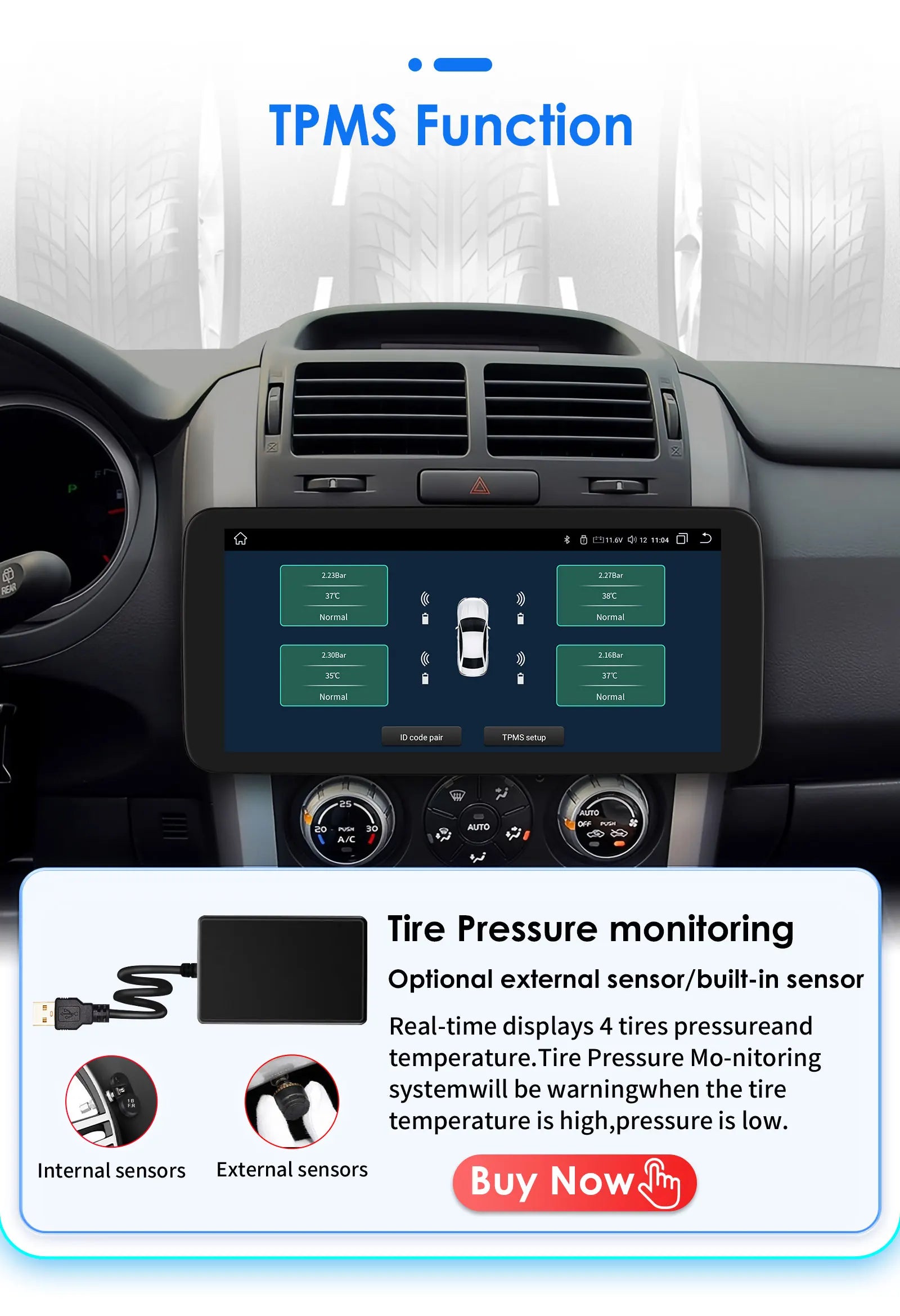 TPMS Function( Needs to order separately) :  Tire Pressure Monitoring: Real-time displays 4 tires pressure and temperature,Tire Pressure Monitoring system will be warning when the tire temperature is high, pressure is low.You can click on the image below to purcha