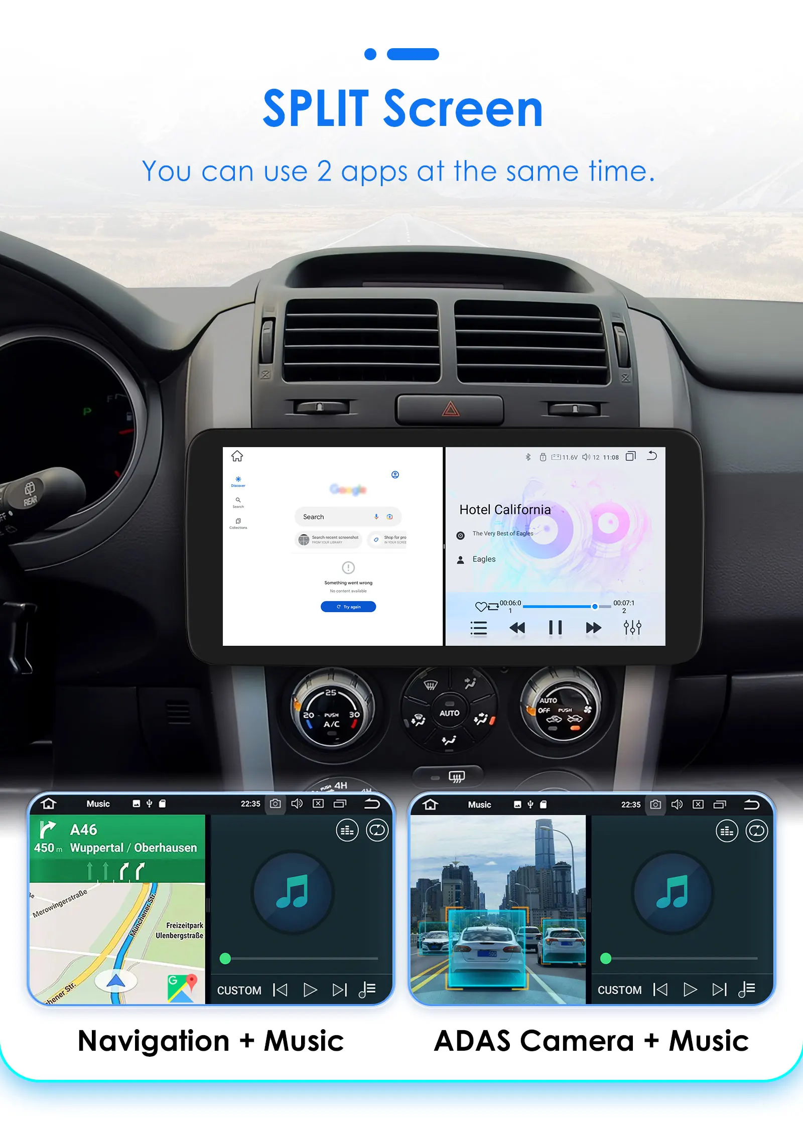Split Screen : You can use 2 apps at the same time (such as: Navigation + Music , ADAS Camera + Music ,etc.)