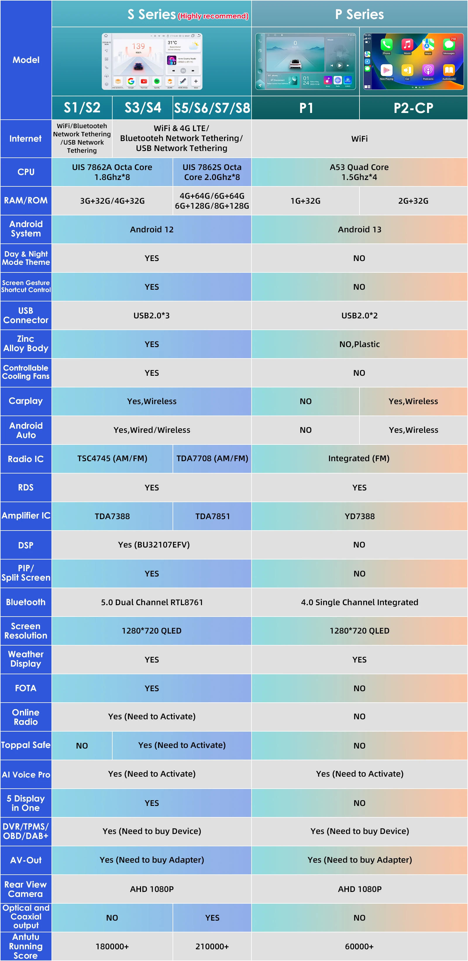 2) Built-in Carplay/ Android Auto: P2-CP/S1/S4/S6/S8 version supporting, just use your phone cable connect it, stable and easy to use;