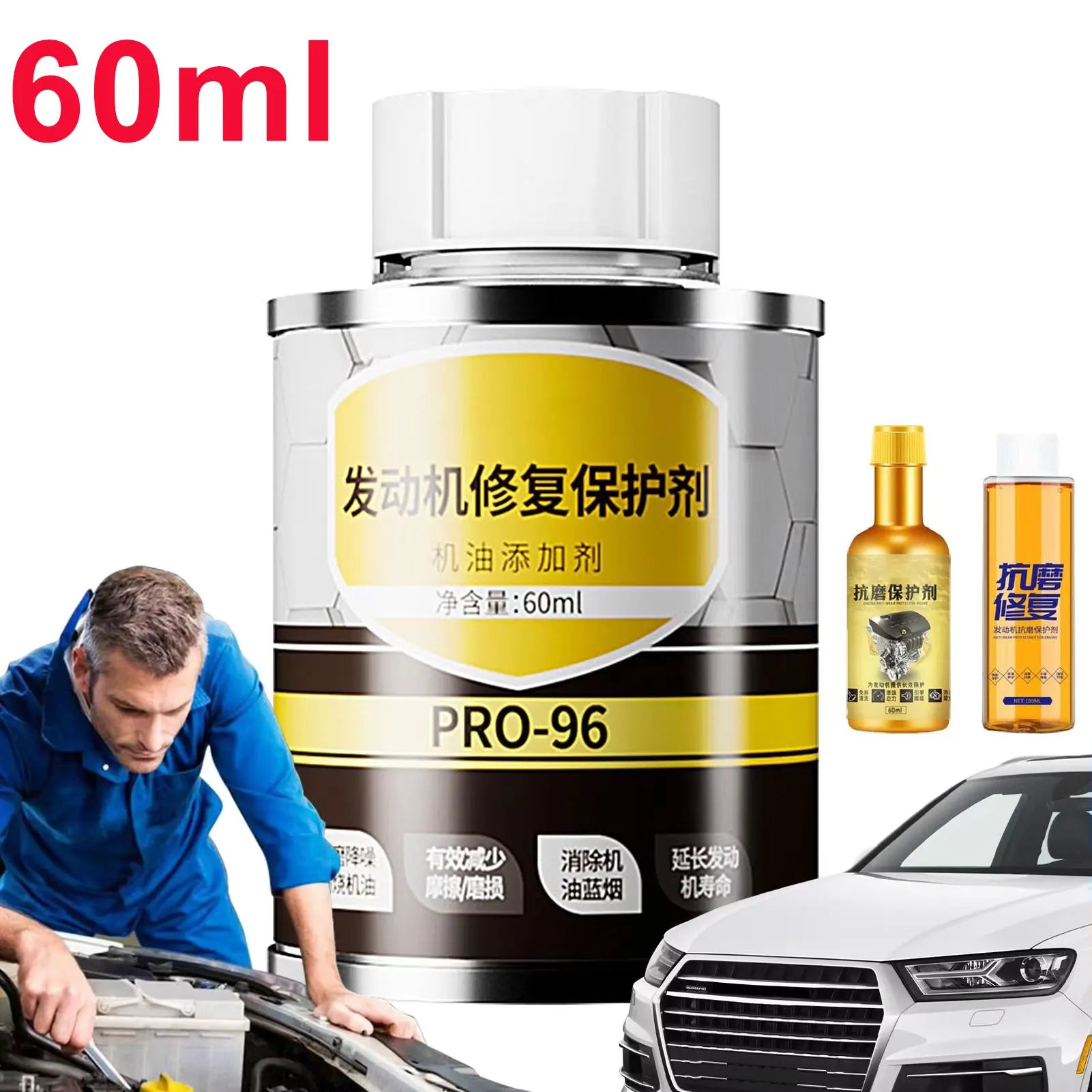 Bullet Points:1.Smooth Engine Performance: Our engine oil protectant protects important components, improving engine performance, reducing noise, and vibrations, and ensuring a longer-lasting, smoother ride 2.Friction Modified: Keep your engine running smoothly with our engine oil protectant. It reduces friction and prevents cold start damage, protecting and preparing your engine for optimal performance 3.Dependable I ngredients: Thanks to its advanced cooling i ngredients and increased viscosity, our engine oil protectant provides excellent engine protection against wear and tear. This reduces engine friction while maximizing power output and efficiency 4.Practical and Helpful: The engine repair additive effectively reduces oil burning while improving the full burning rate to extend the service life of engine parts 5.Widely Applicable: Engine oil additive, suitable for most vehicles, providing a widely applicable and practical solution for enhanced engine protection Protect your engine and reduce friction with our engine repair additive. Formulated with engine protector oil, it provides a practical solution for engine protection. Specifications:Product name: Engine repair protectantNet content: 60ml/100MLShelf life: 3 yearsProduct efficacy: Increase lubrication, reduce wear noise, cool, improve oil burningPacking List:1 * Engine repair protectantNotes: 1. Due to the lighting effects and photographing angles, there is a color difference in the product, please understand.2. Due to manual measurement, there is a tolerance in the product size.