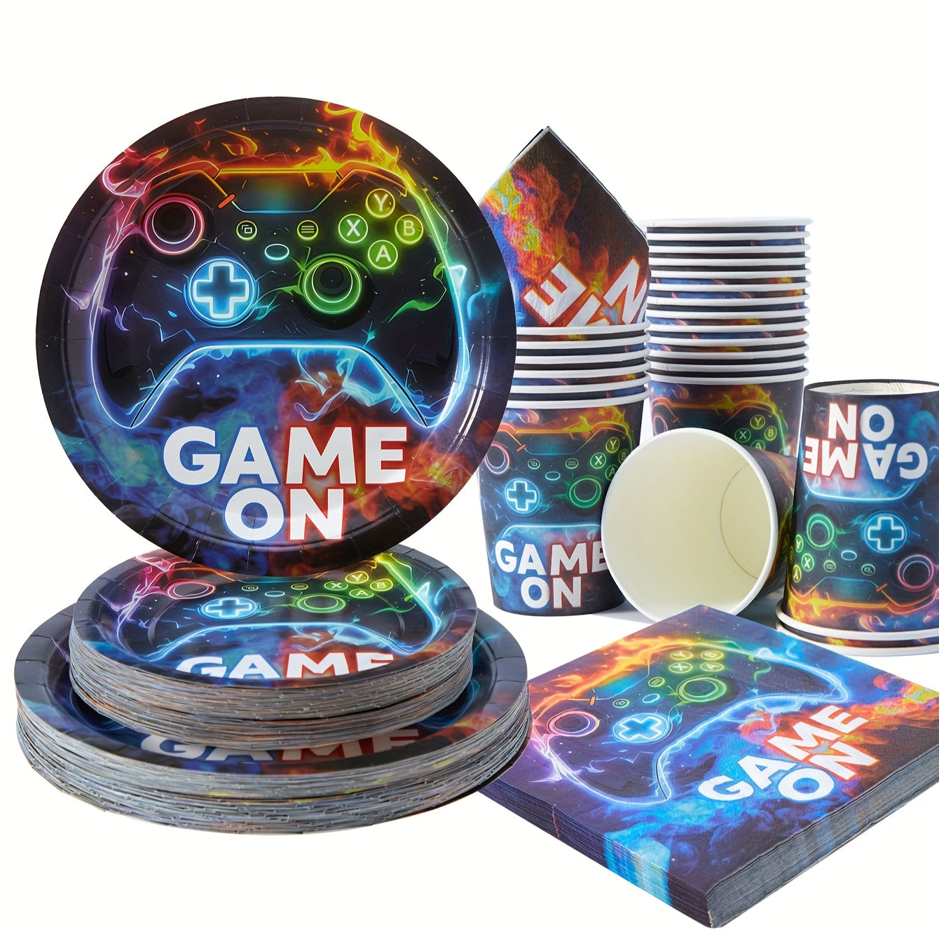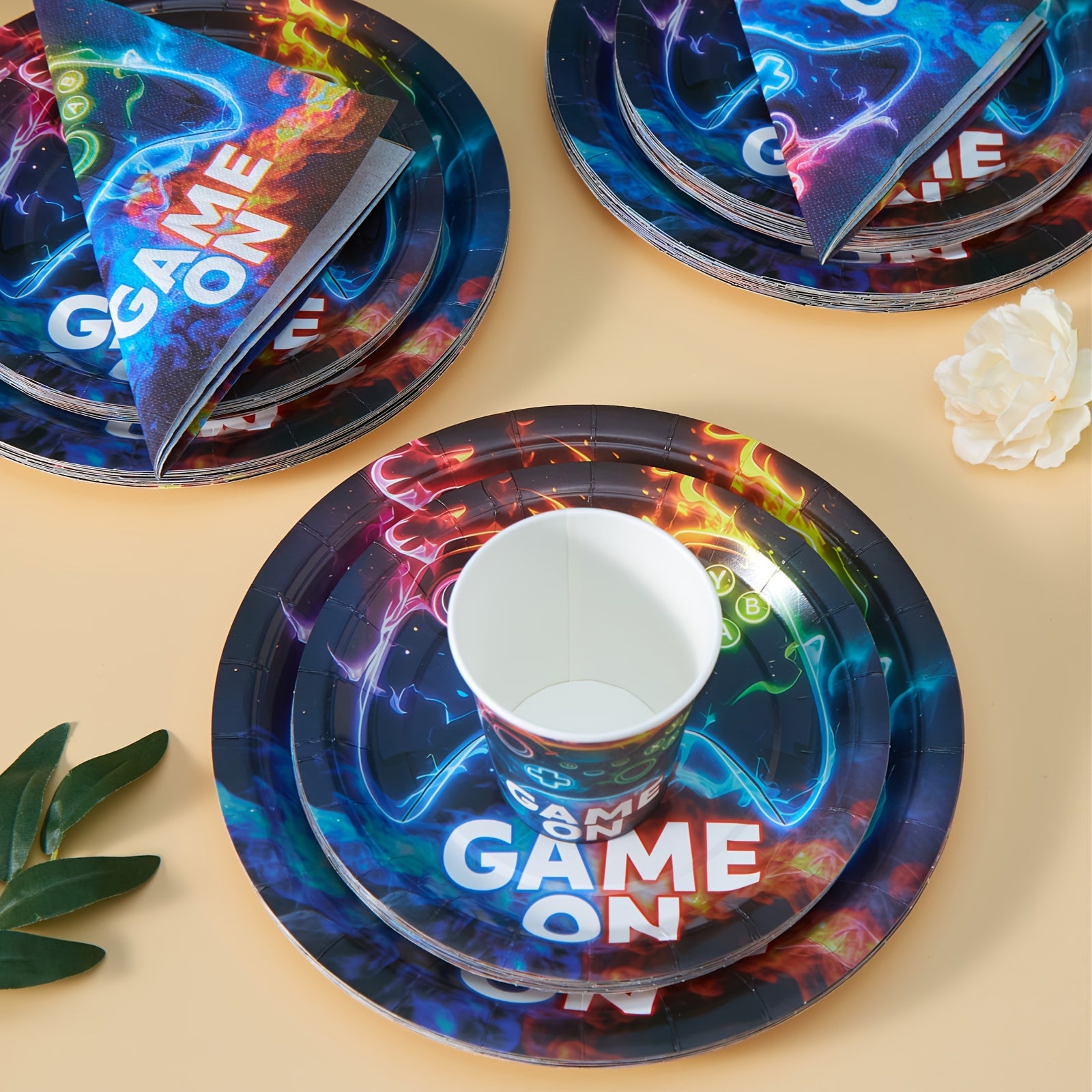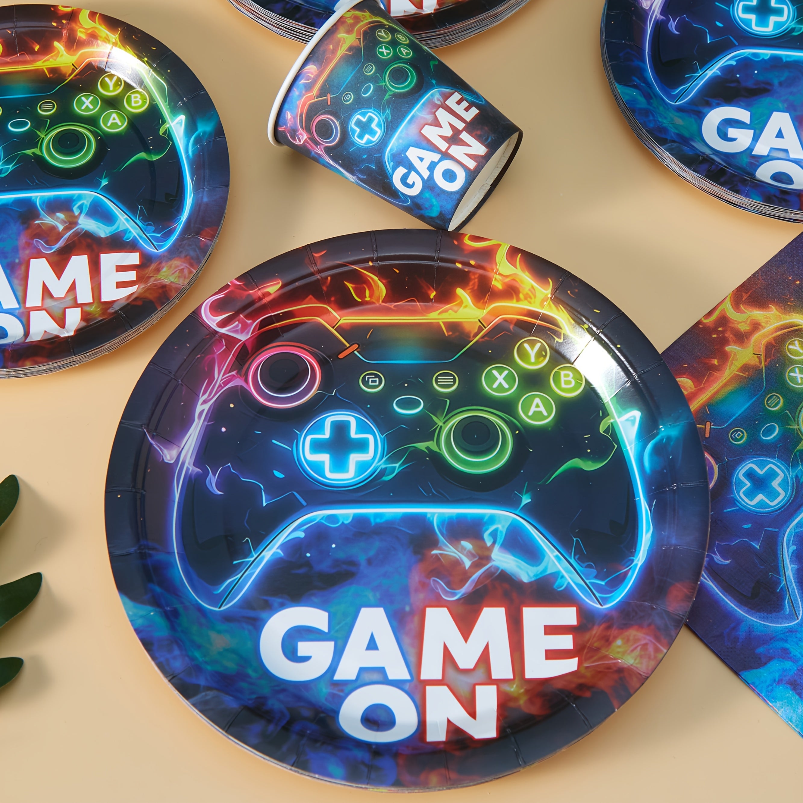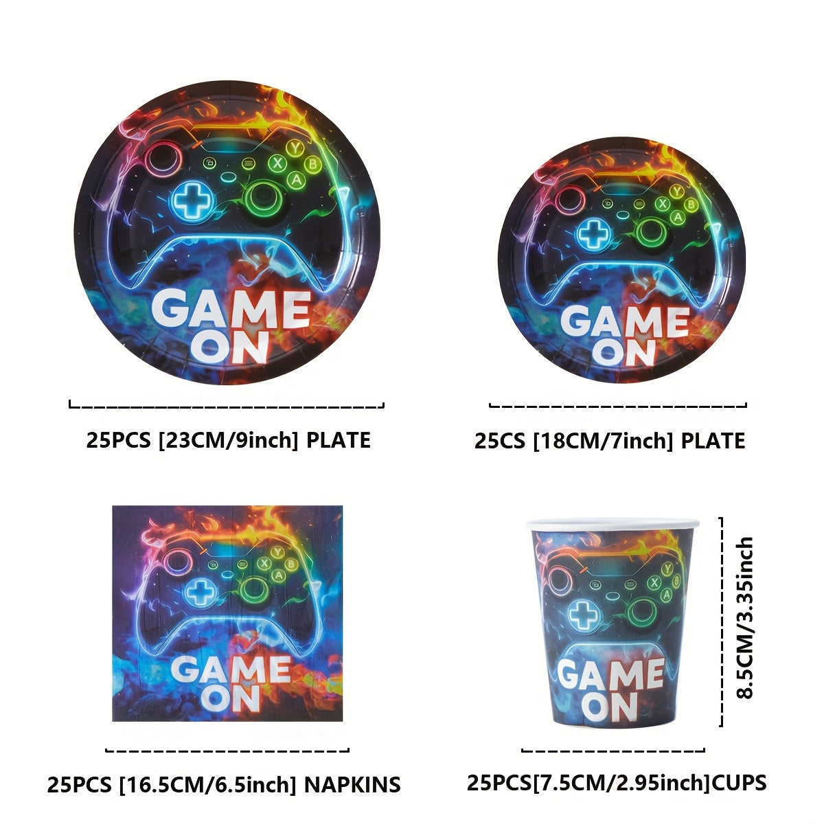 100 pezzi di piatti da pranzo usa e getta Flame Gaming, tovaglioli e tazze di carta - Design vibrante di un controller di gioco neon, perfetto per 25 ospiti a feste di compleanno e picnic in famiglia, forniture per feste | Tema di gioco vibrante | Piatti