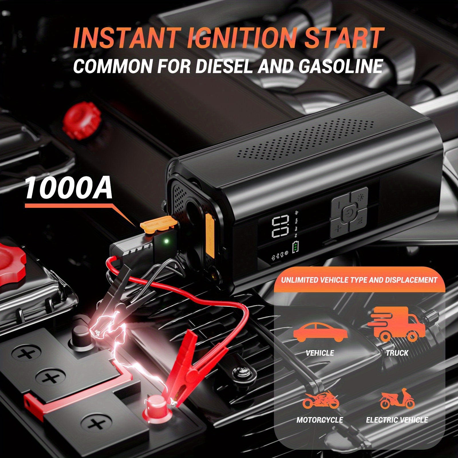 1000A Peak Portable Jump Starter con compressore d'aria, ricarica USB, torcia LED - Ideale per auto, moto, biciclette, pneumatici e altro - Rapida gonfiatura, doppia efficienza, monitoraggio della pressione in tempo reale, pausa automatica, impostazione p