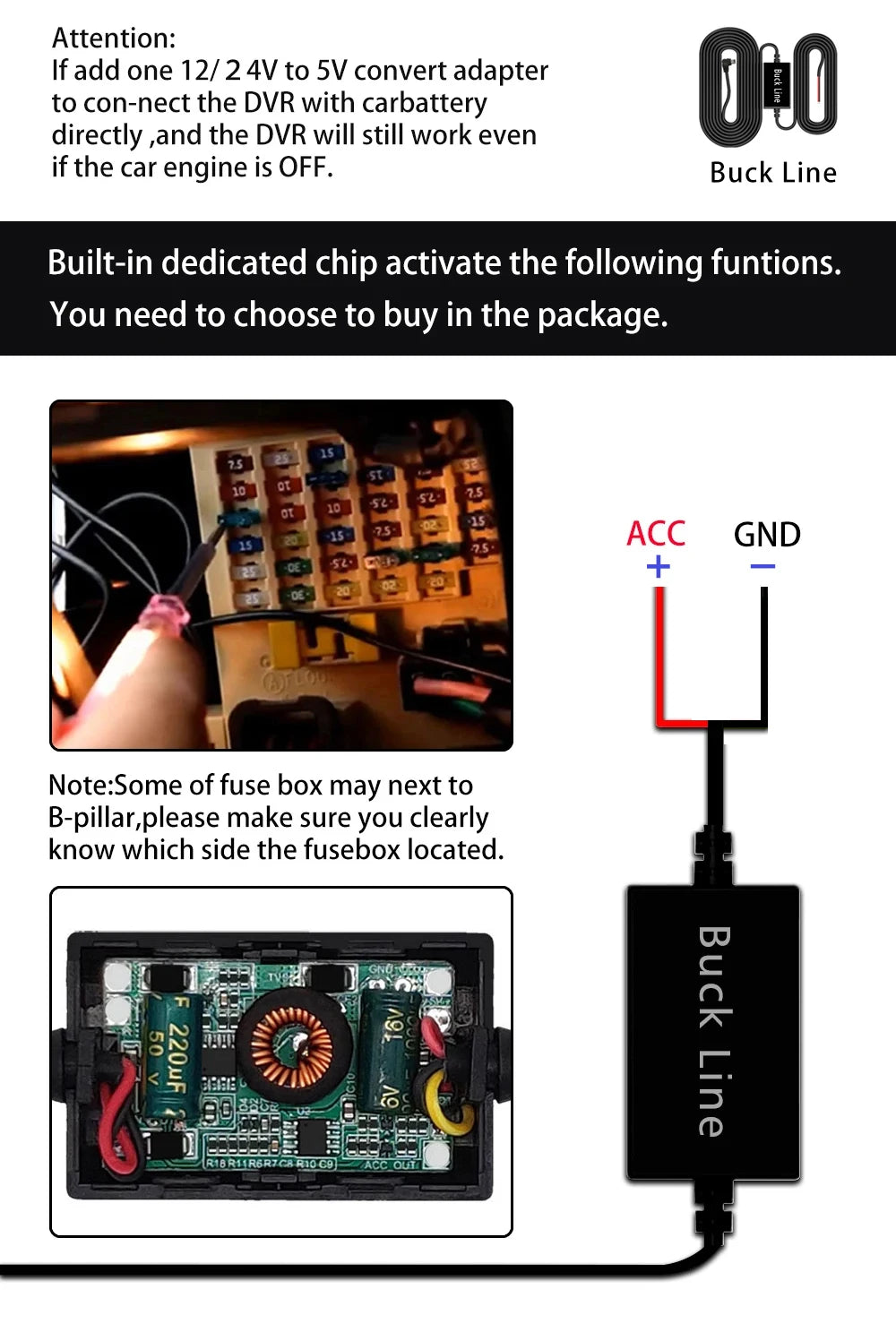 If you need the 24 hour parking monitoring function, you can order the corresponding Buck Line accessories to replace the car charger.Through Buck Line, the DVR power can be obtained directly from the car battery or car ACC, so that the DVR can maintain normal recording work even when the car is turned off.(Since different car models have different battery interfaces or ACC interfaces, it is not recommended to install it by yourself. It is recommended to find a professional to install the Buck Line.)