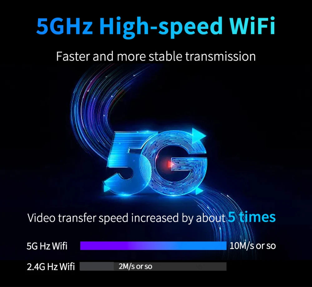 Equipped with built-in WiFi, it can be connected to a mobile phone, you can preview real-time images to view historical records and quickly download pictures. With the latest 5G Hz technology, the video transmission speed will be faster and smoother than the traditional 2.4G Hz.