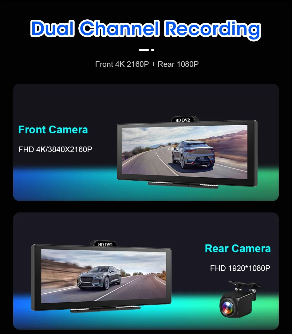 With Dual Camera Recording Function:A front-facing camera (built-in) with 4K 2160P resolution + A rear-facing camera (optional) with 1080P resolution.