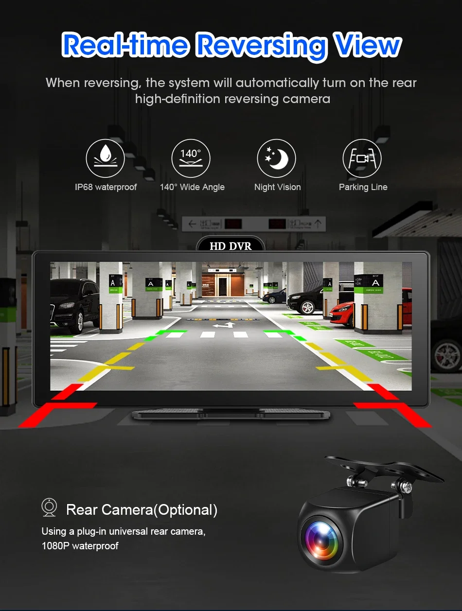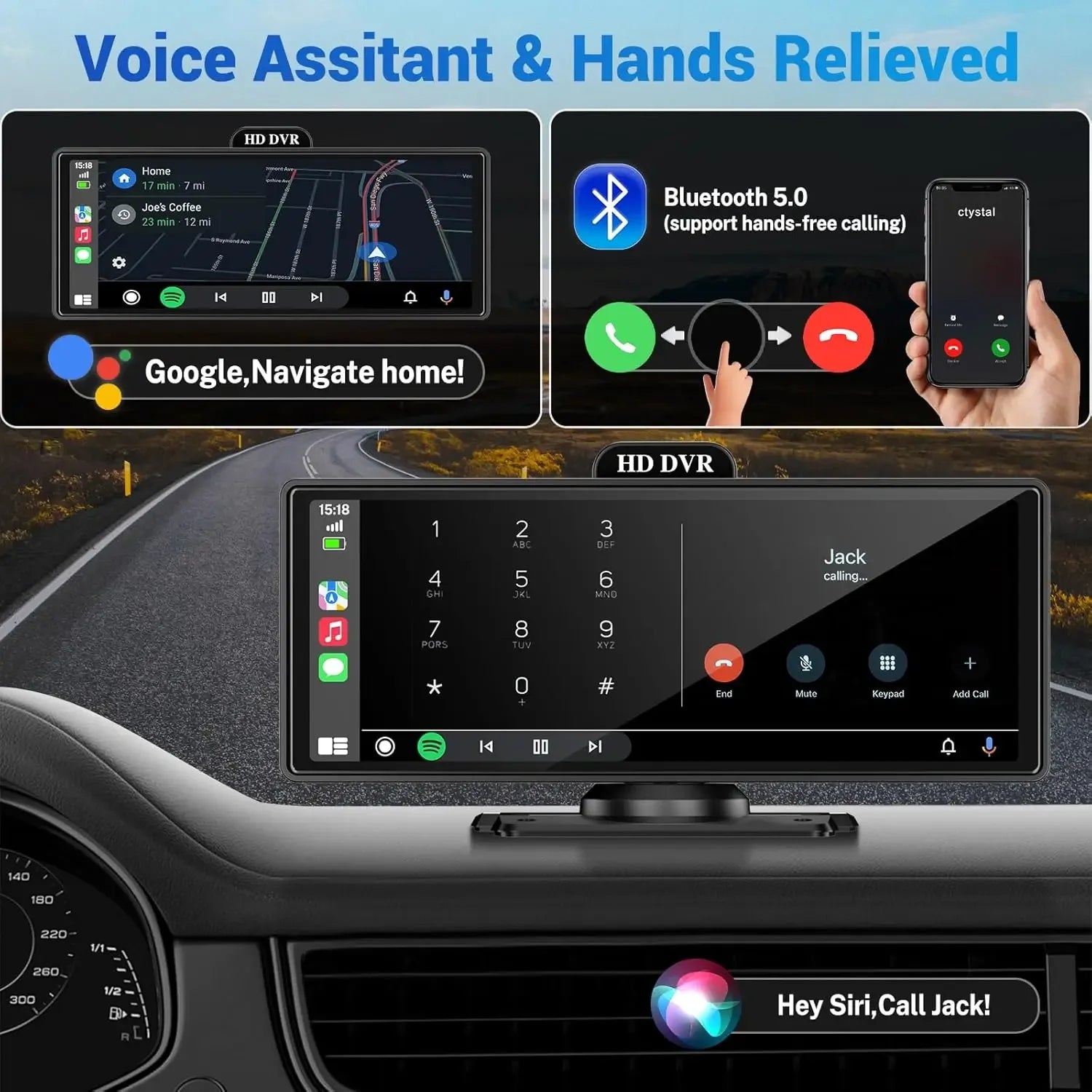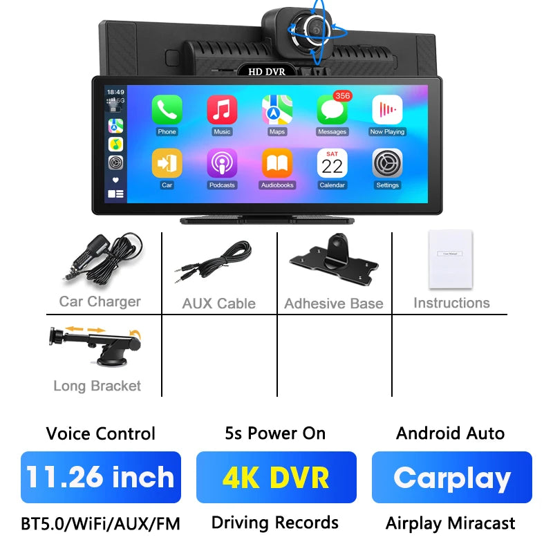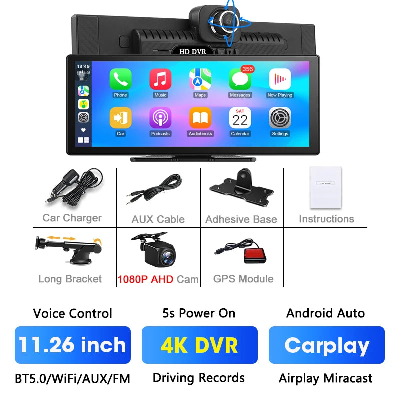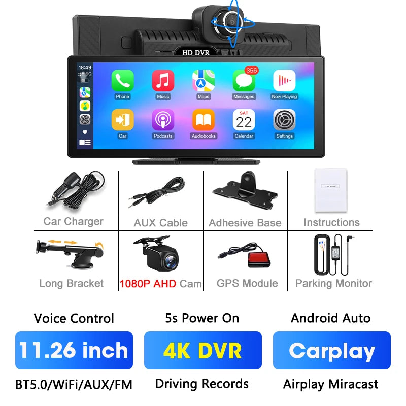 🚗【2025 Upgraded Portable Carplay 】Featuring an largest 11.26" touchscreen display, this Carplay Screen with the integration of both Carplay and Android Auto, you can access your smartphone's apps, maps, music, videos, and other features. the inclusion of mirror link, voice control, and Bluetooth functionality makes this unit a comprehensive solution for in-car entertainment and assistance. Additionally, the 4K dash cam is a valuable tool for video recording and safer reversing.