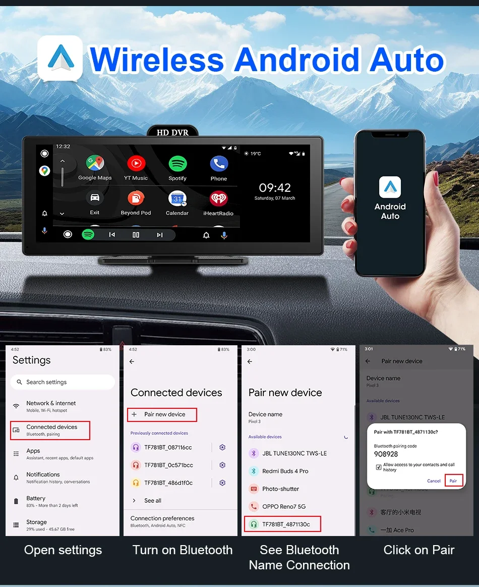 🚗【Wireless Carplay & Android Auto & Mirror Link】Effortlessly connect your smartphone wirelessly to carplay and Android Auto for easily make /answer phone calls, listen to music, navigation, integrating smart voice control. With AirPlay & Android Cast, achieve seamless screen mirroring using mirror link. Our Portable Carplay is perfect for road trips, and staying connected on the go. Just connect once and the screen will automatically connect each time you get in your car.