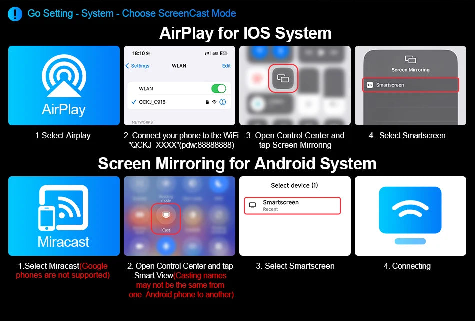 Miracast:Directly Connect it,No Need to Download APP,Not support Google mobile phone.