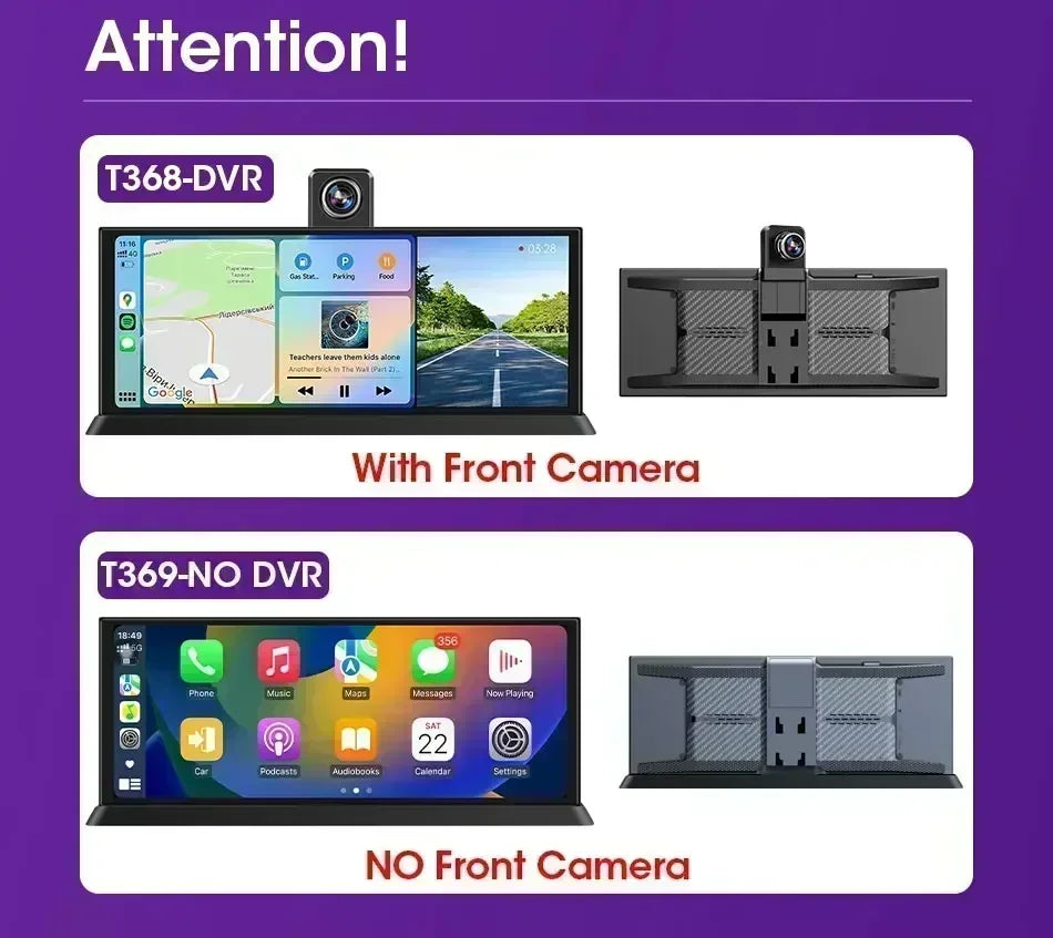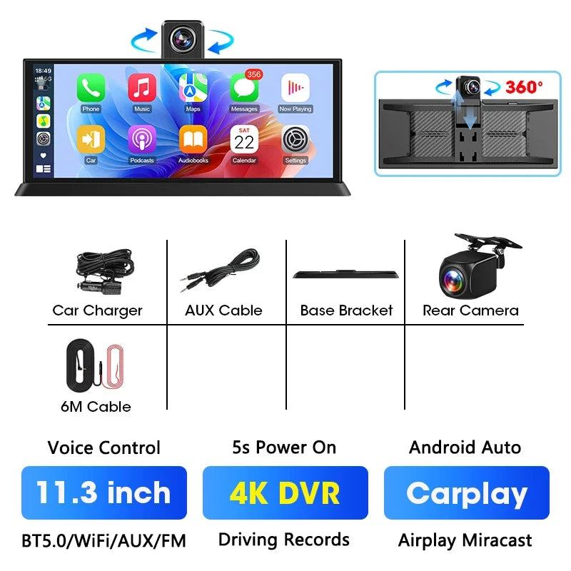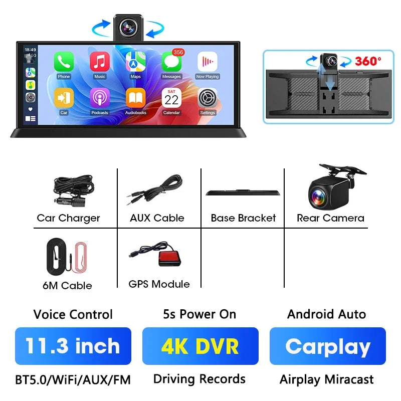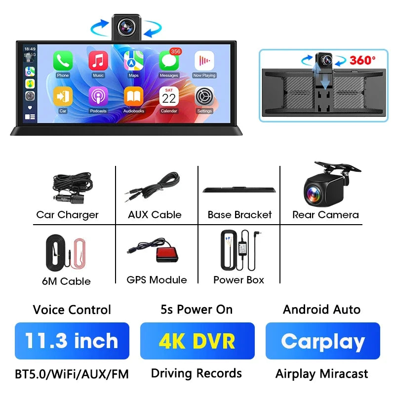 2.The T368 is a 11.3-inch large screen with a 4K 360 ° rotation front facing lens, support 1080P rearview camera(Need to Purchase).