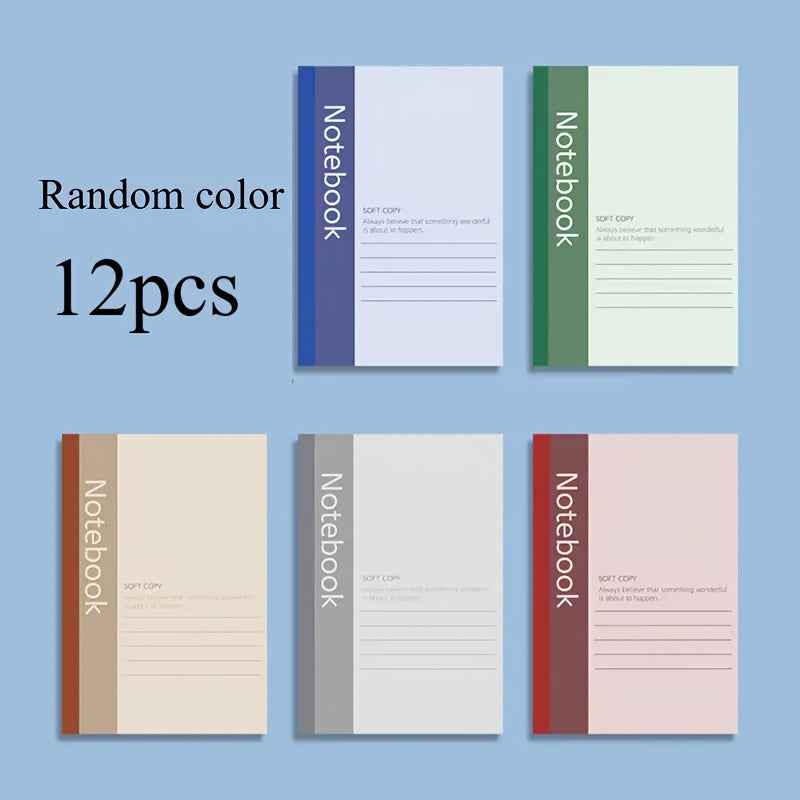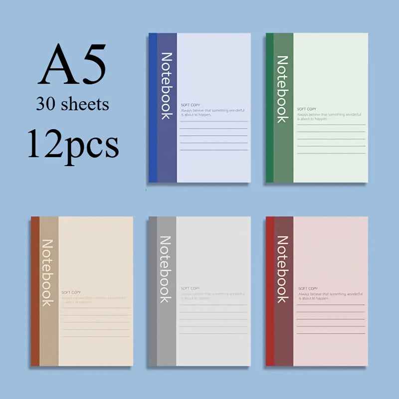 12 quaderni A5, 30 pagine ciascuno, Colori assortiti (Blu, Verde, Arancione, Rosso, Grigio, Viola), Design semplice con pagine rigate per studenti, scuola e ufficio, Quaderni carini per la scuola