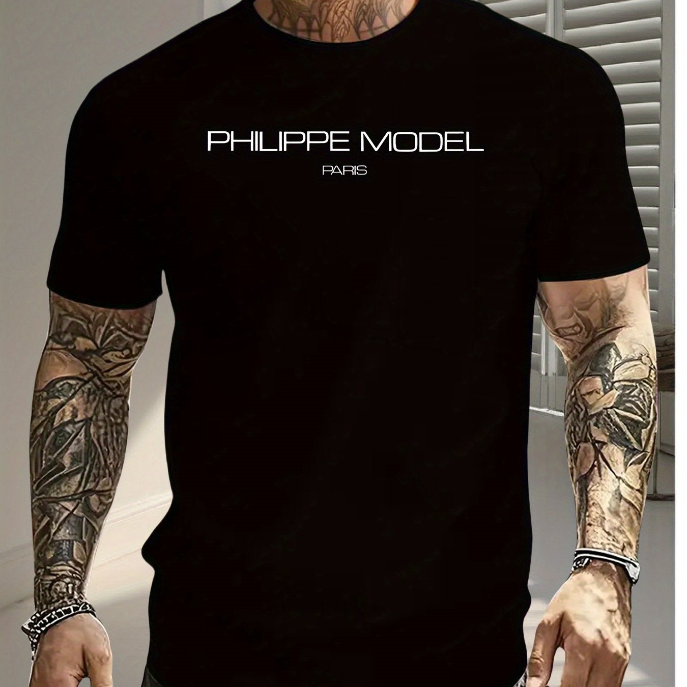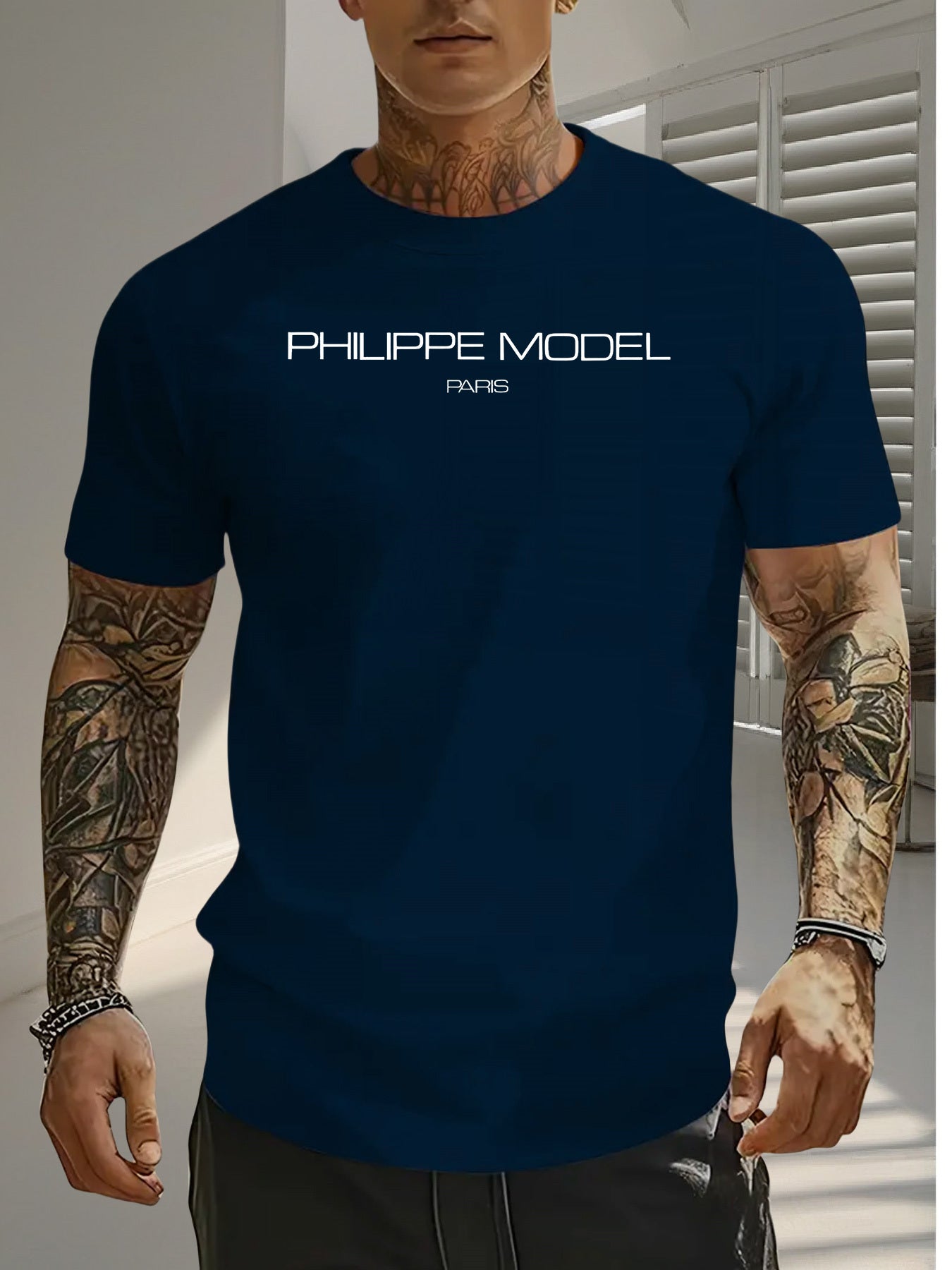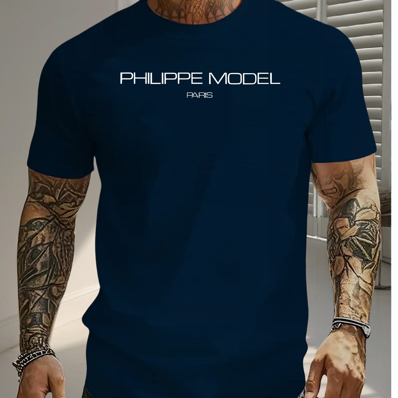 1pz T-shirt casual estiva da uomo - Stampa "PHILIPPE", scollo a giro, manica corta, vestibilità regolare, tessuto leggermente elasticizzato, motivo geometrico, blu navy, perfetto per attività all'aperto per adulti