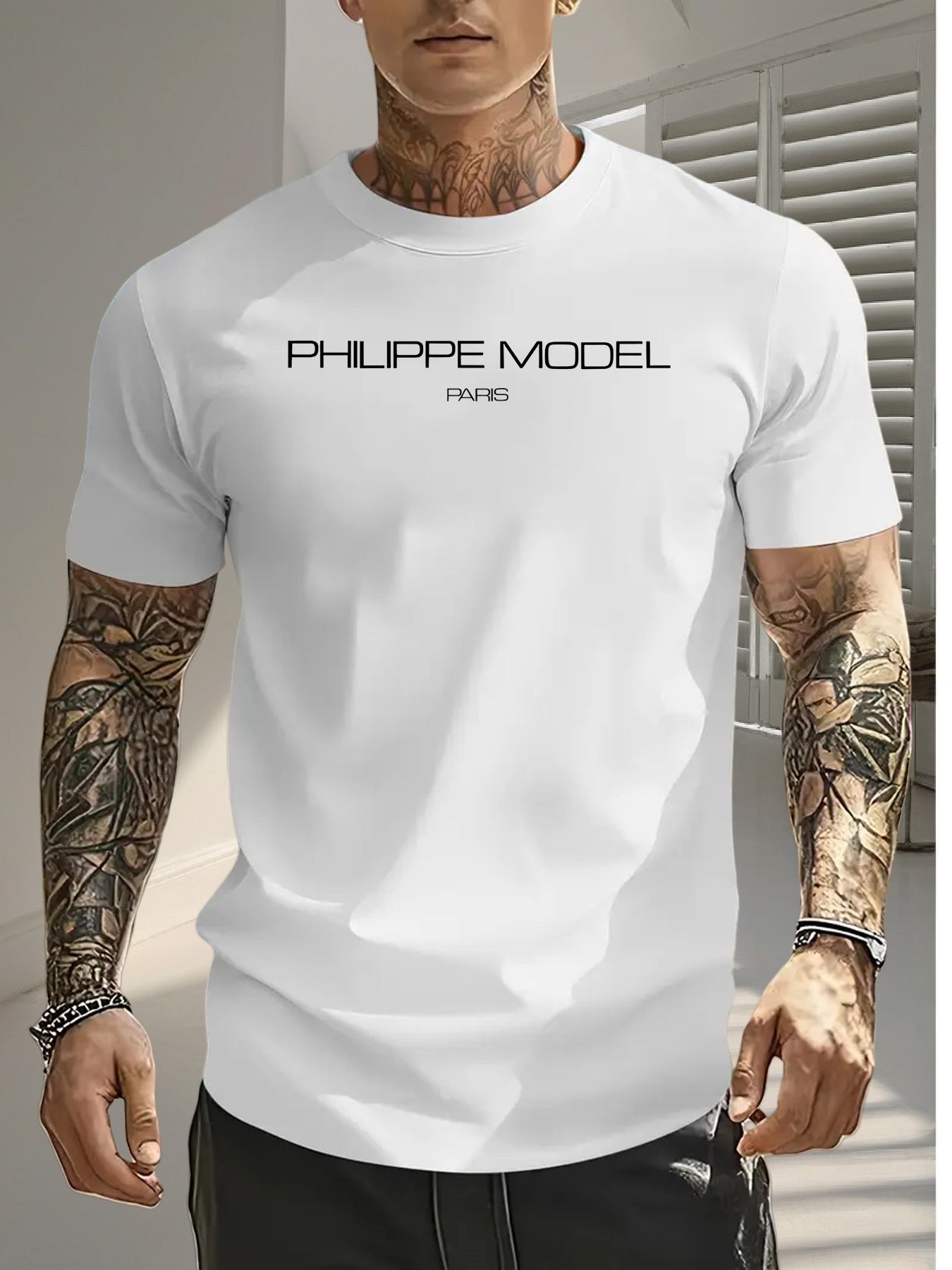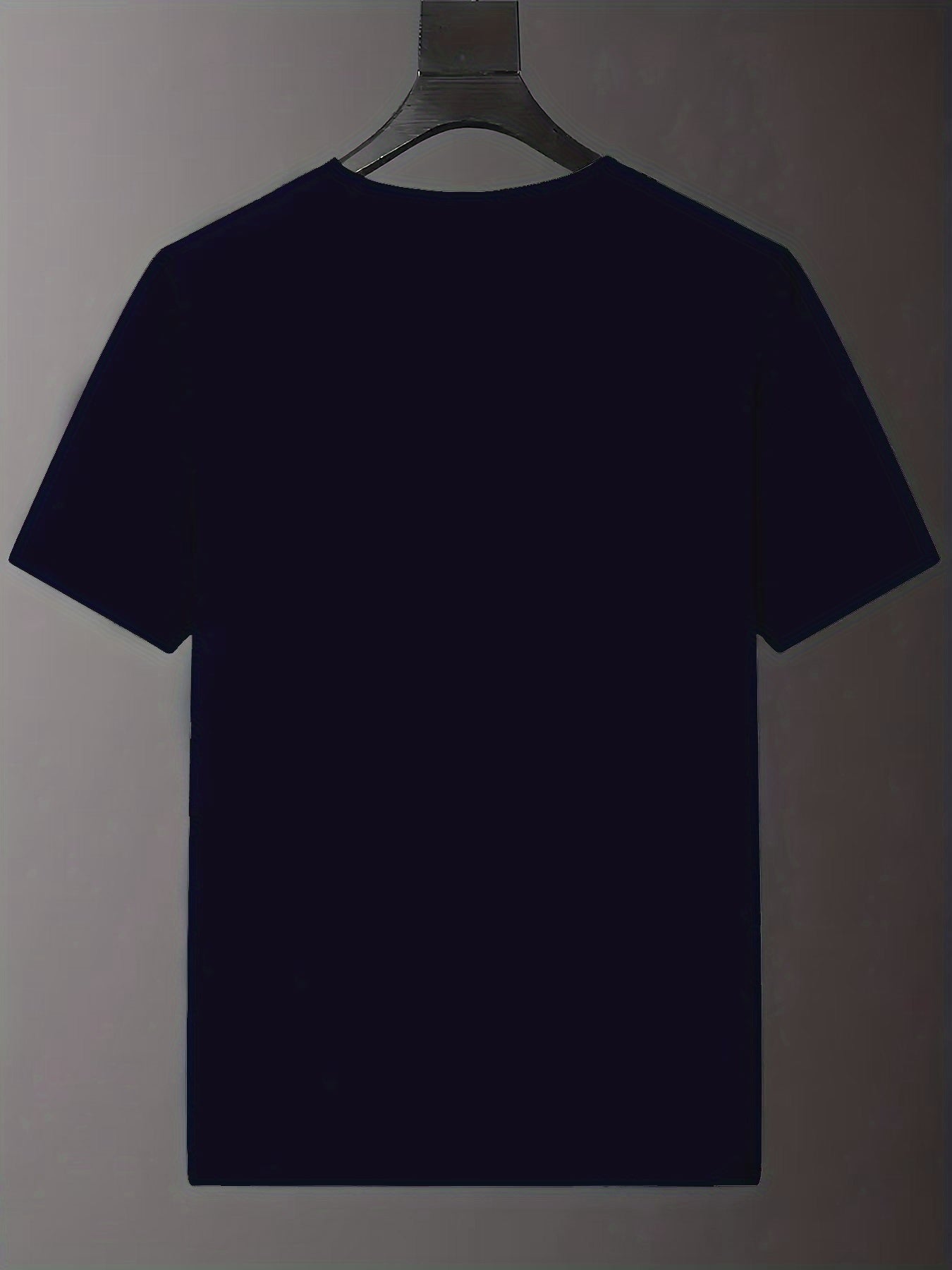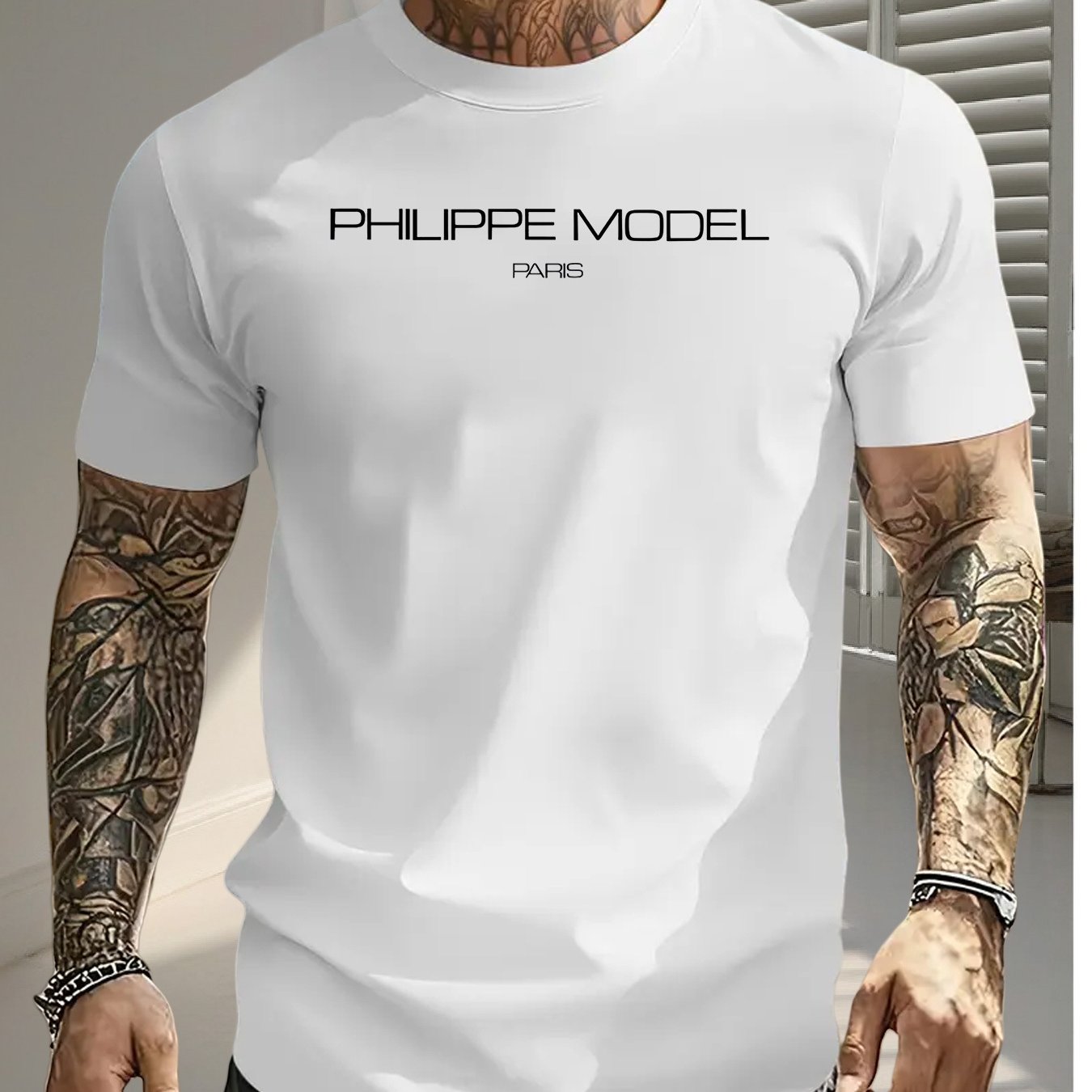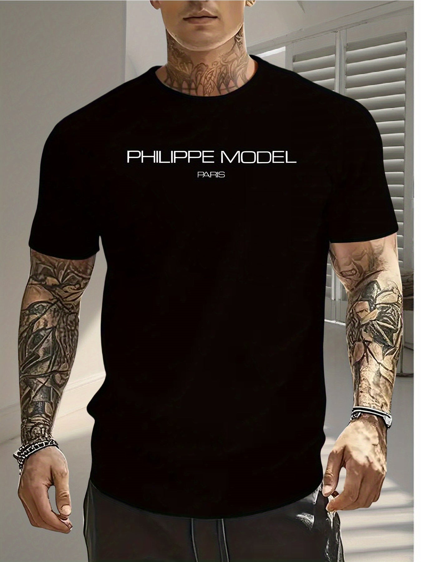 1pz T-shirt casual estiva da uomo - Stampa "PHILIPPE", scollo a giro, manica corta, vestibilità regolare, tessuto leggermente elasticizzato, motivo geometrico, blu navy, perfetto per attività all'aperto per adulti