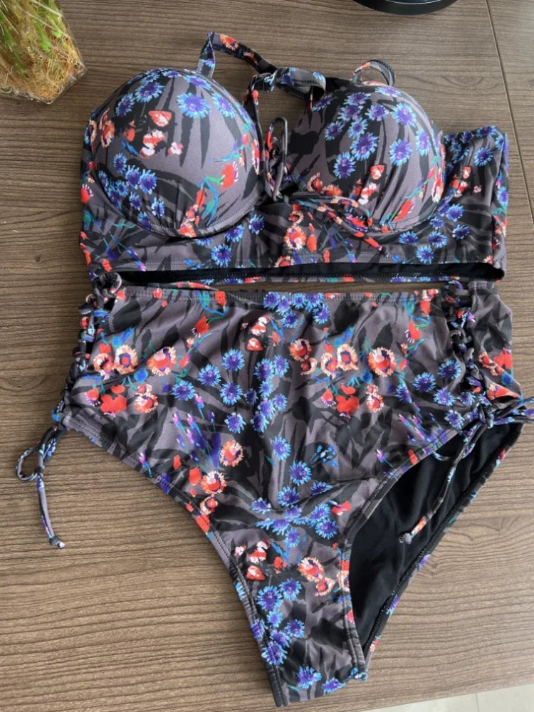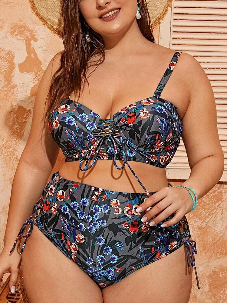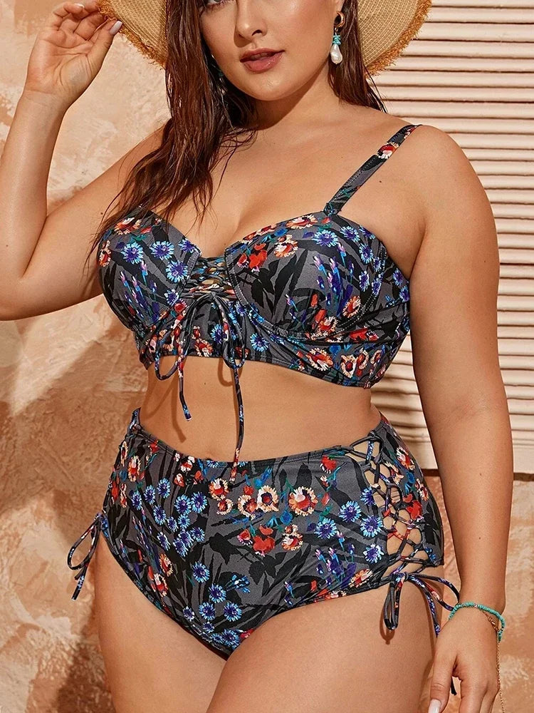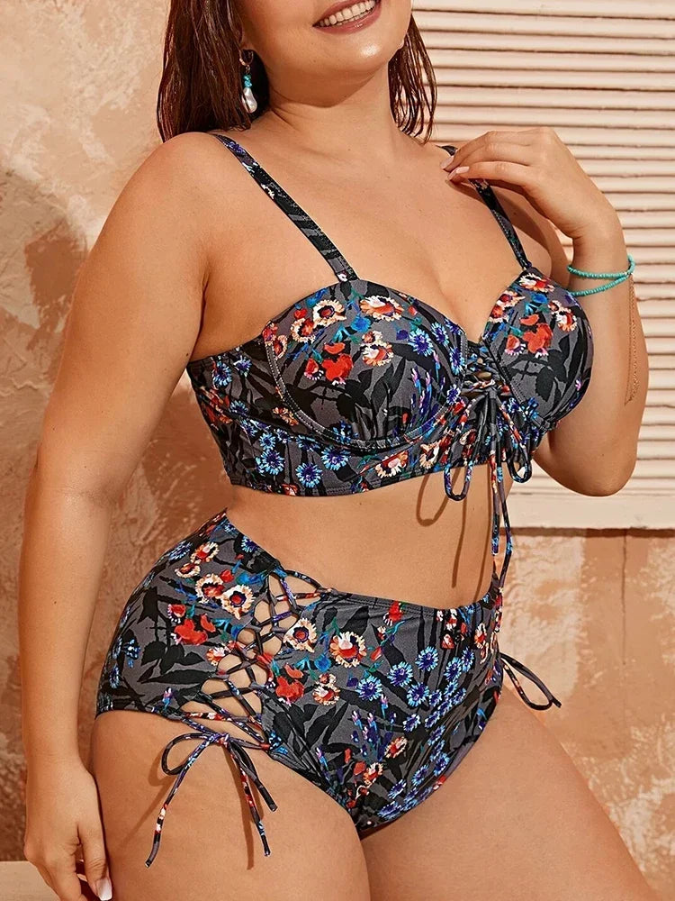 2025 New Cut Out Women Swimsuit Laced Up High Waist Bikini Sets Push Up Underwire Swimwear 4XL Large Size Bathing Suit Mujer