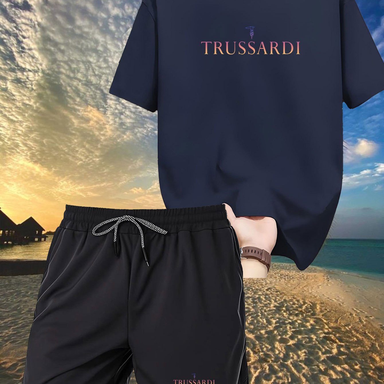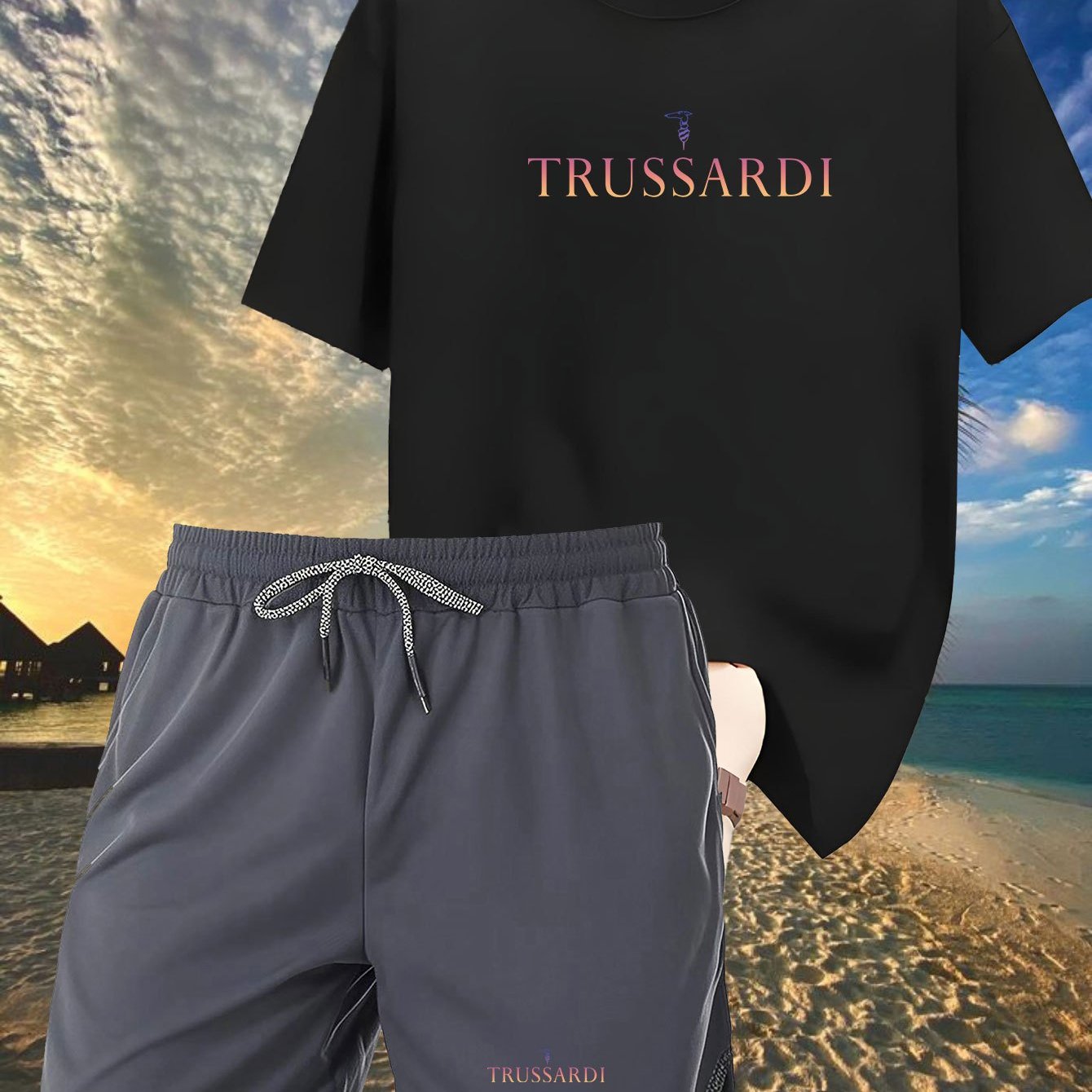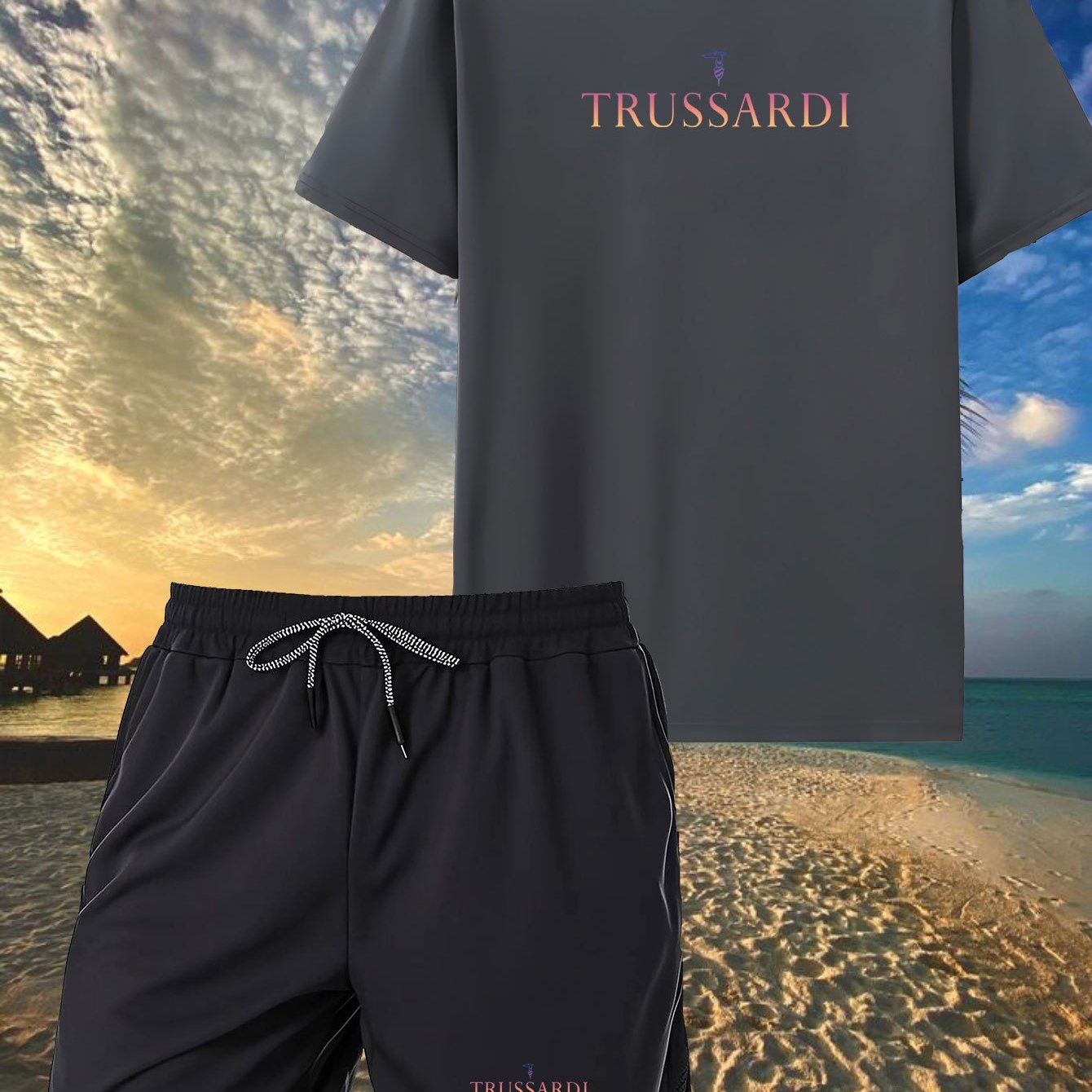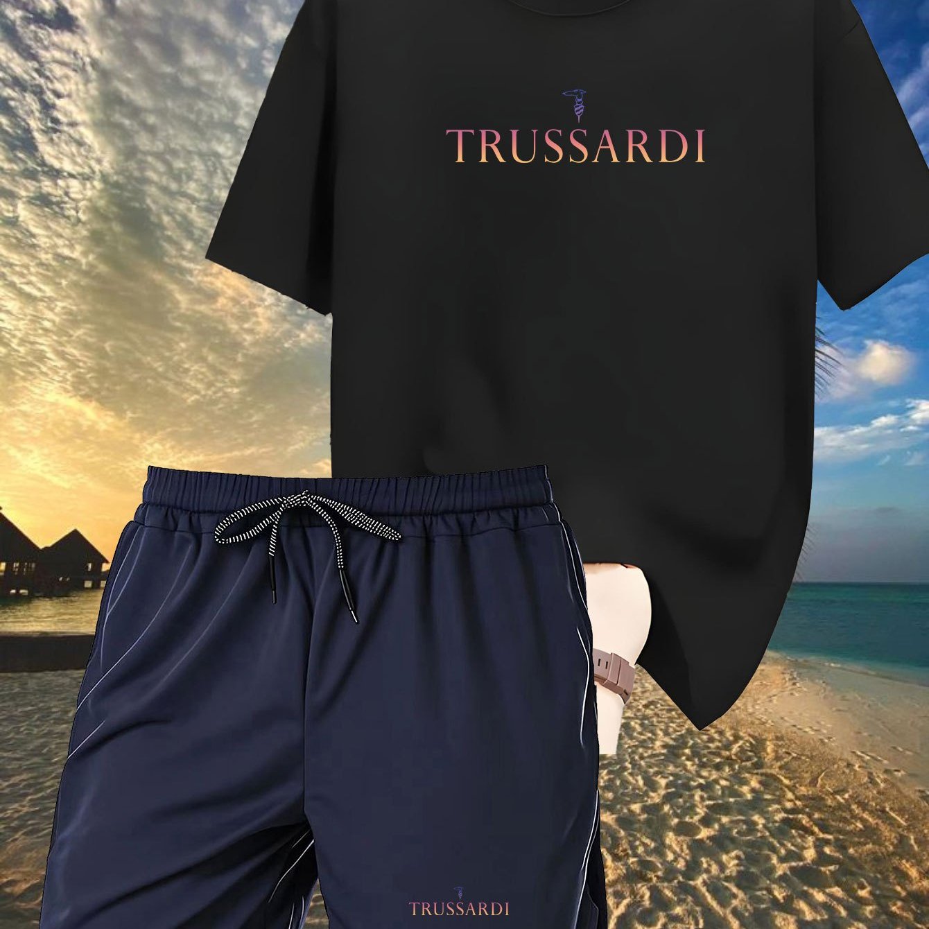 2025 Set di T-Shirt e Shorts da Uomo con Stampa - Grafica "TRUSSARDI", Comfortabile Misto di Poliestere, Abbigliamento da Spiaggia Casual con Vita con Coulisse, Perfetto per l'Abbigliamento Quotidiano o Regali, Abbigliamento da Spiaggia