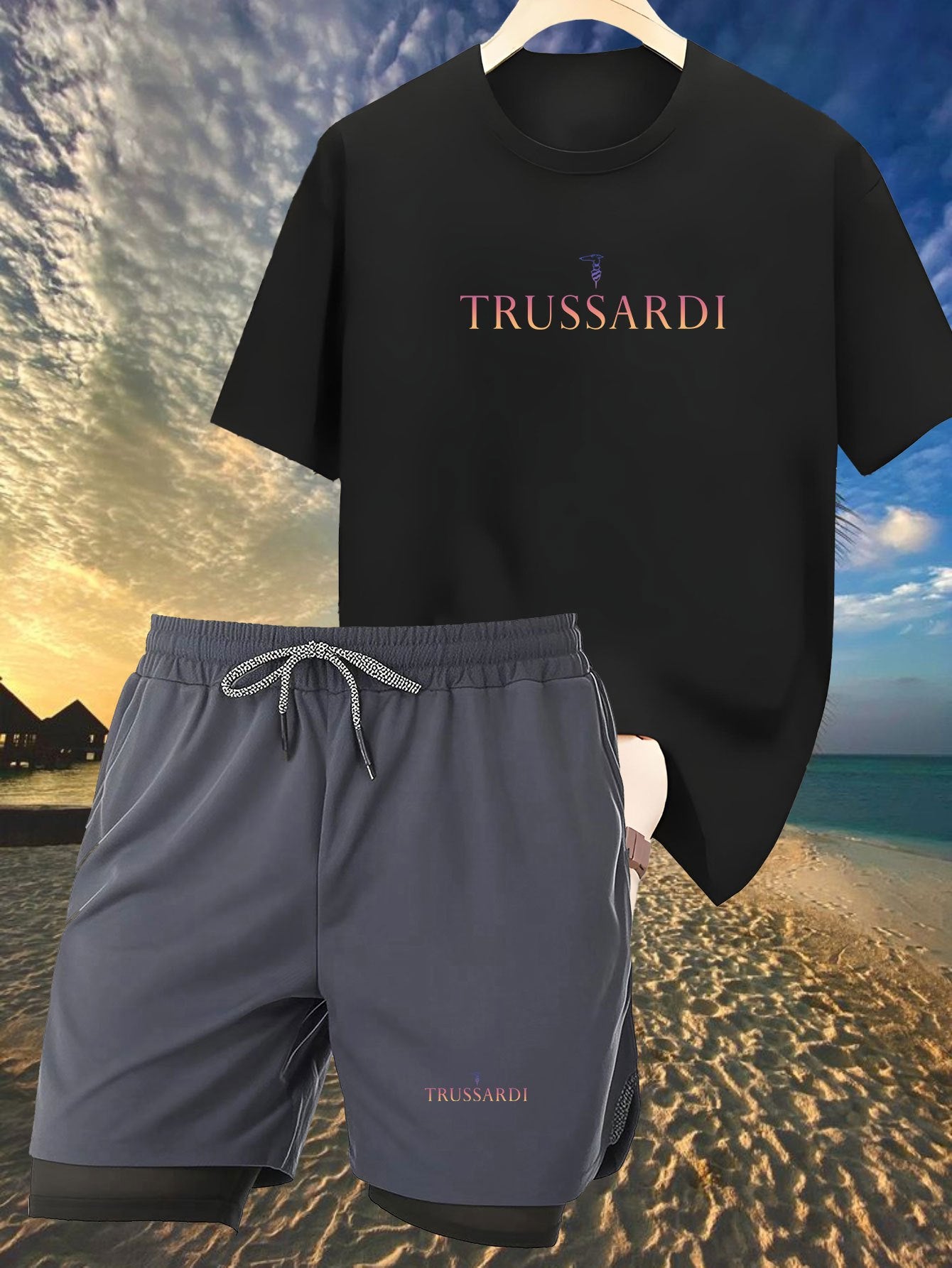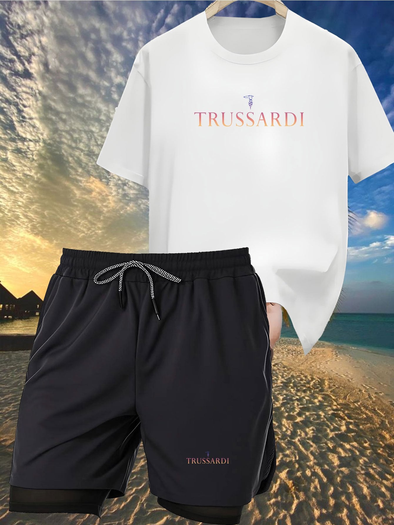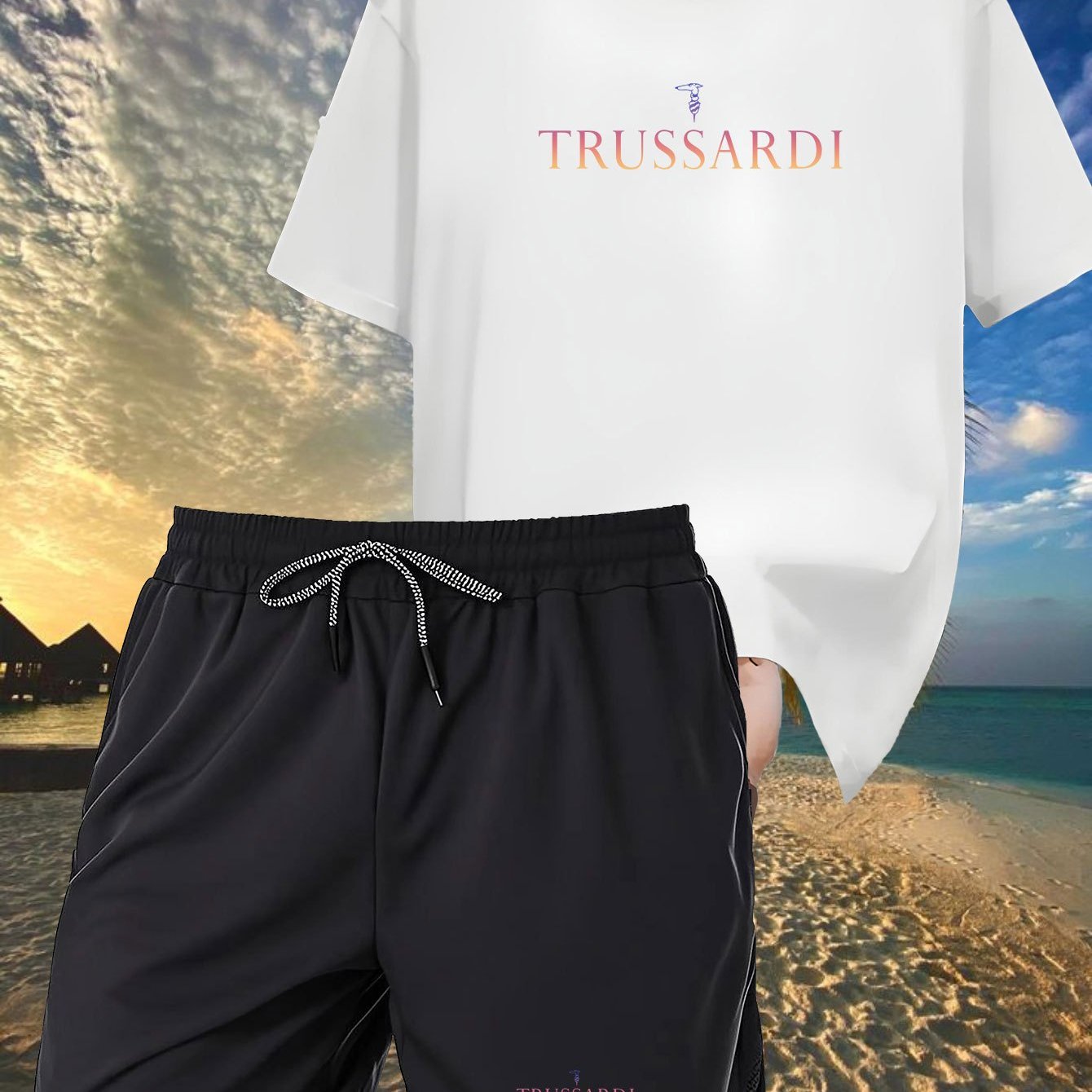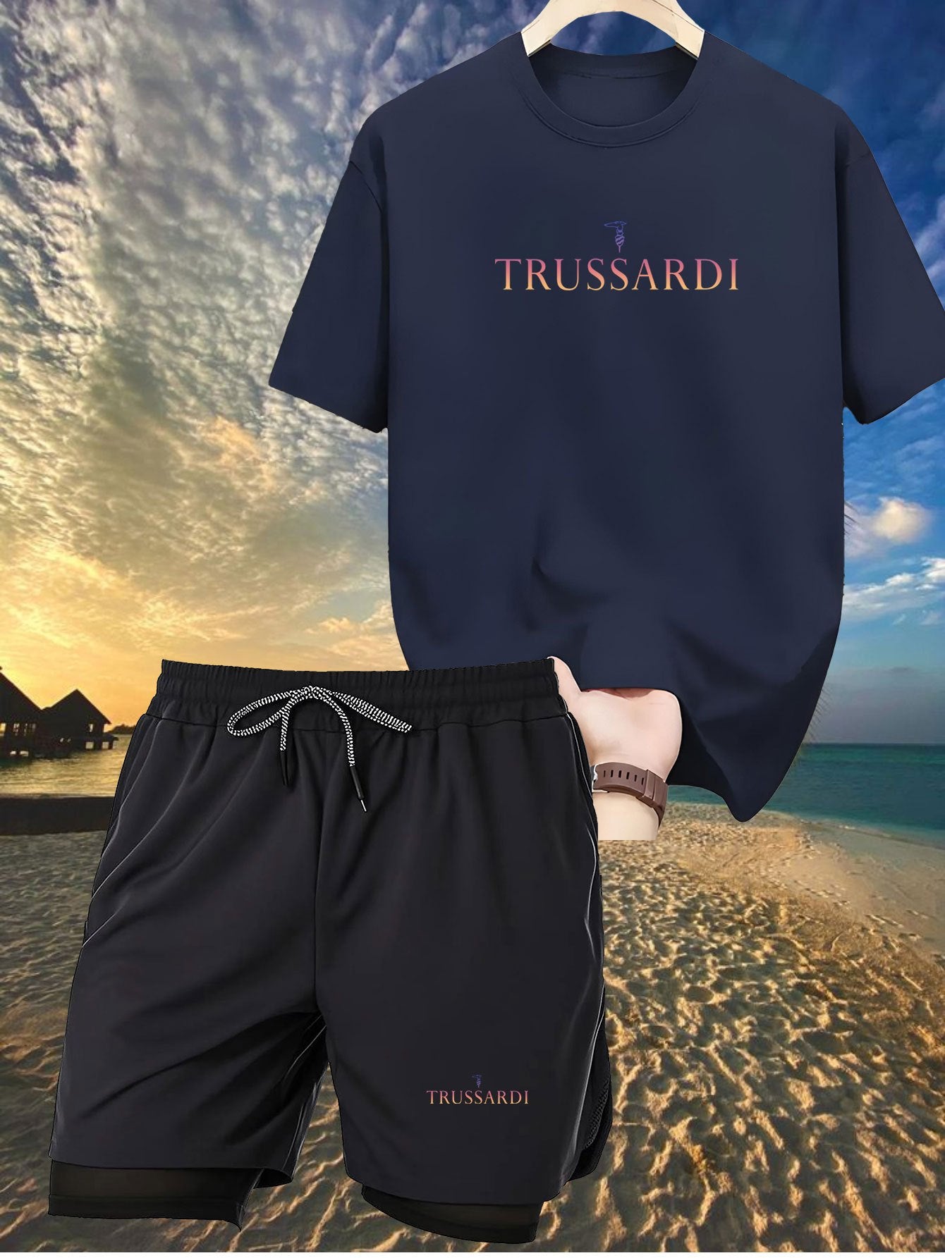2025 Set di T-Shirt e Shorts da Uomo con Stampa - Grafica "TRUSSARDI", Comfortabile Misto di Poliestere, Abbigliamento da Spiaggia Casual con Vita con Coulisse, Perfetto per l'Abbigliamento Quotidiano o Regali, Abbigliamento da Spiaggia
