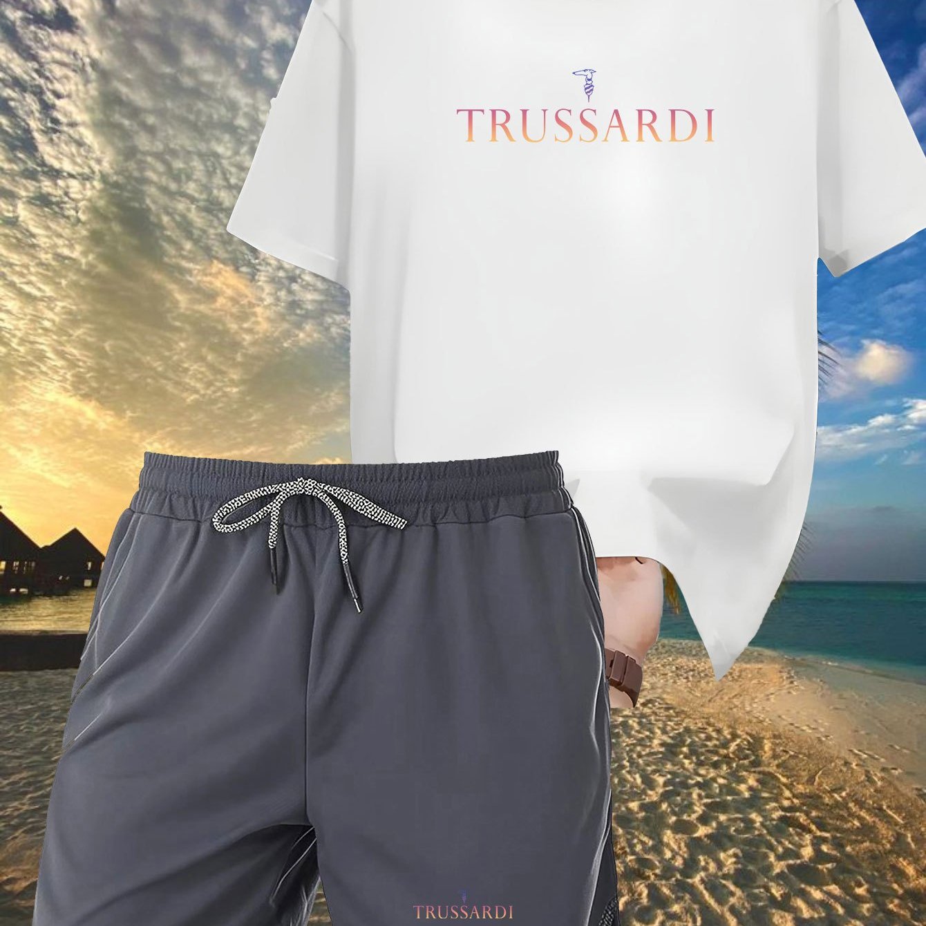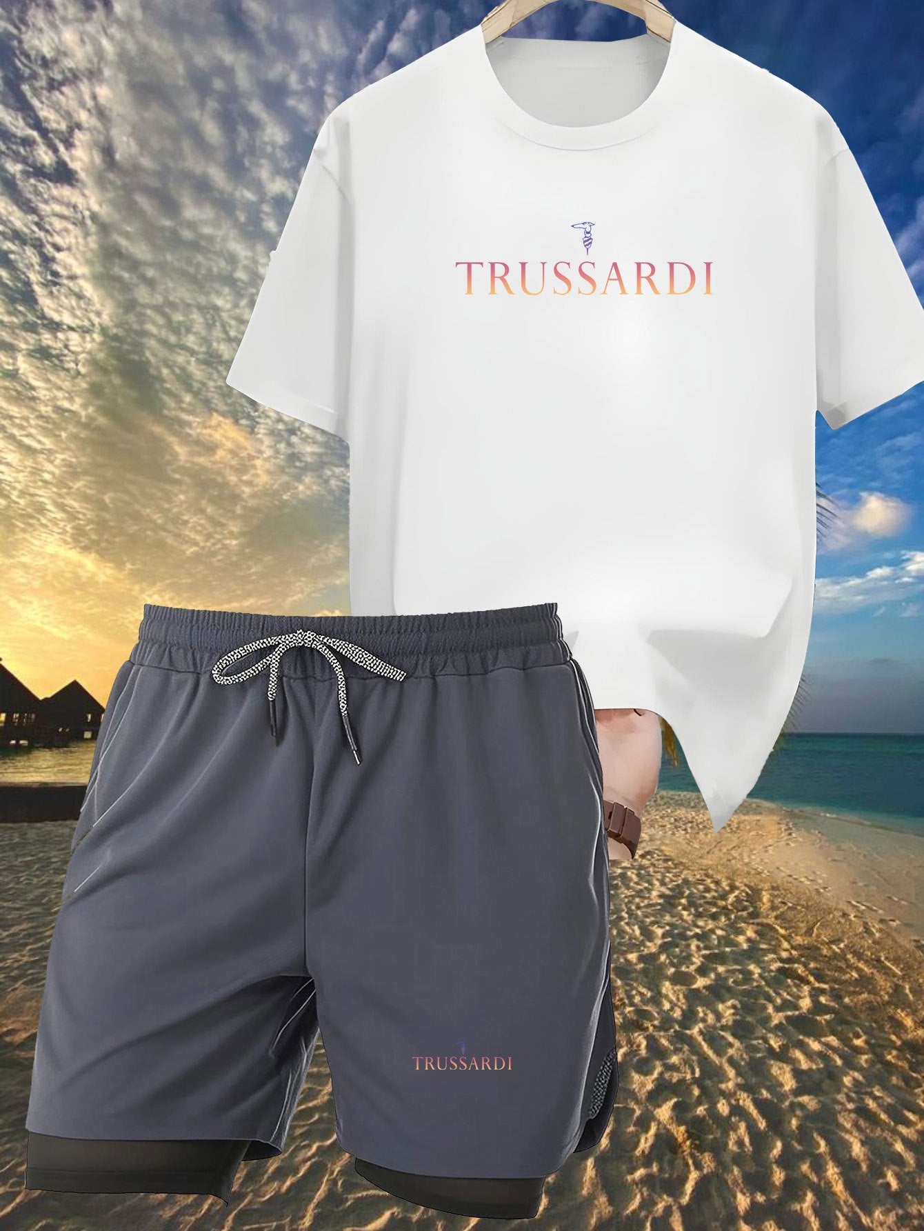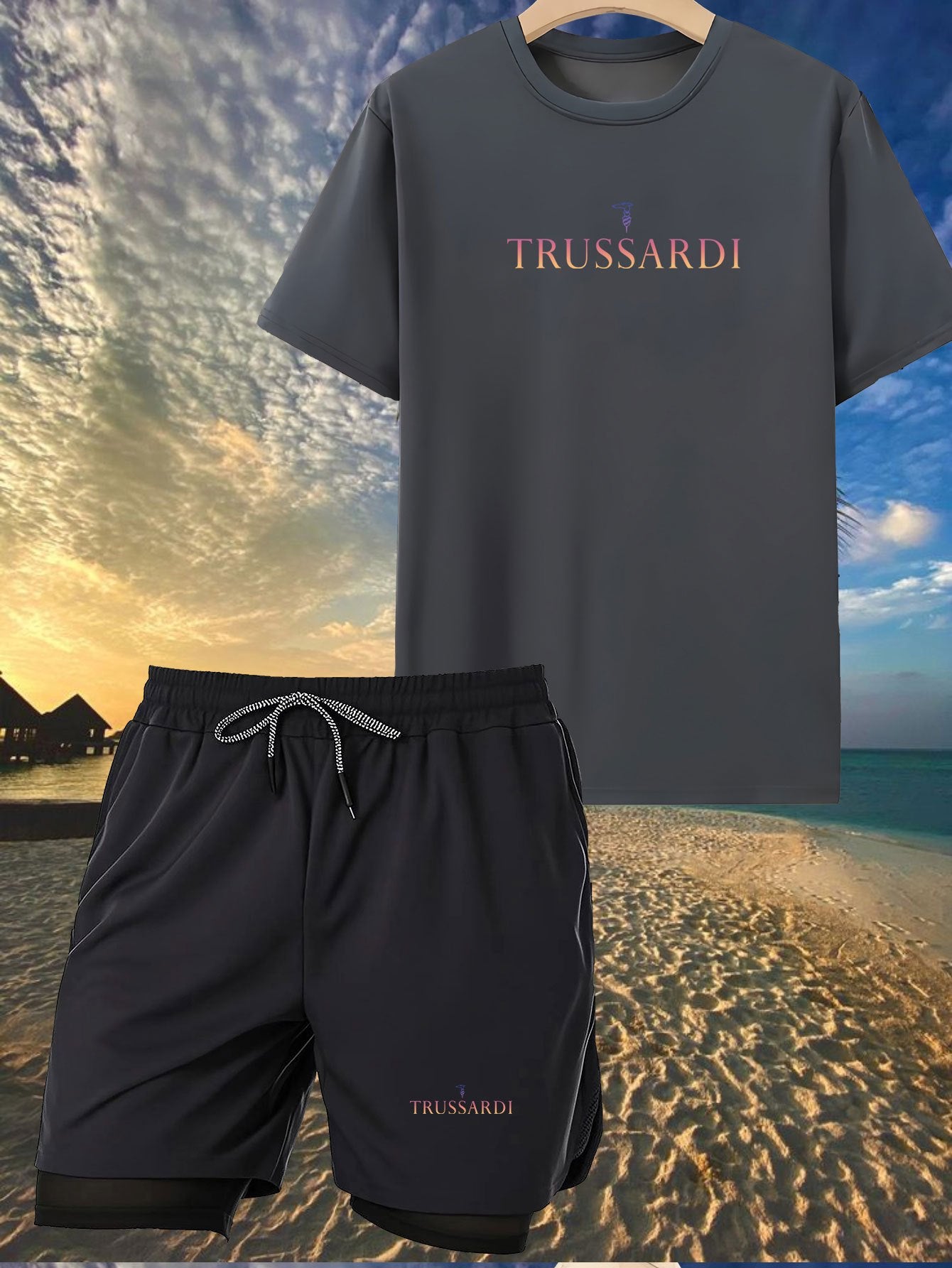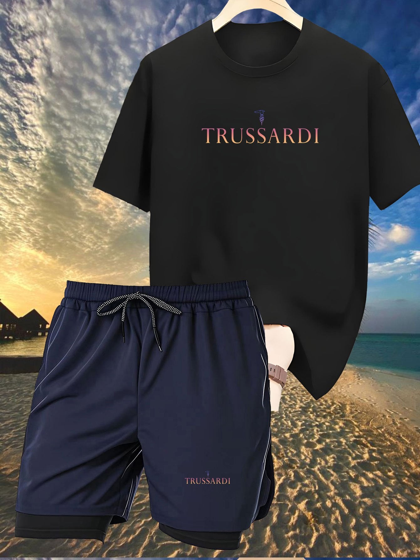 2025 Set di T-Shirt e Shorts da Uomo con Stampa - Grafica "TRUSSARDI", Comfortabile Misto di Poliestere, Abbigliamento da Spiaggia Casual con Vita con Coulisse, Perfetto per l'Abbigliamento Quotidiano o Regali, Abbigliamento da Spiaggia