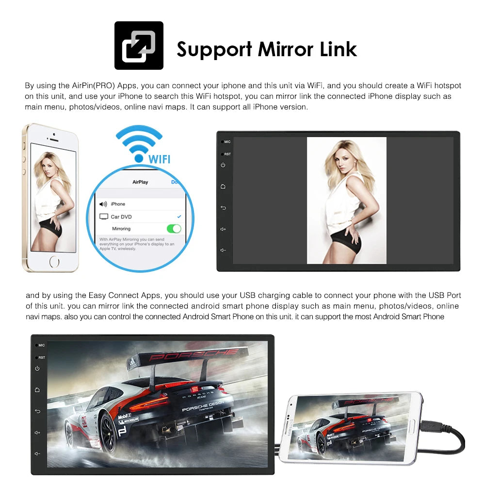 1G RAM 16G ROM Carplay & 2G RAM 16G ROM Carplay: AD7003CP with 1*ISO Cable,1*RCA Cable with 9 wires(supports Video Output),1*CAM-VIN wire,1*External Mic,2*USB wire,1*GPS Antenna,1 sets Metal Bracket,1*Front plastic frame.