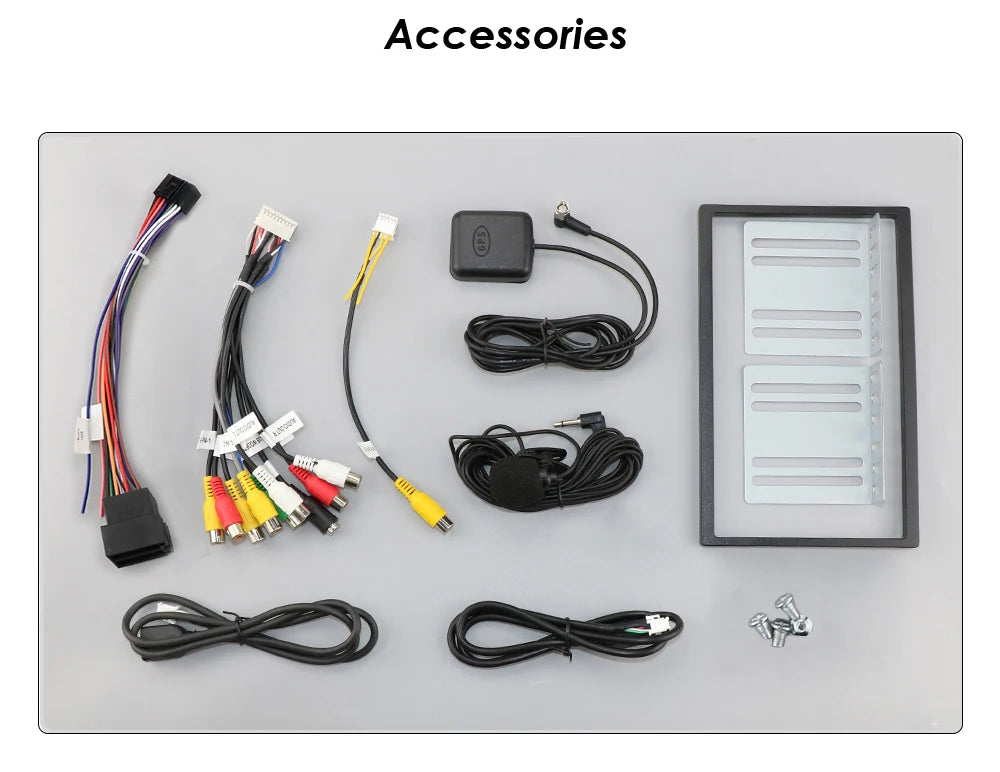 1G RAM 16G ROM NOCarplay & 2G RAM 16G ROM NOCarplay : AD7003 with 1*Wire Harness Cable,1*RCA Cable with 4 wires(not supports Video Output),1*CAM-VIN wire,Not includes External Mic,2*USB wire,1*GPS Antenna,1 sets Metal Bracket,1*Front plastic frame.