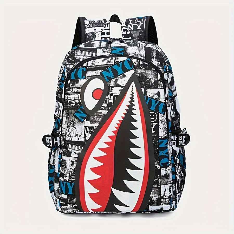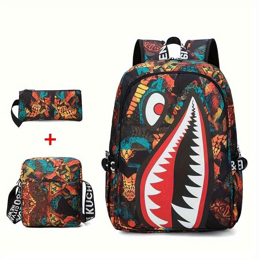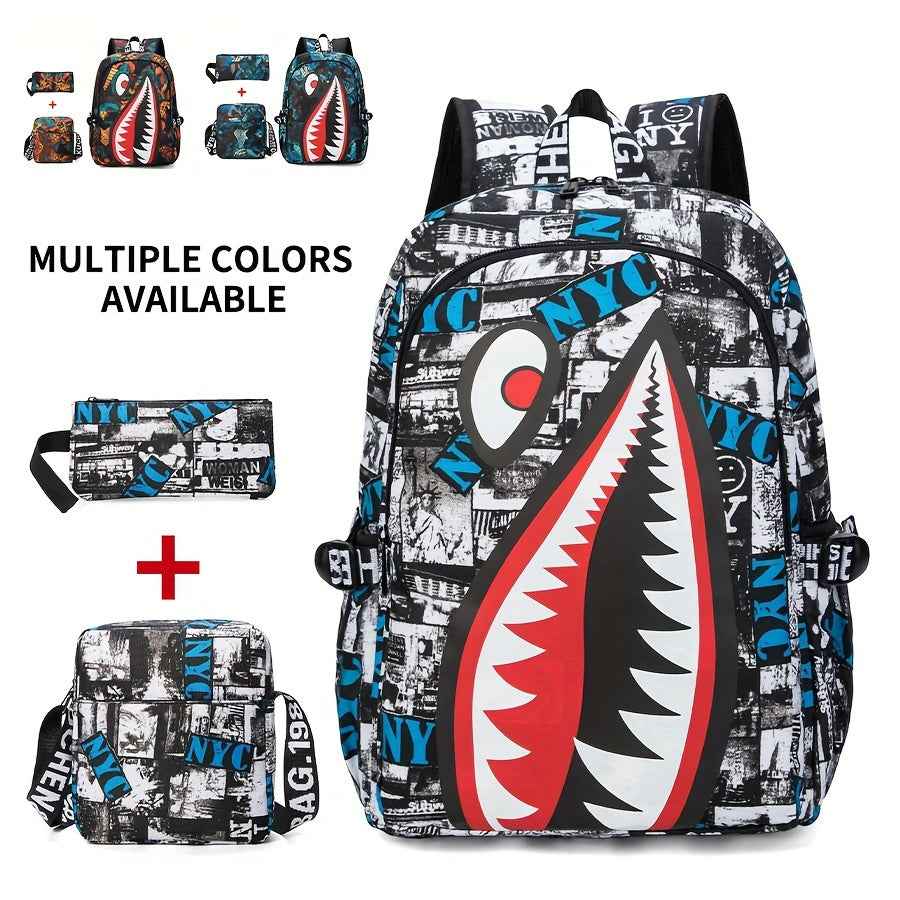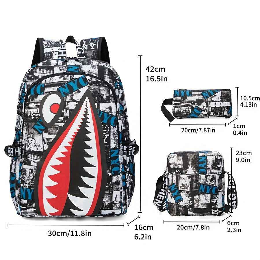 3 Pezzi Set di Borsa a Spalla, Tracolla e Astuccio - Zaino Campus Grande Capacità con Stampa Squalo per la Stagione del Ritorno a Scuola Unisex