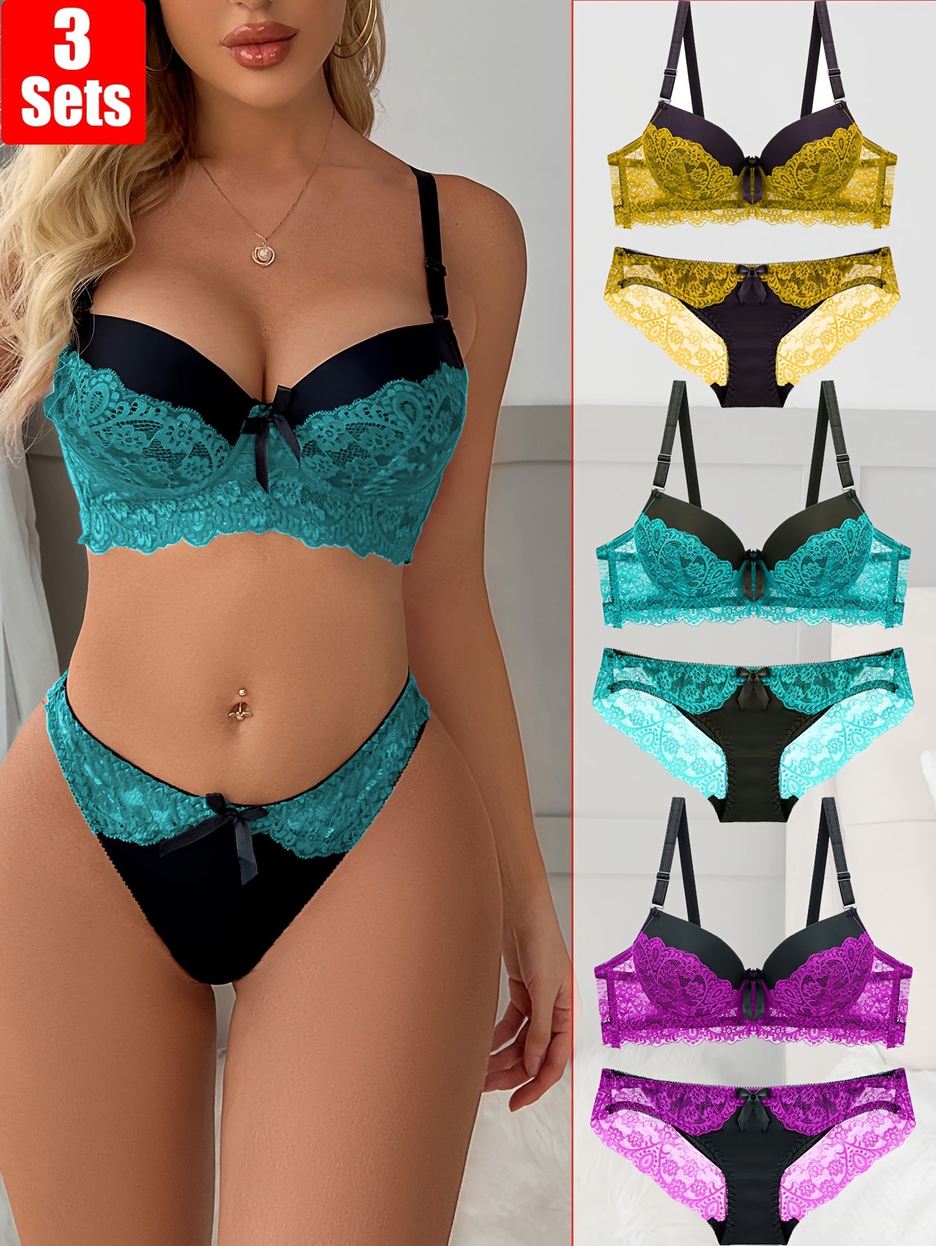 3 Set di Push-Up a Maglia a Blocchi di Colore Francese per Donne, Set di Reggiseno e Mutandine, Lingerie a Vita Alta e Comoda con Scollatura Profonda