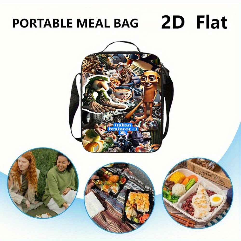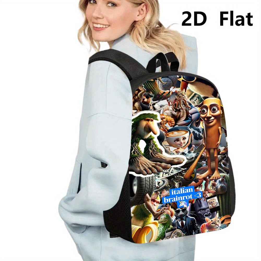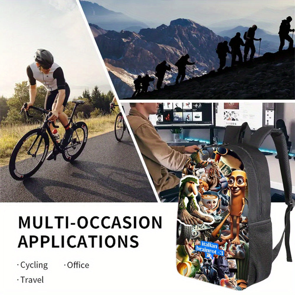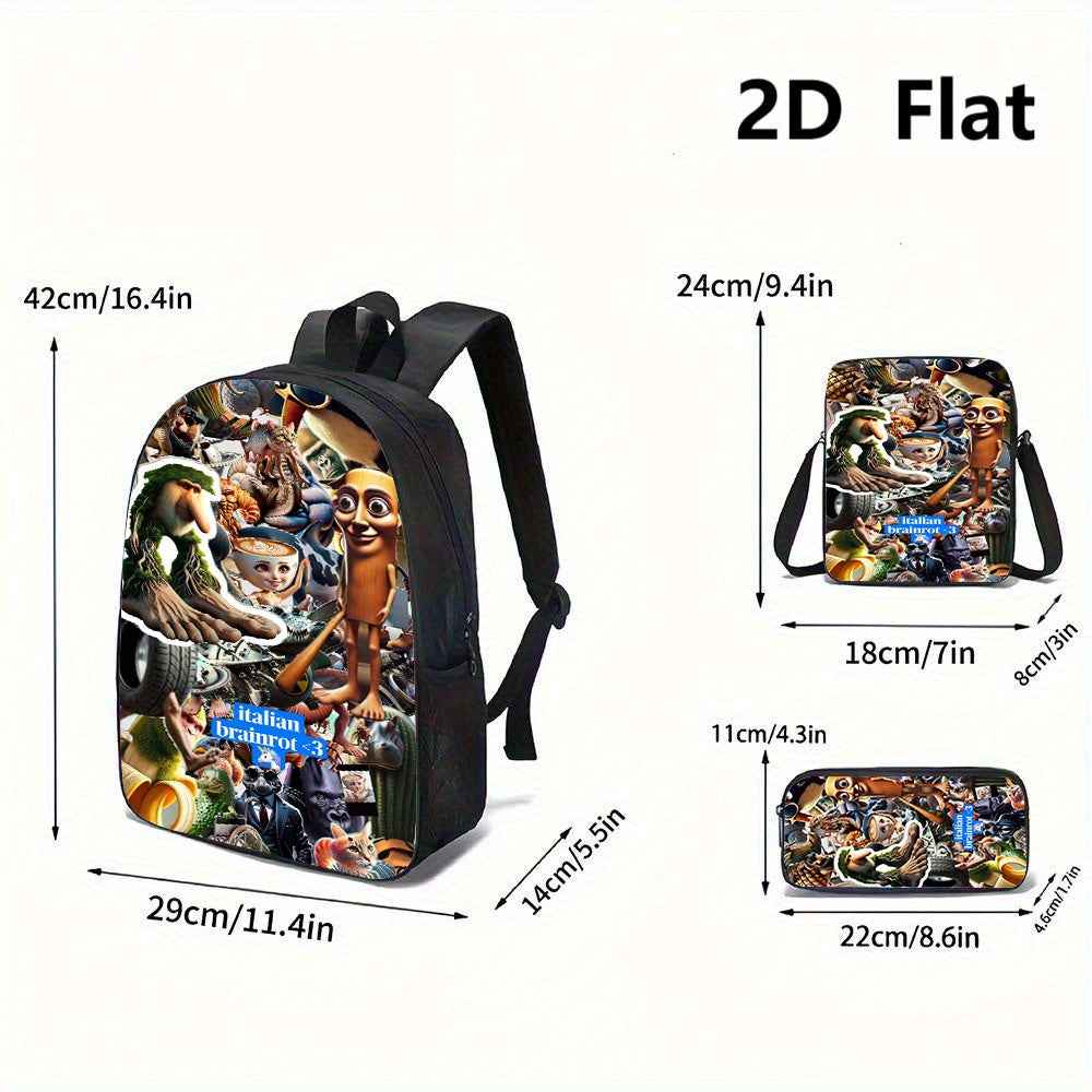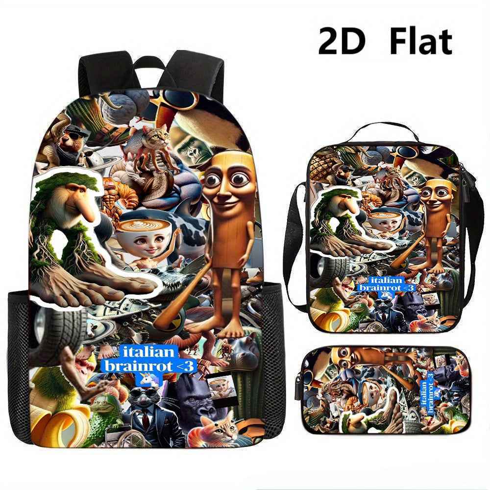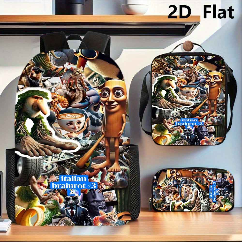 3pezzo Italian Brainrot 3 Set di zaini tematici - Zaino casual di grande capacità, borsa per matite e scatola per il pranzo con cinghie regolabili per le spalle, resistente e elegante per viaggi, pendolarismo, vacanze, ritorno a scuola, zaino per viaggi,