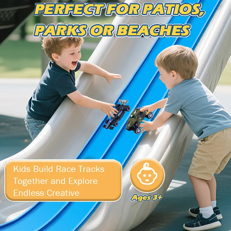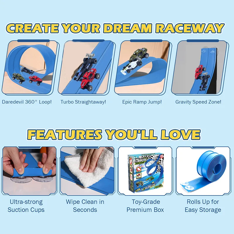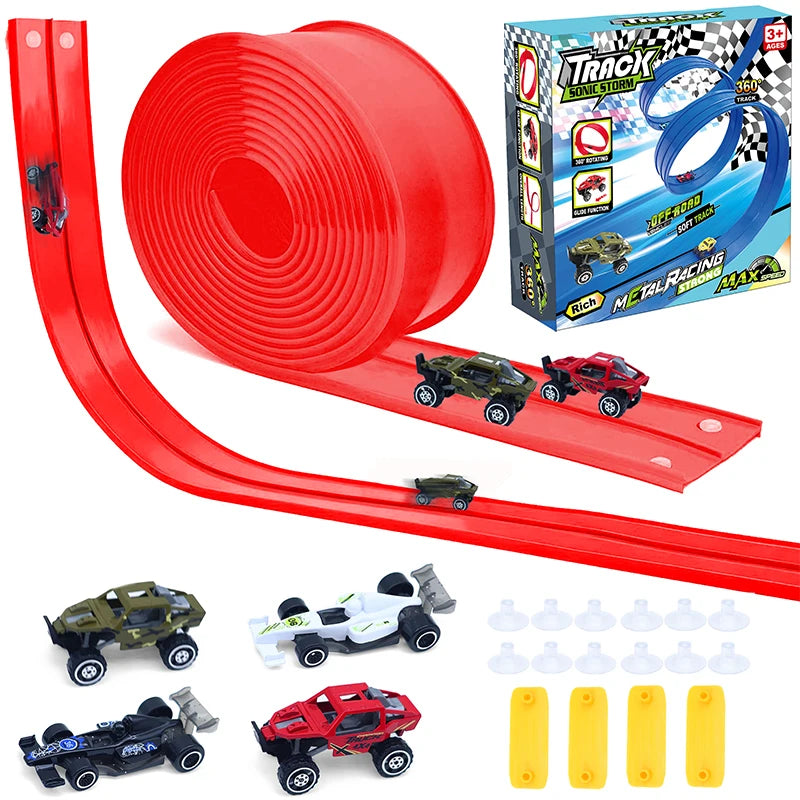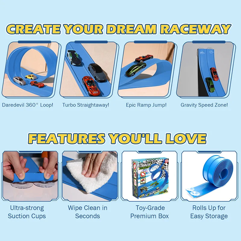 Dì addio ai tradizionali piste da corsa!La nostra pista flessibile per auto consente ai bambini di costruire rampe ripide, cadute elettrizzanti, curve strette e cinghie ad alta velocità per un'eccitazione da corsa senza fine.Questo binario portatile ultra flessibile (4,5 metri), 4 piccole auto da corsa, 4 connettori e 12 ventose per sfidare la gravità e stimolare la creatività.Ruota, avvolgi e invia le auto che tuffano per sfide con il cuore!