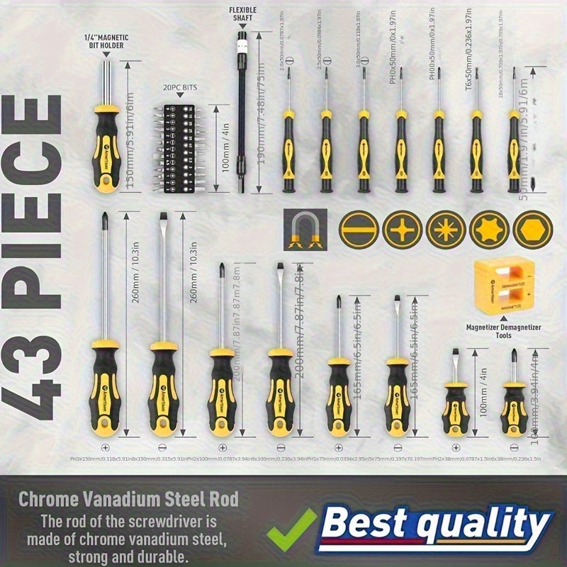 43 pz, set di cacciaviti professionale e versatile con portapunte magnetico - acciaio al cromo vanadio, include punte a taglio, Phillips, esagonali, Torx e strumenti di precisione - kit di strumenti di riparazione durevoli per fai da te e uso industriale