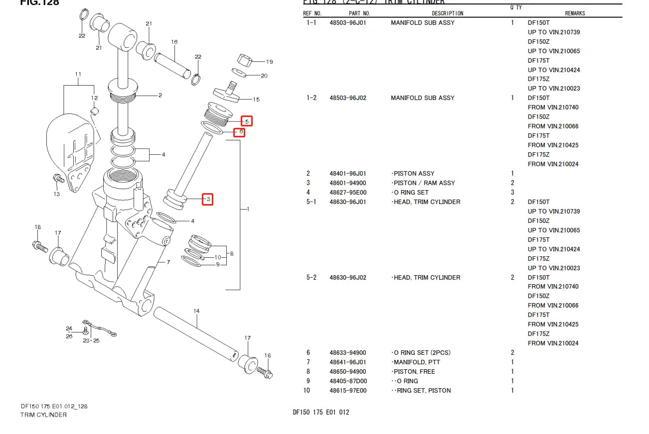 48630-96J01 Pistone del cilindro del rivestimento della testa 48601-94900 Pistone Ram con O-ring per inclinazione del rivestimento del motore fuoribordo Suzuki 115-200HP