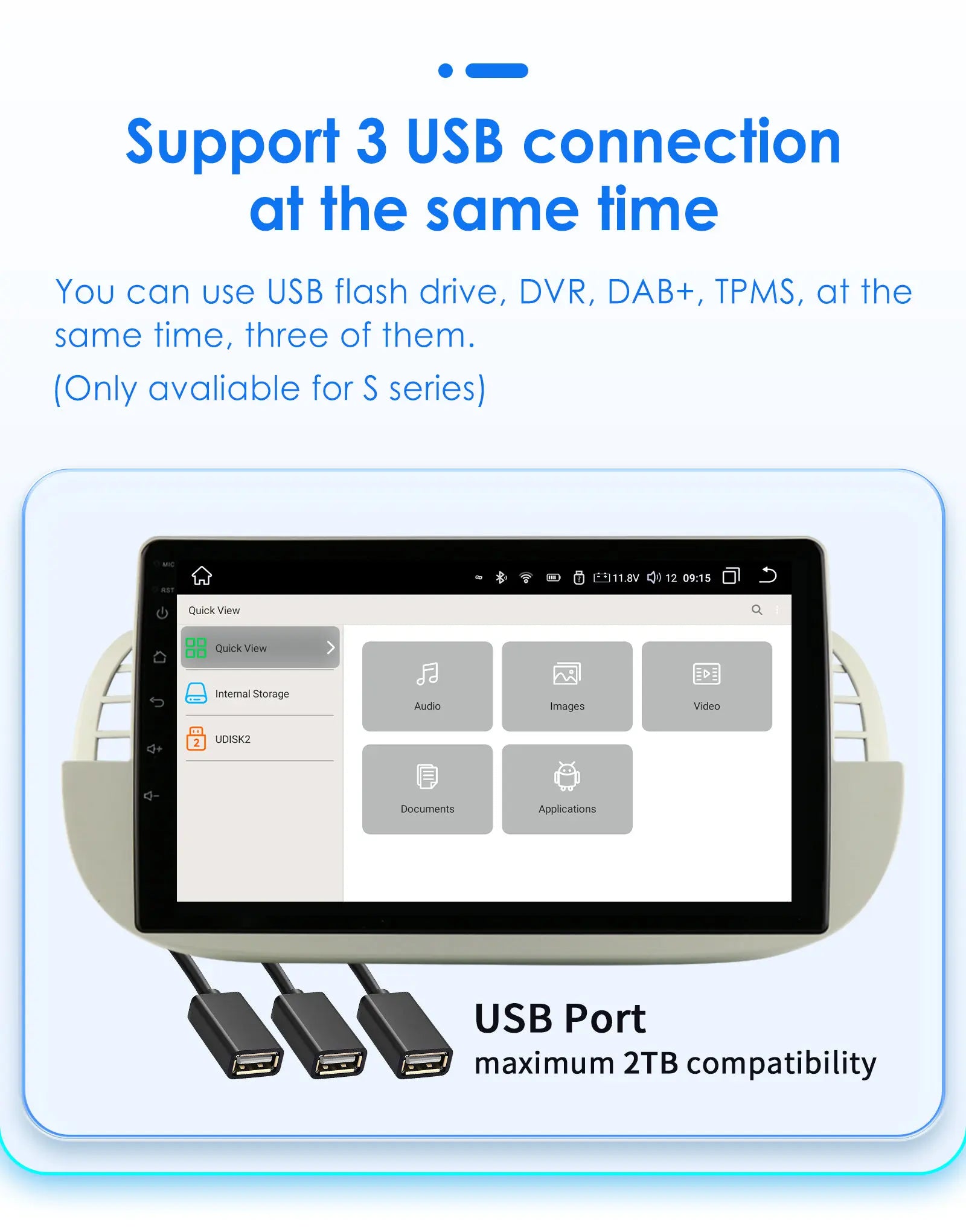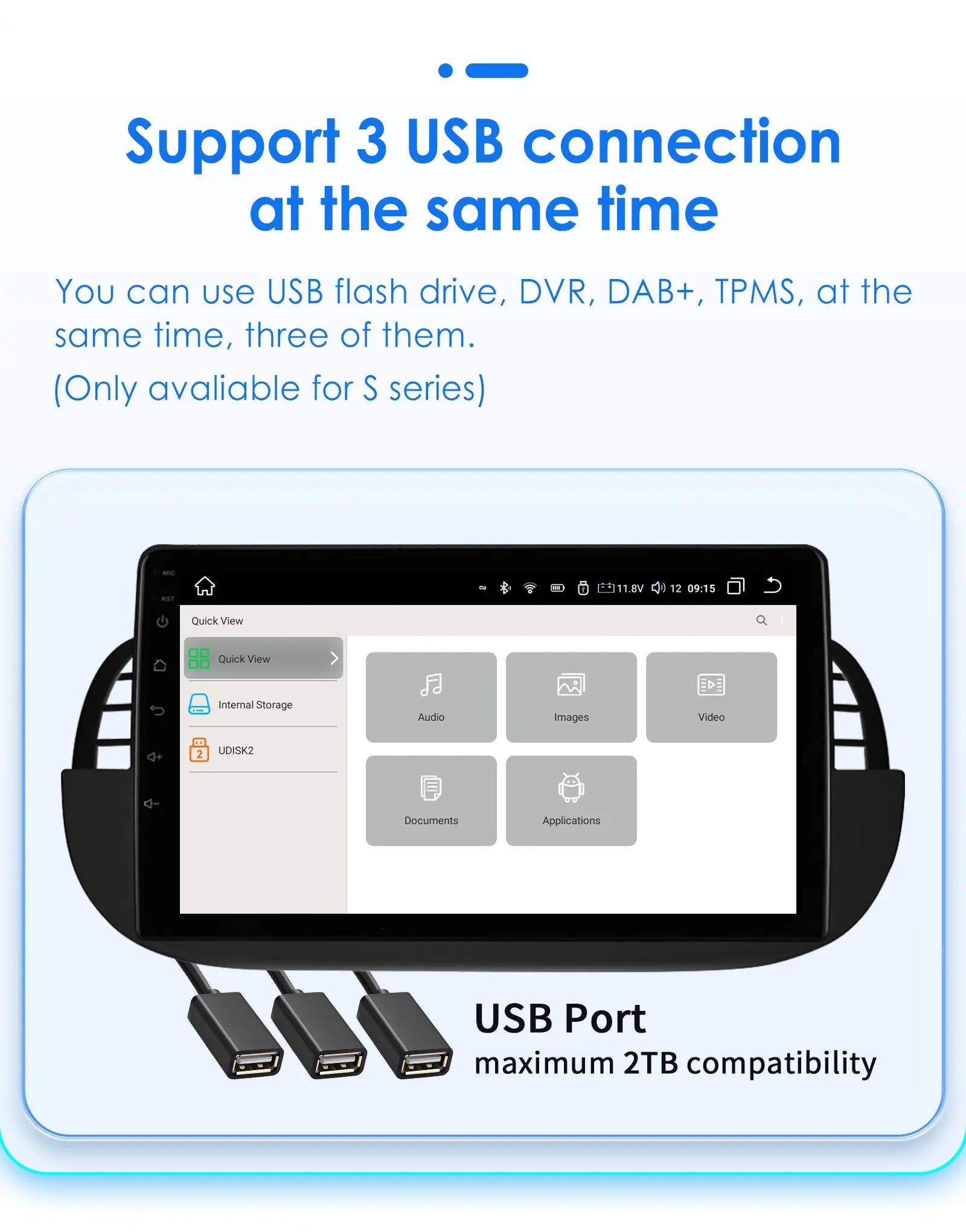 You can use USB flash drive,DVR,DAB+,TPMS at the same time,three of them. (Only avaliable for S series)