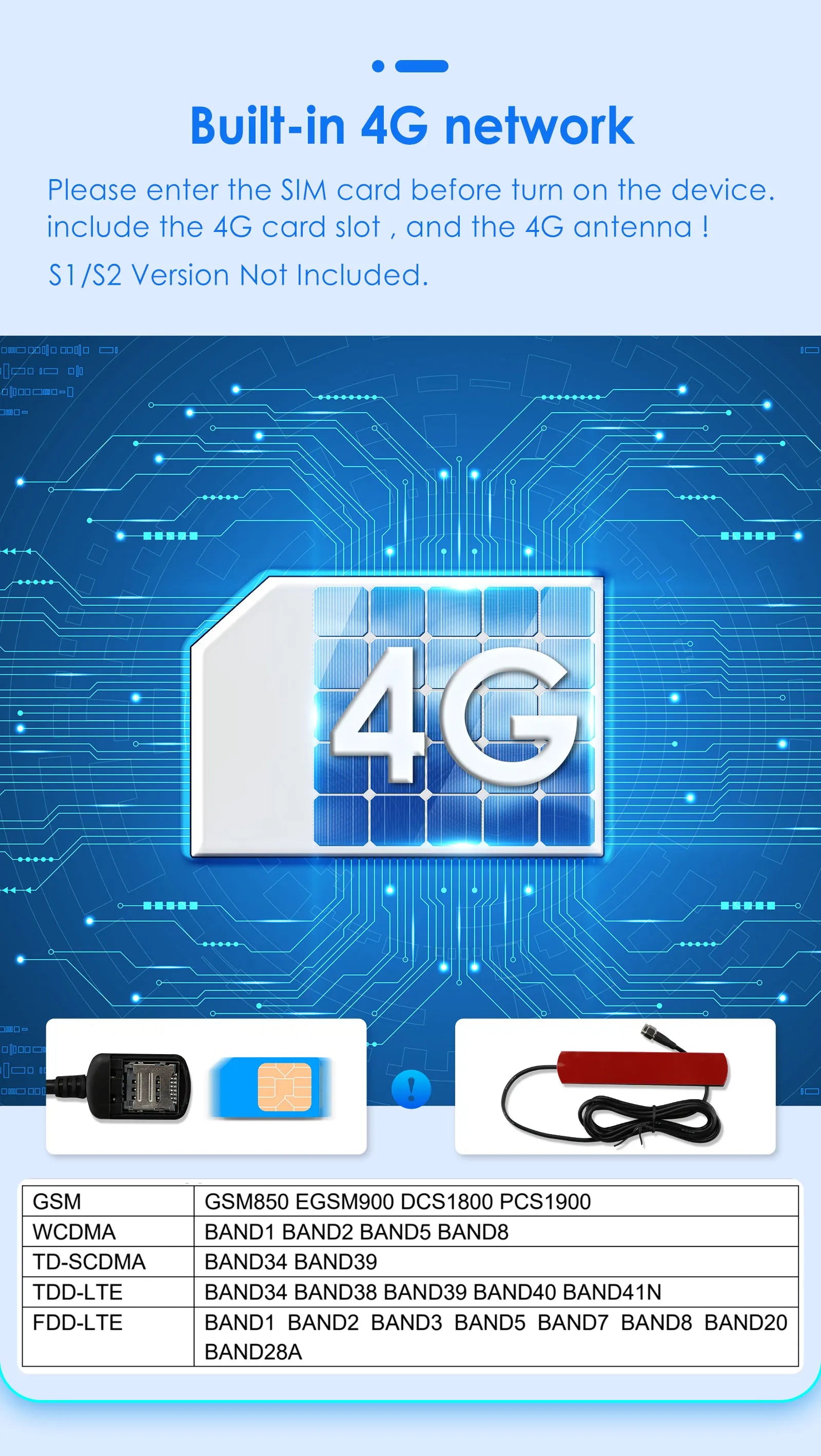 S3/S4/S5/S7/S8 supports 4G and WIFI. The package contains a SIM card slot