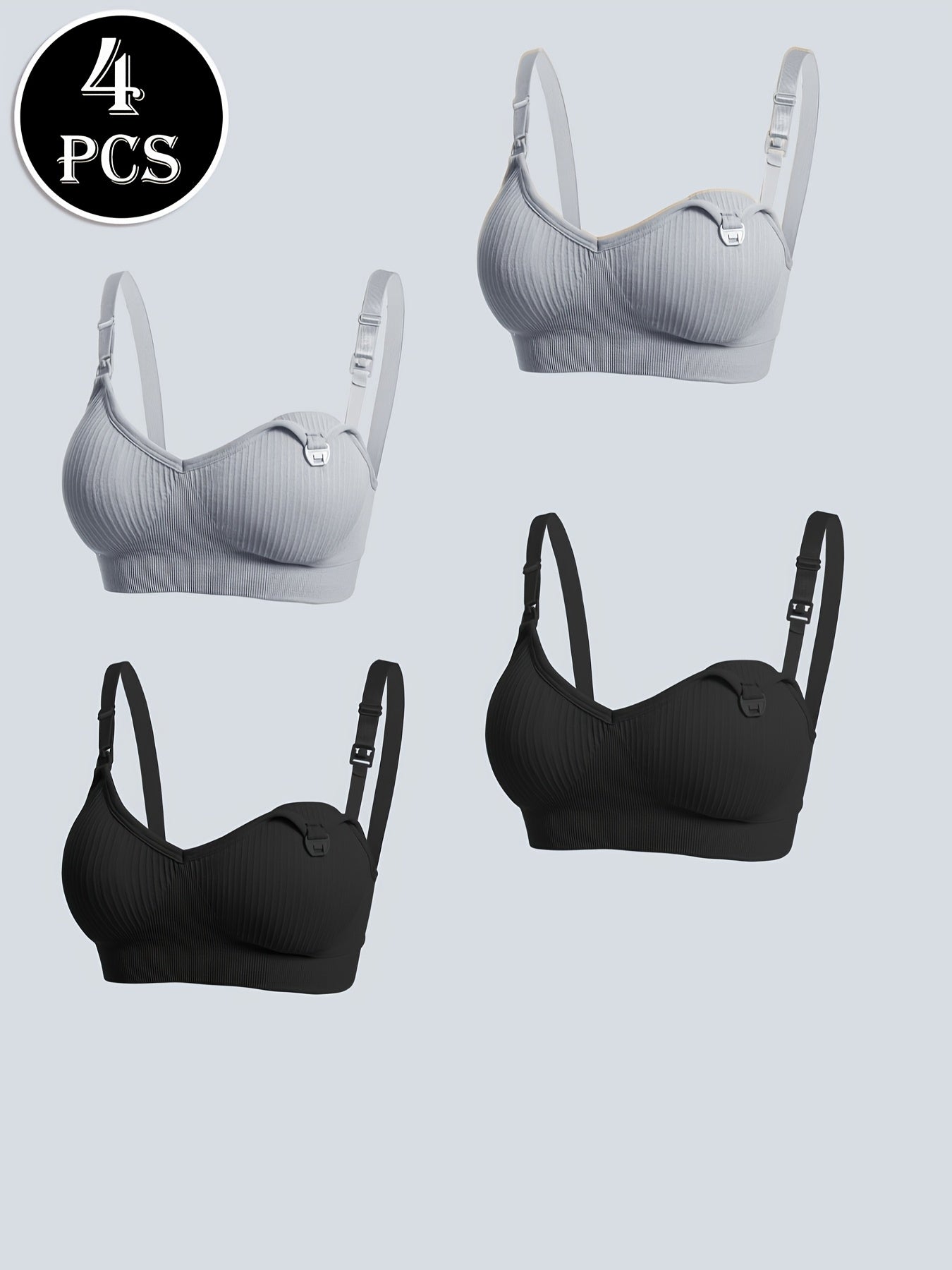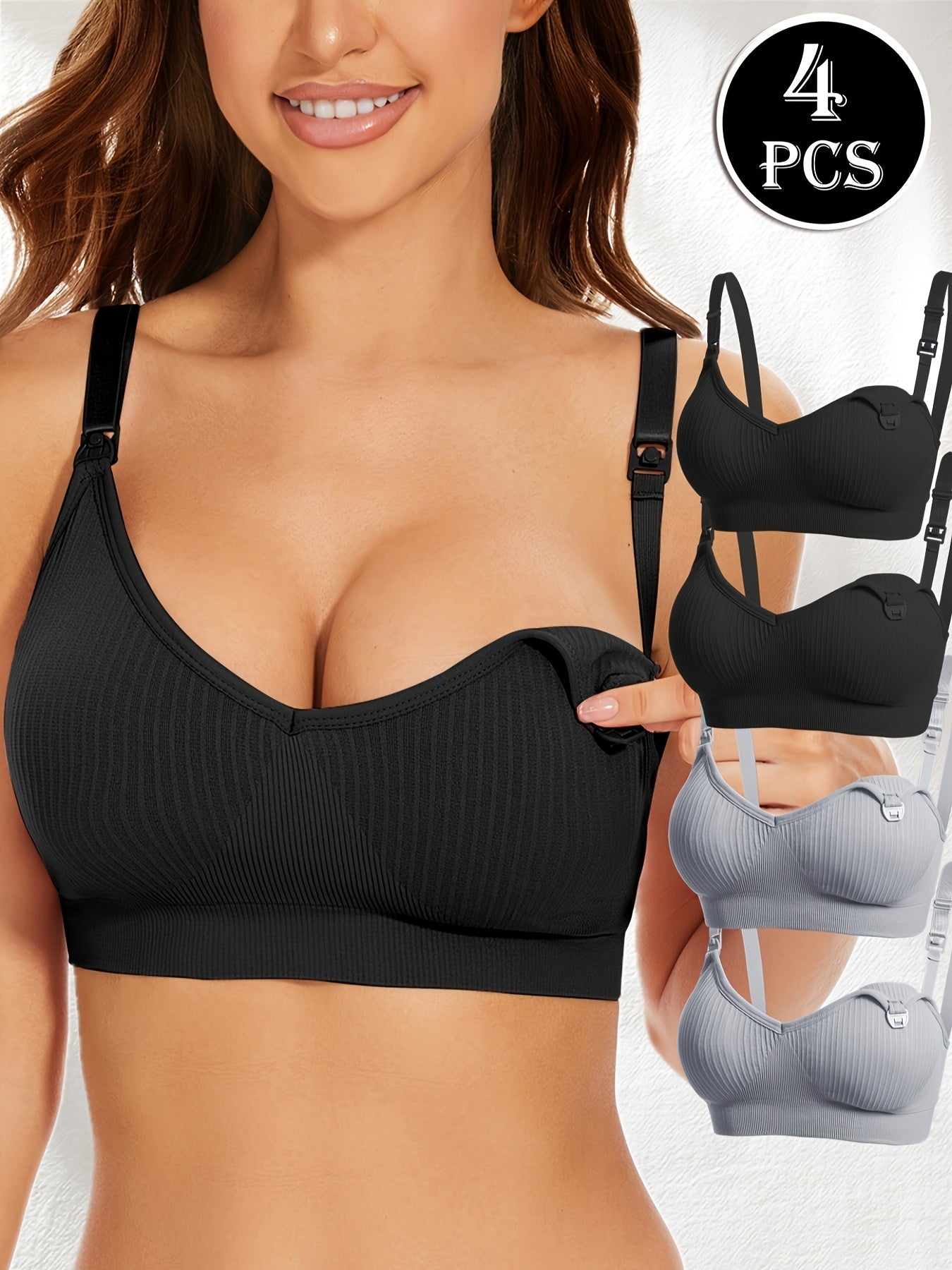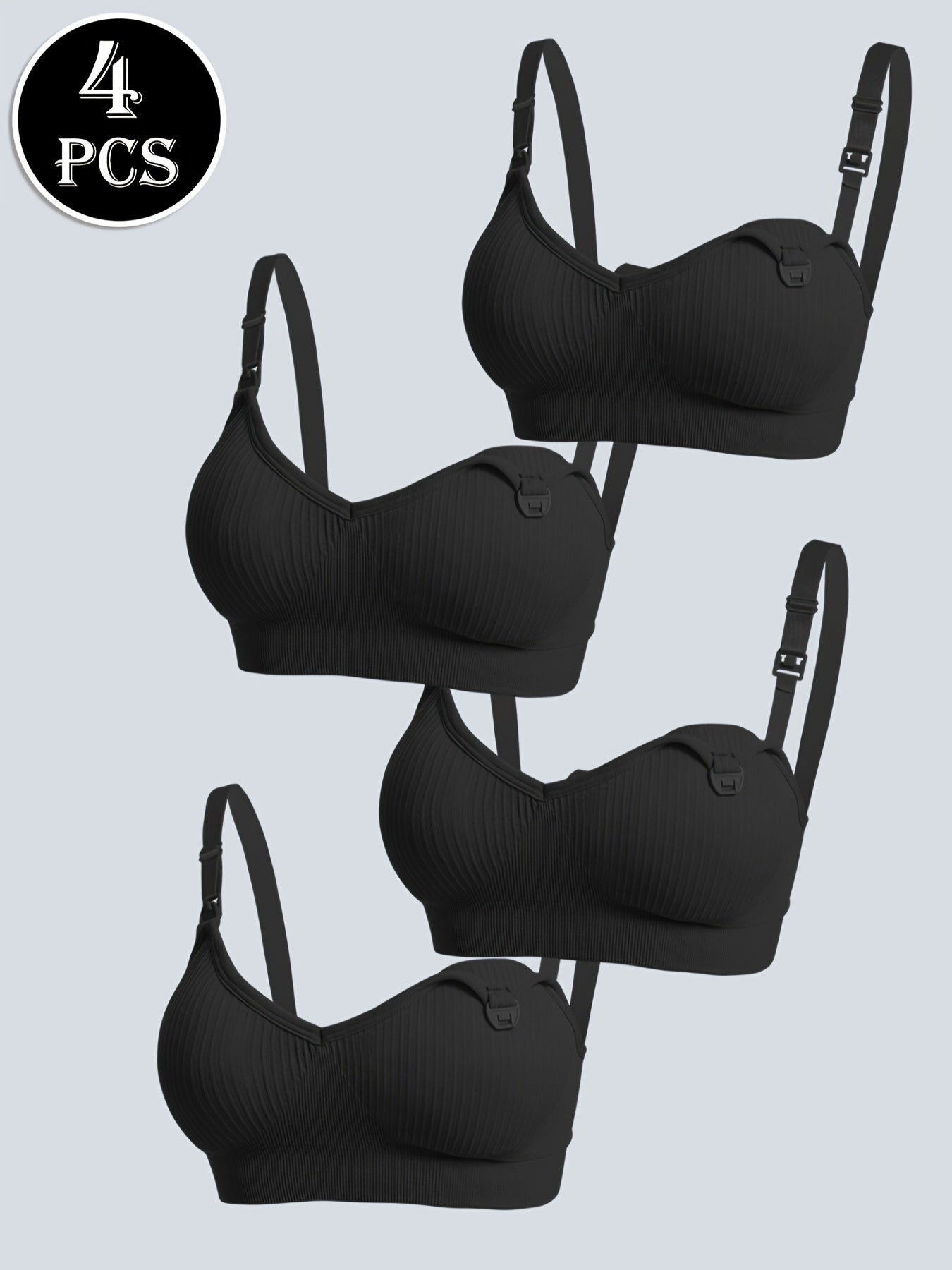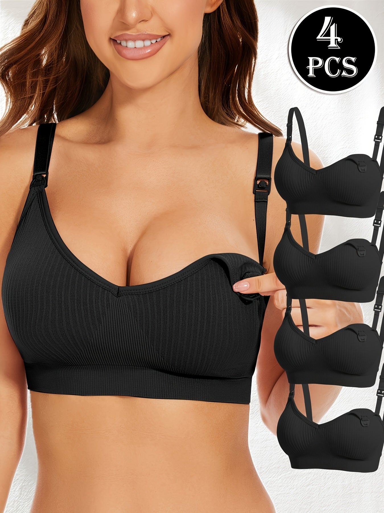 4pz Eleganti Reggiseni da Allattamento Premaman Neri con Chiusura Frontale & Imbottiture Rimovibili - Copertura Completa Traspirante, Tessuto Elasticizzato per Donne, Lavabili in Lavatrice