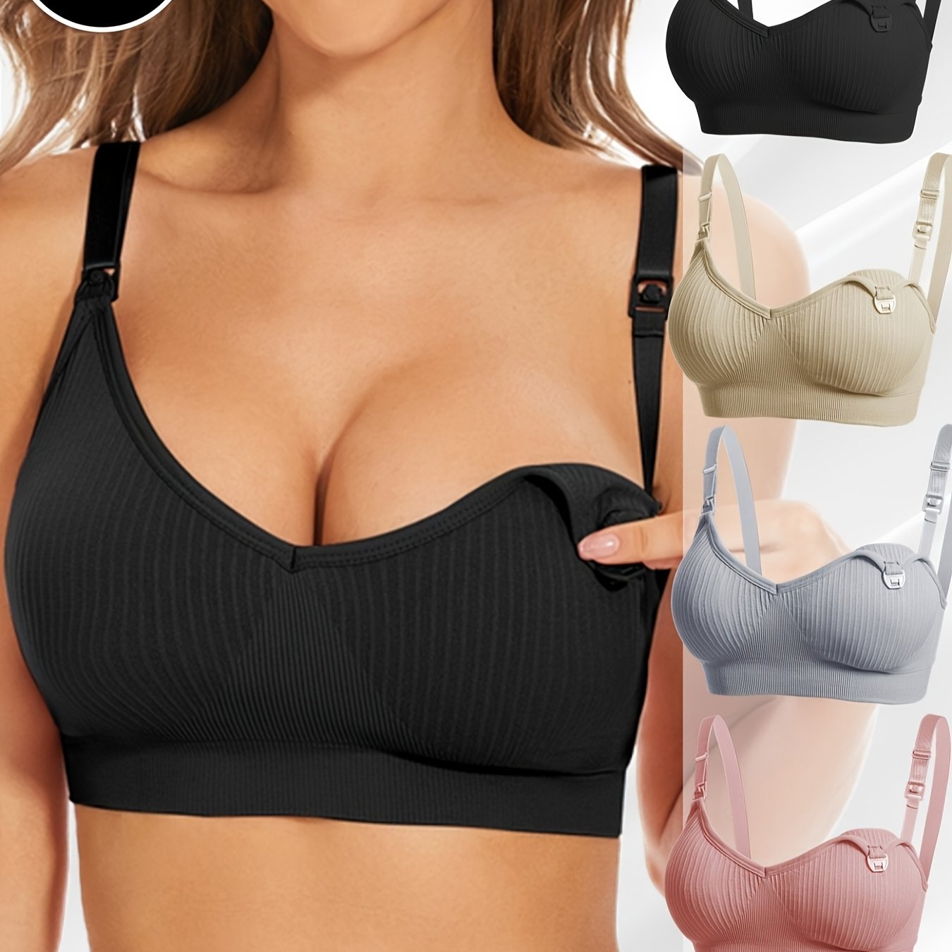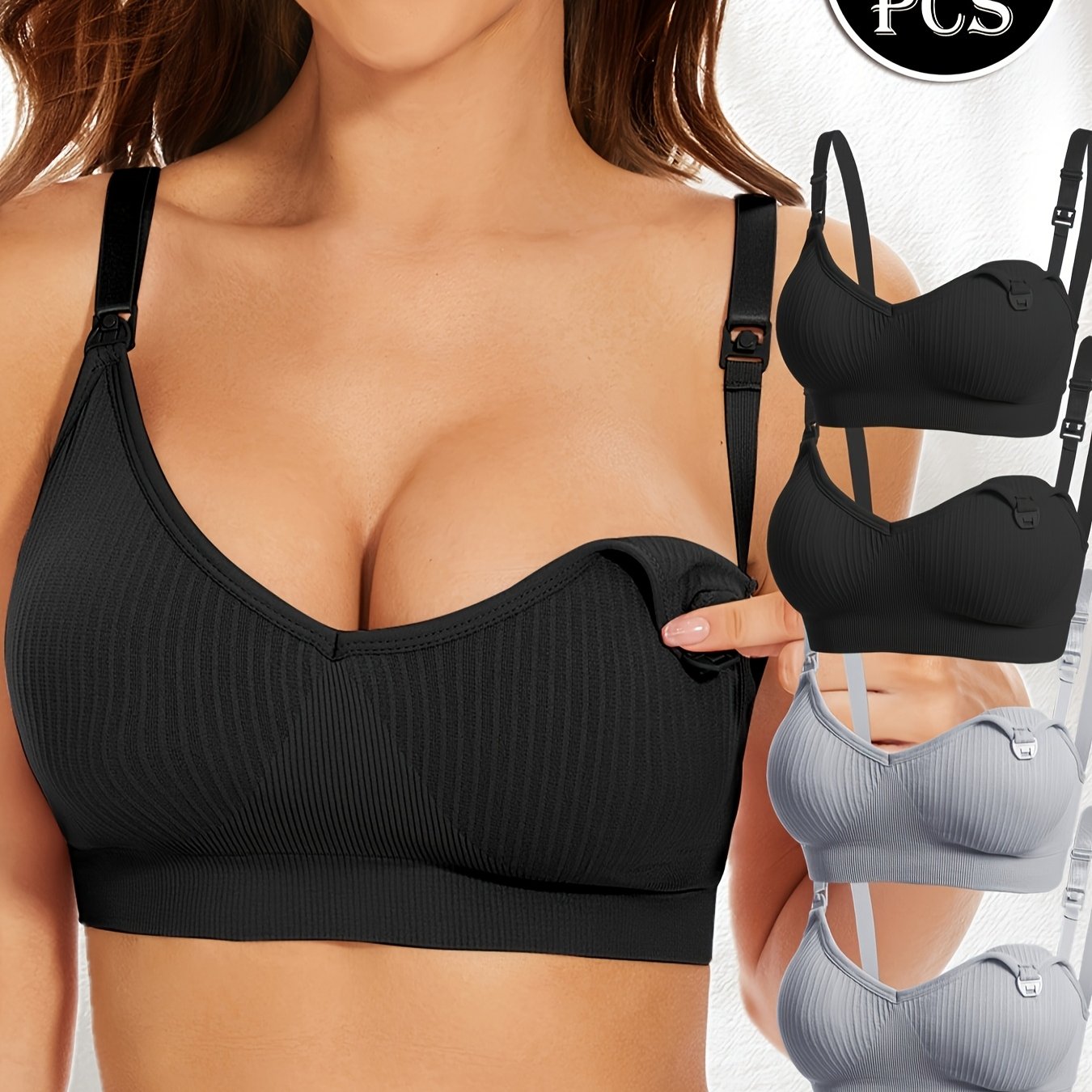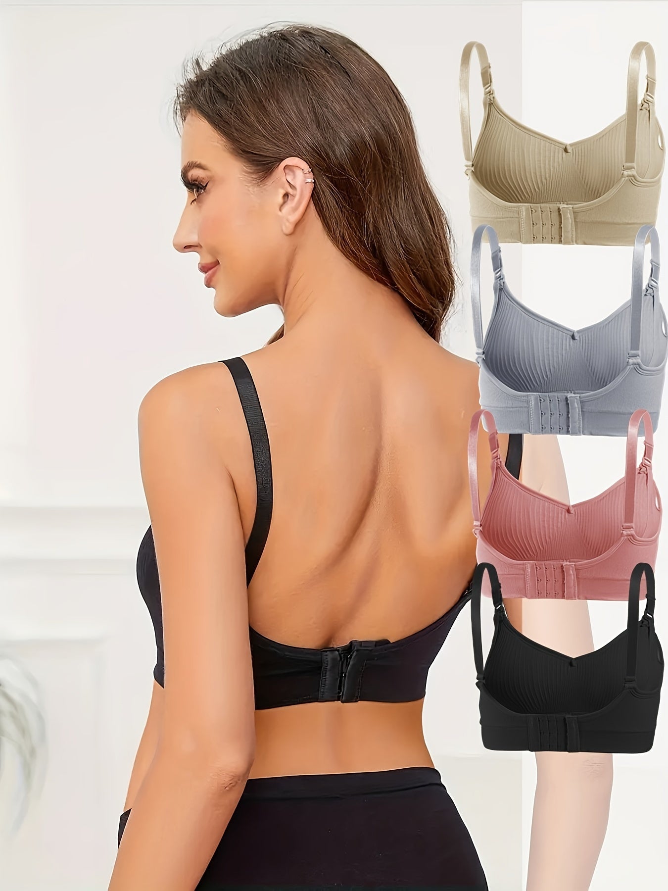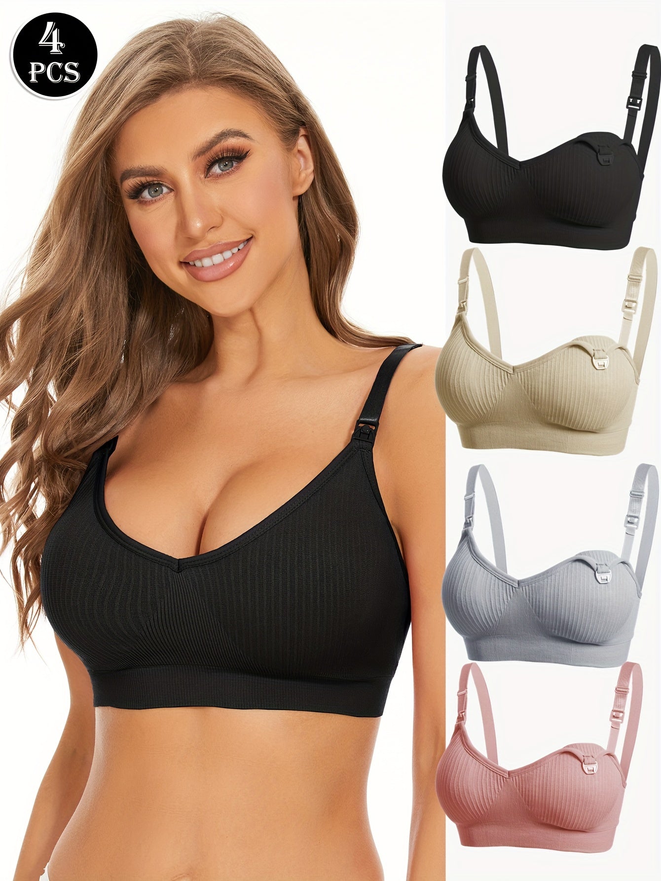 4pz Eleganti Reggiseni da Allattamento Premaman Neri con Chiusura Frontale & Imbottiture Rimovibili - Copertura Completa Traspirante, Tessuto Elasticizzato per Donne, Lavabili in Lavatrice