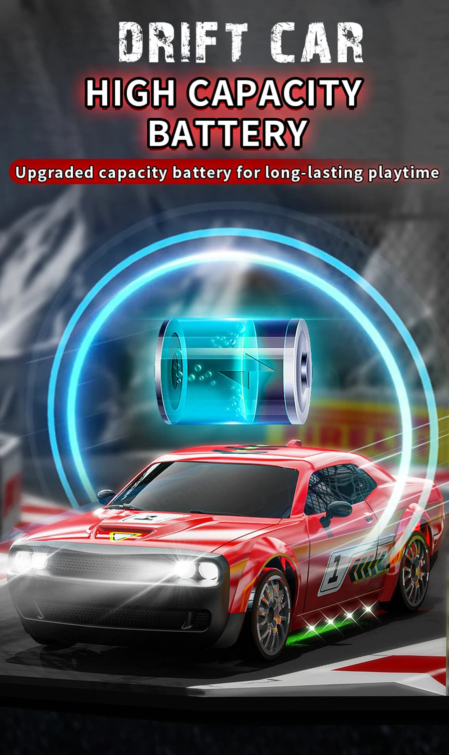 LED Light and Longer Playing Time: Our drift RC car features an LED light for night time racing. It includes 4 rechargeable batteries, ensuring longer playtime and endless fun.
