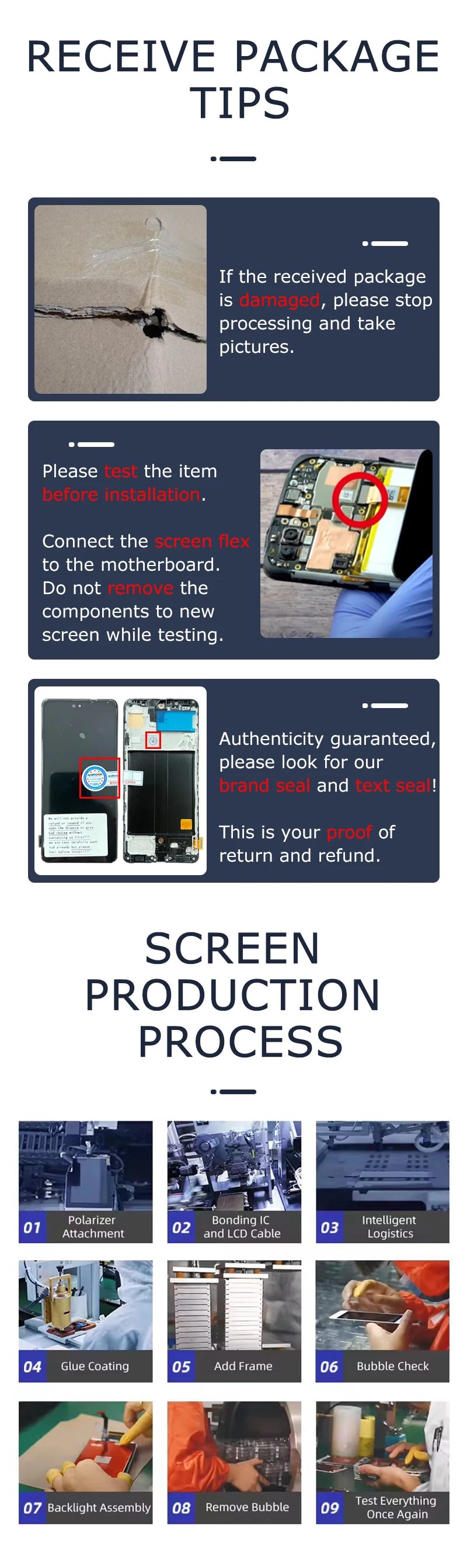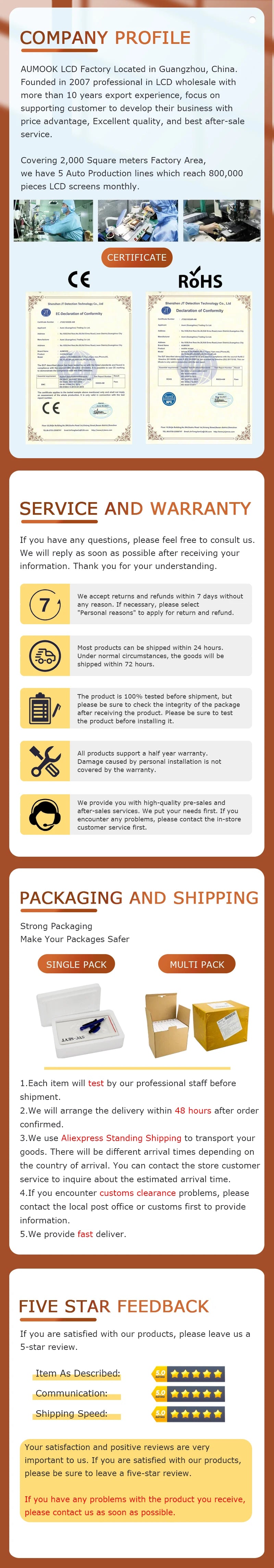 Please note that there is no need to move our screen assembly directly to the phone when testing, if there is any problem with the item, please stop the process and contact us.