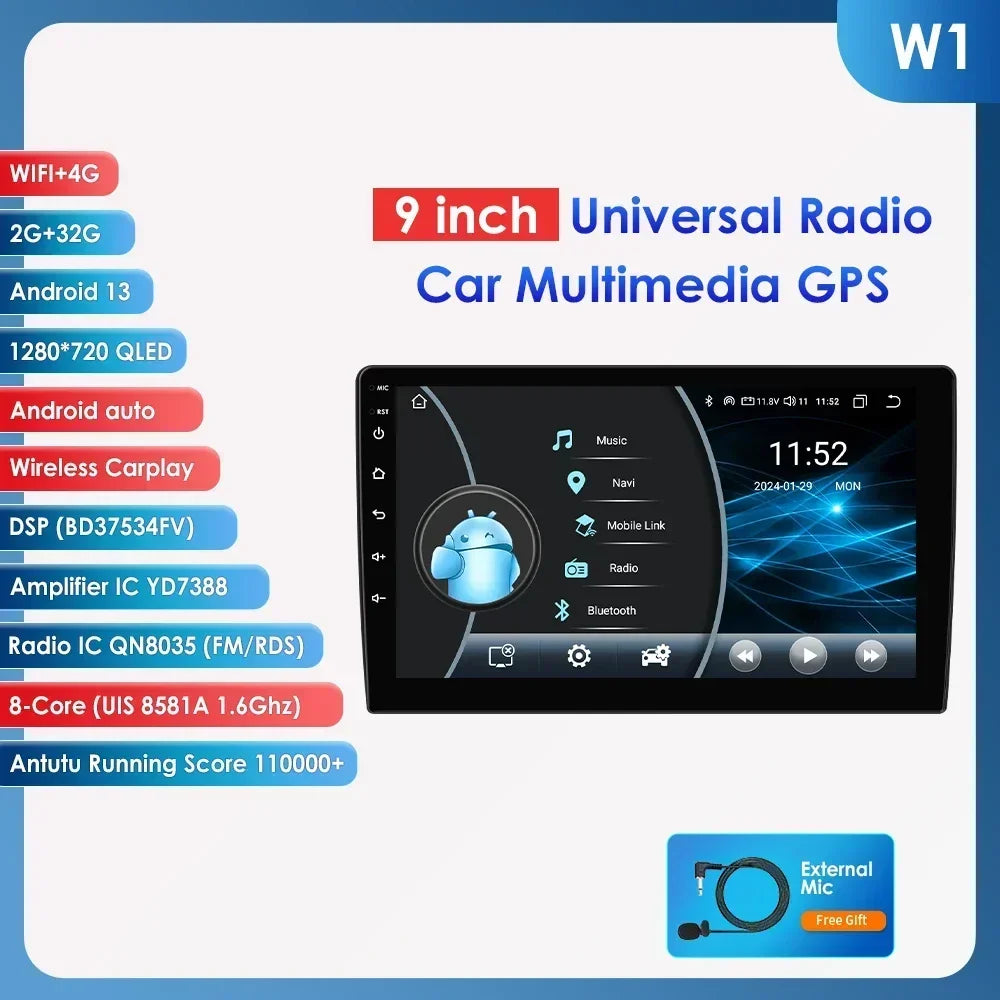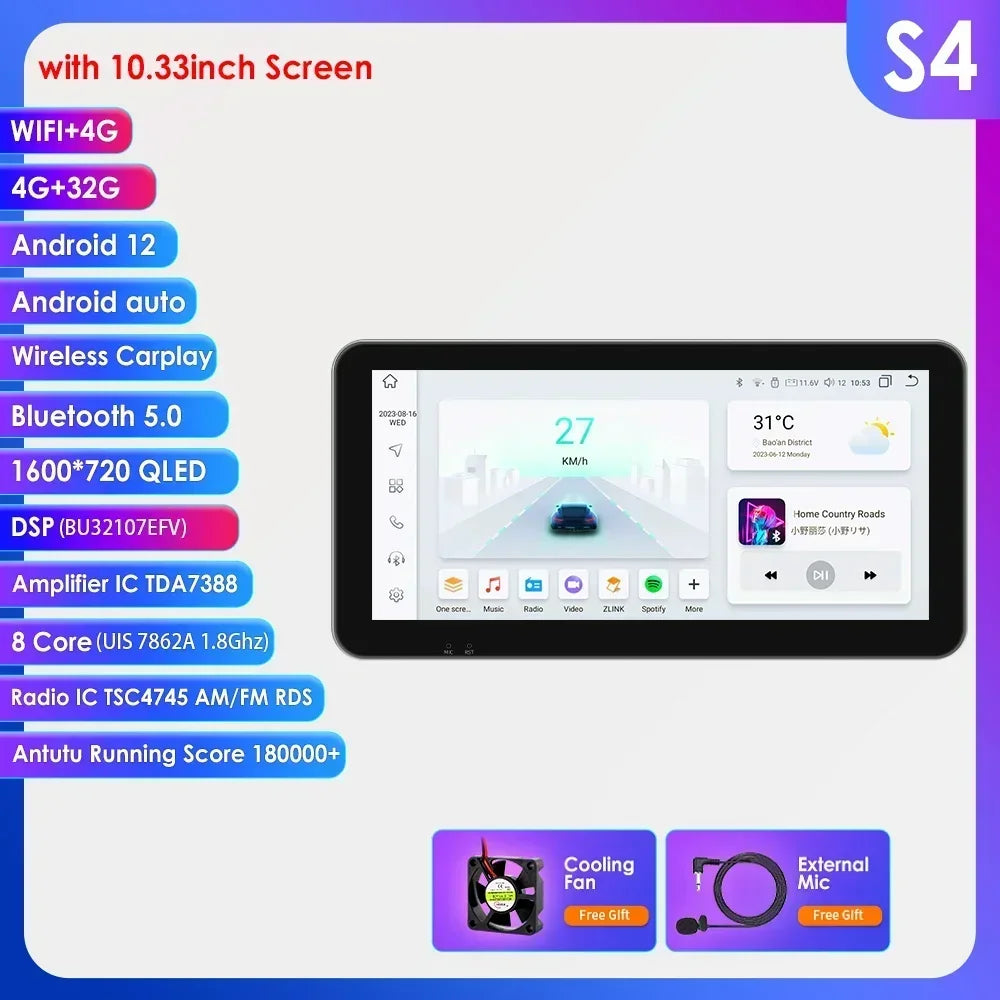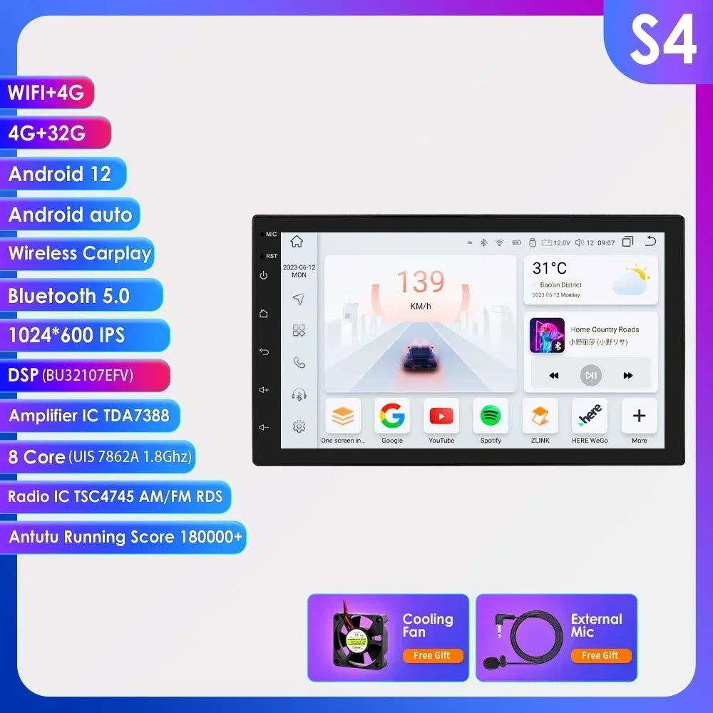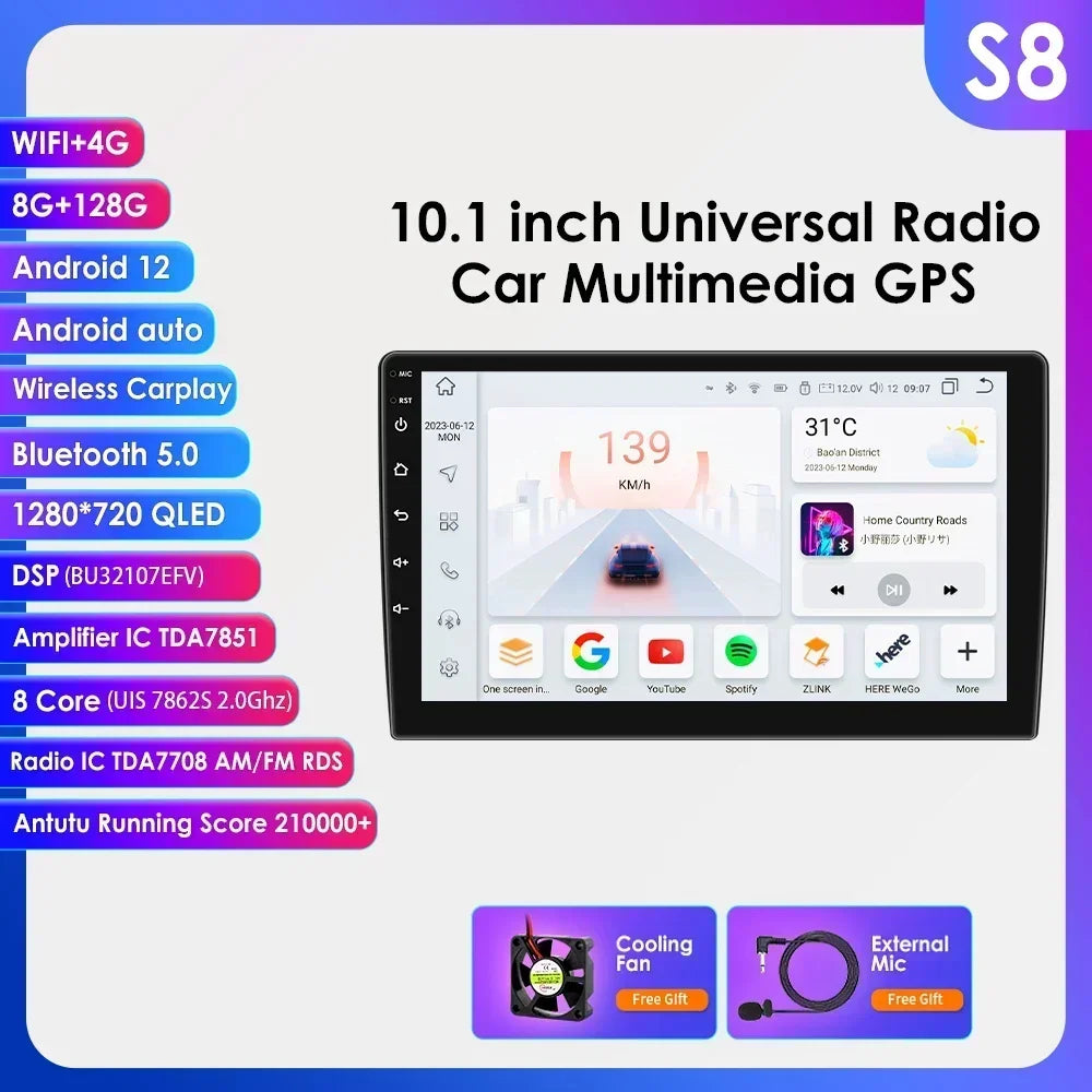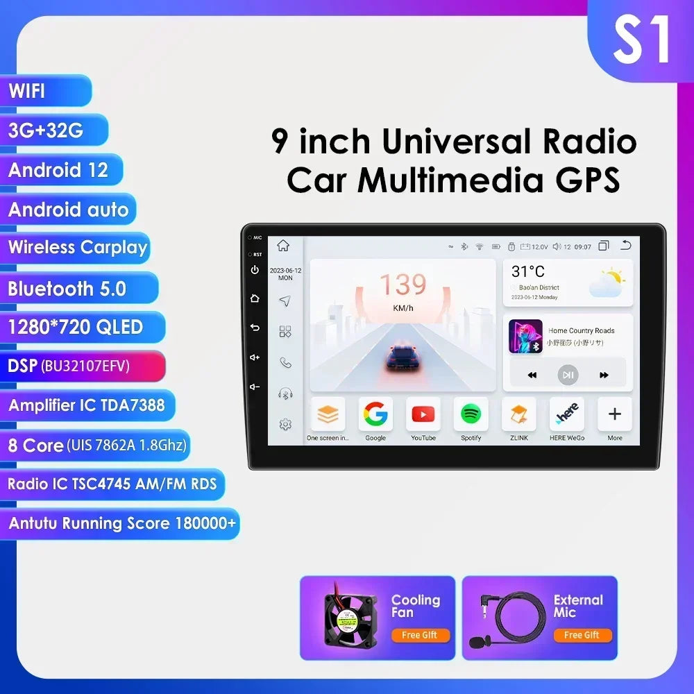 -----> Basic functions: Android 12 / Android 13 +7inch / 9 inch / 10.33 inch / 11.5 inch / 13.1 inch / 9.7 inch(Tesla Style)Display Screen + Quad Core 1.2GHZ (Eight core UIS 7862A 1.8Ghz / UIS 7862S 2.0Hhz optional)+ DDR3 1GB Flash (2GB/3GB/4GB/6GB/8GB optional) + 16 GB Memory (32GB/64GB/128GB optional) + WIFI (4G Network optional)+ Mirror link+ Steering Wheel Control + RDS+DSP(optional)