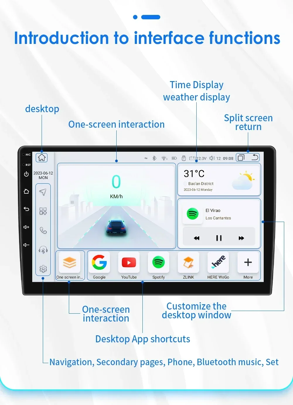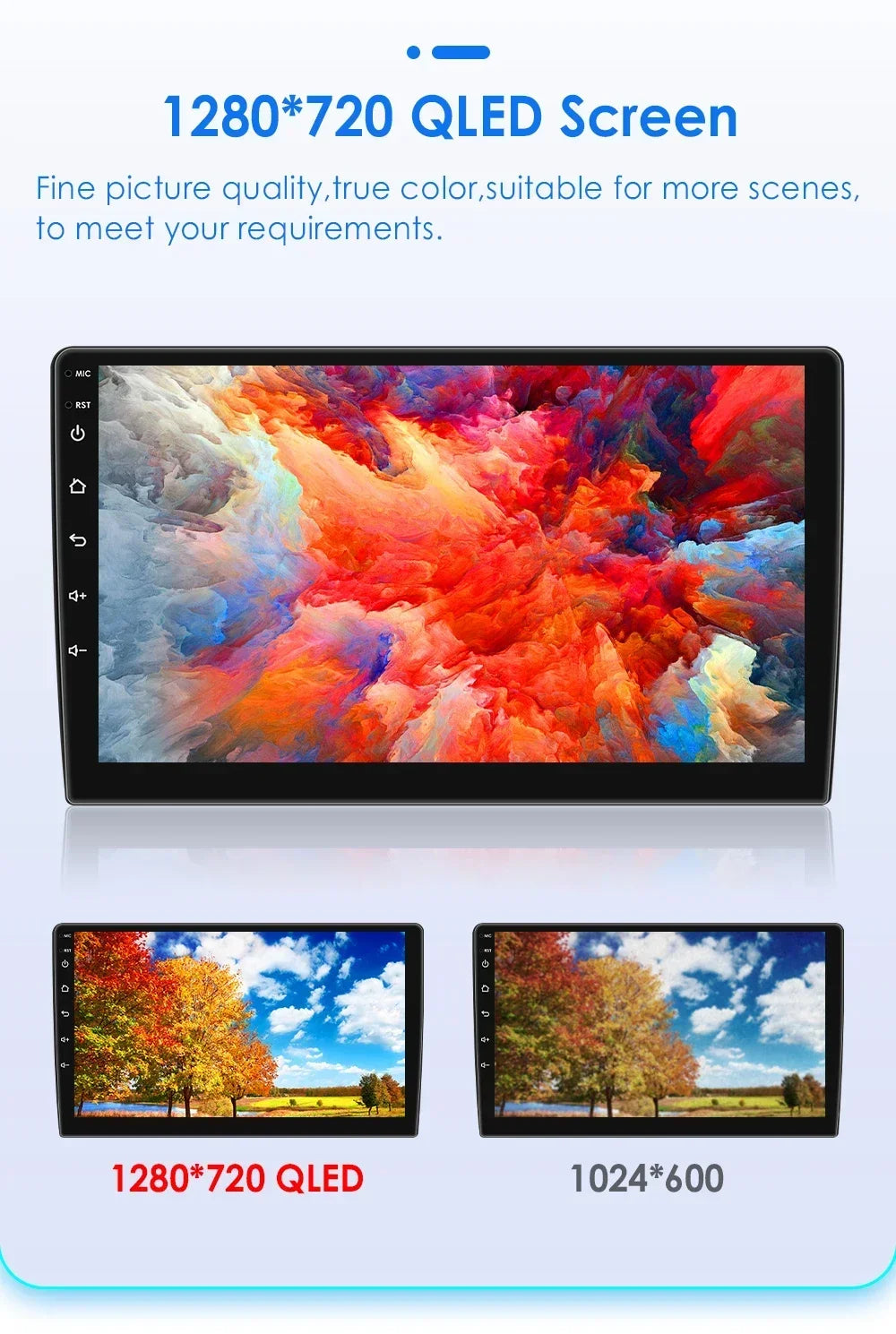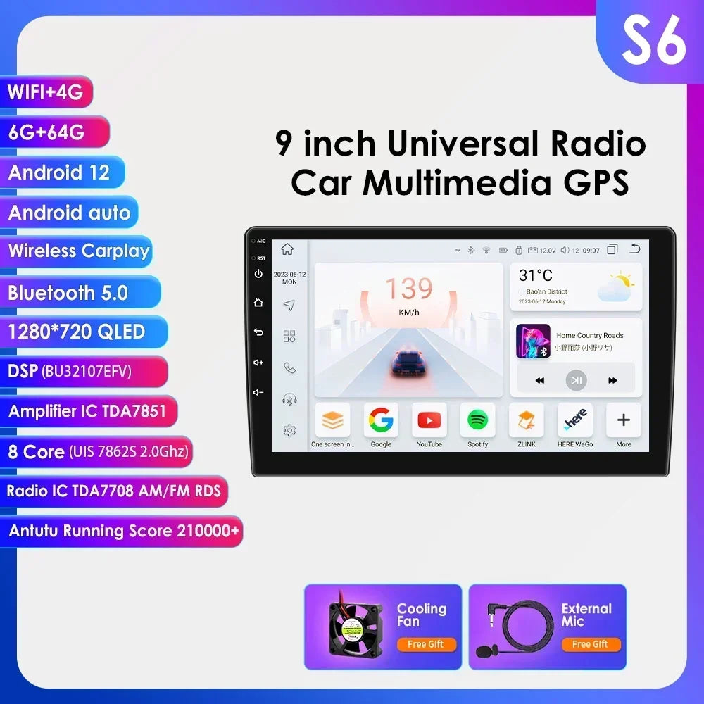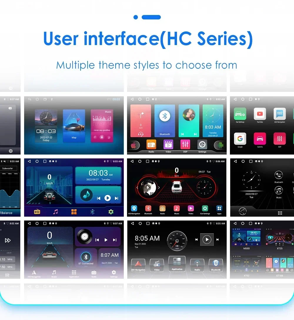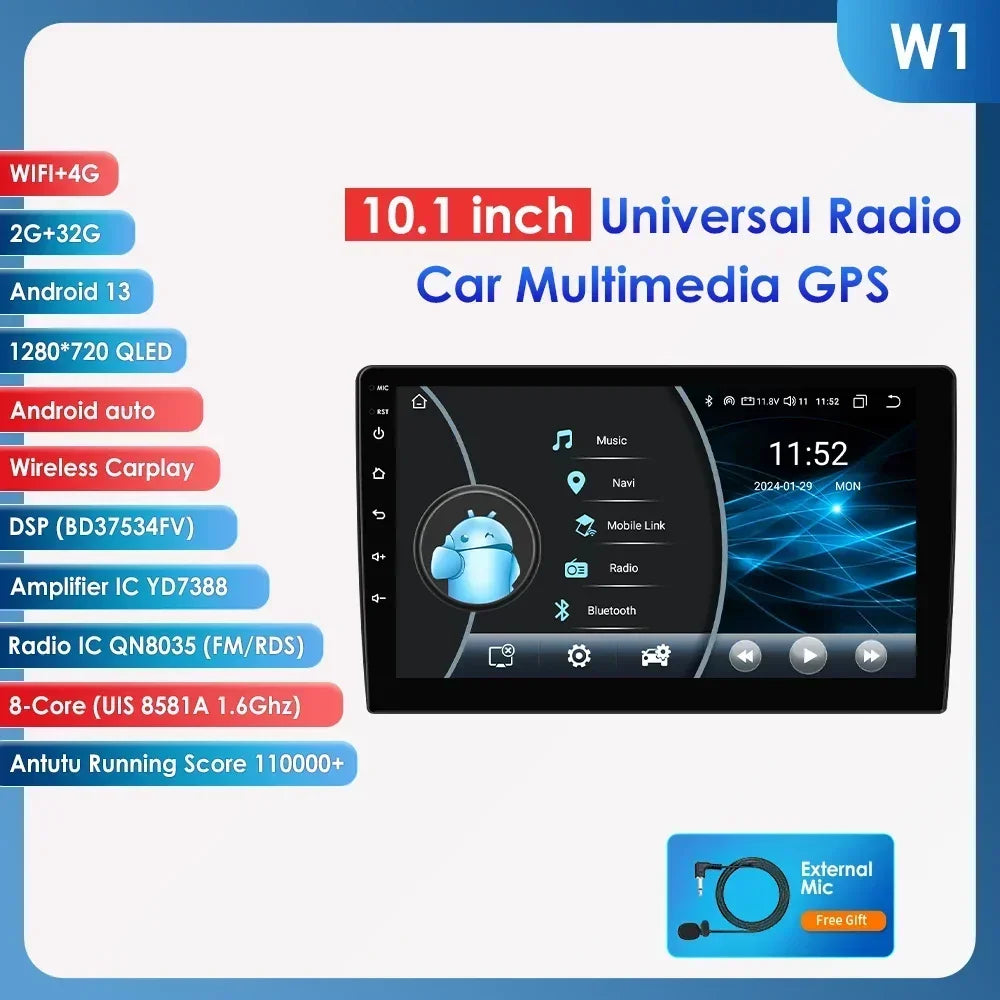 -----> Basic functions: Android 12 / Android 13 +7inch / 9 inch / 10.33 inch / 11.5 inch / 13.1 inch / 9.7 inch(Tesla Style)Display Screen + Quad Core 1.2GHZ (Eight core UIS 7862A 1.8Ghz / UIS 7862S 2.0Hhz optional)+ DDR3 1GB Flash (2GB/3GB/4GB/6GB/8GB optional) + 16 GB Memory (32GB/64GB/128GB optional) + WIFI (4G Network optional)+ Mirror link+ Steering Wheel Control + RDS+DSP(optional)