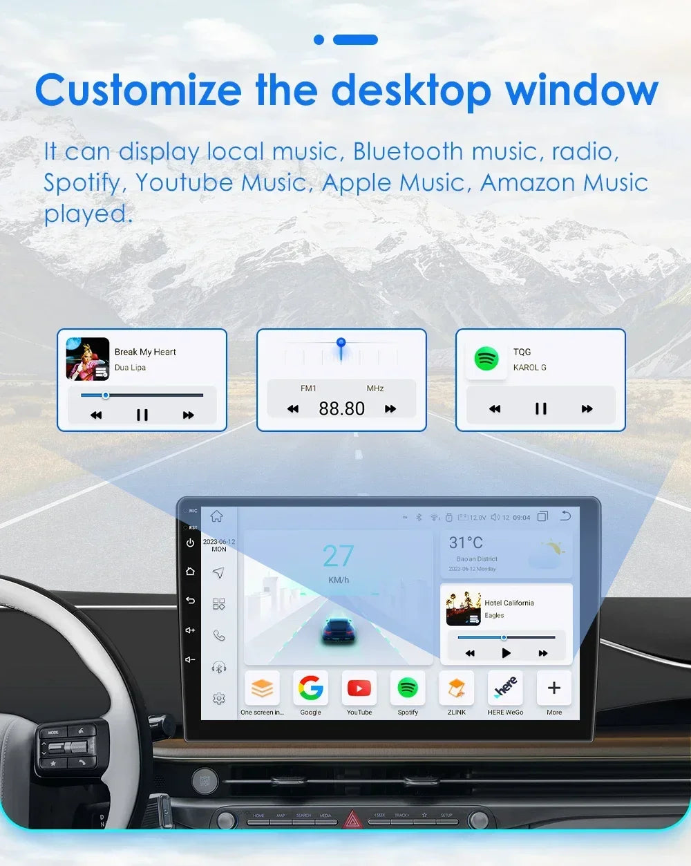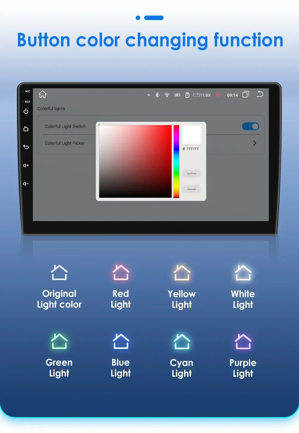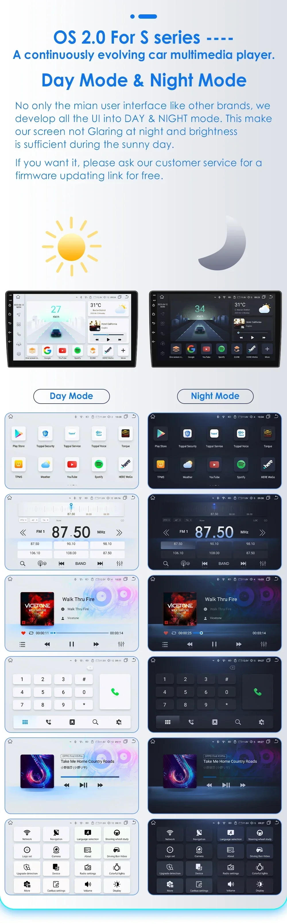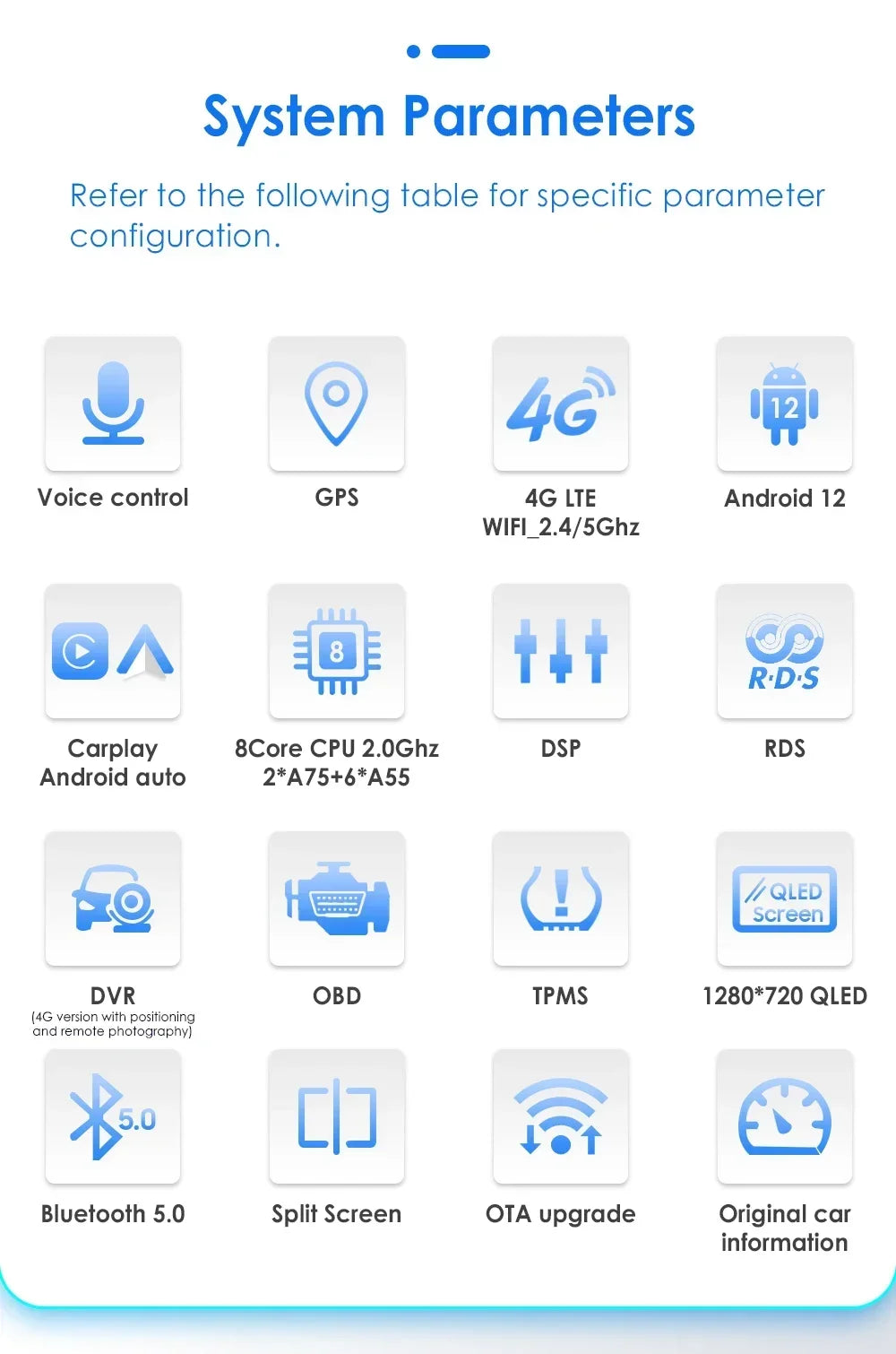 -----> Basic functions: Android 12 / Android 13 +7inch / 9 inch / 10.33 inch / 11.5 inch / 13.1 inch / 9.7 inch(Tesla Style)Display Screen + Quad Core 1.2GHZ (Eight core UIS 7862A 1.8Ghz / UIS 7862S 2.0Hhz optional)+ DDR3 1GB Flash (2GB/3GB/4GB/6GB/8GB optional) + 16 GB Memory (32GB/64GB/128GB optional) + WIFI (4G Network optional)+ Mirror link+ Steering Wheel Control + RDS+DSP(optional)