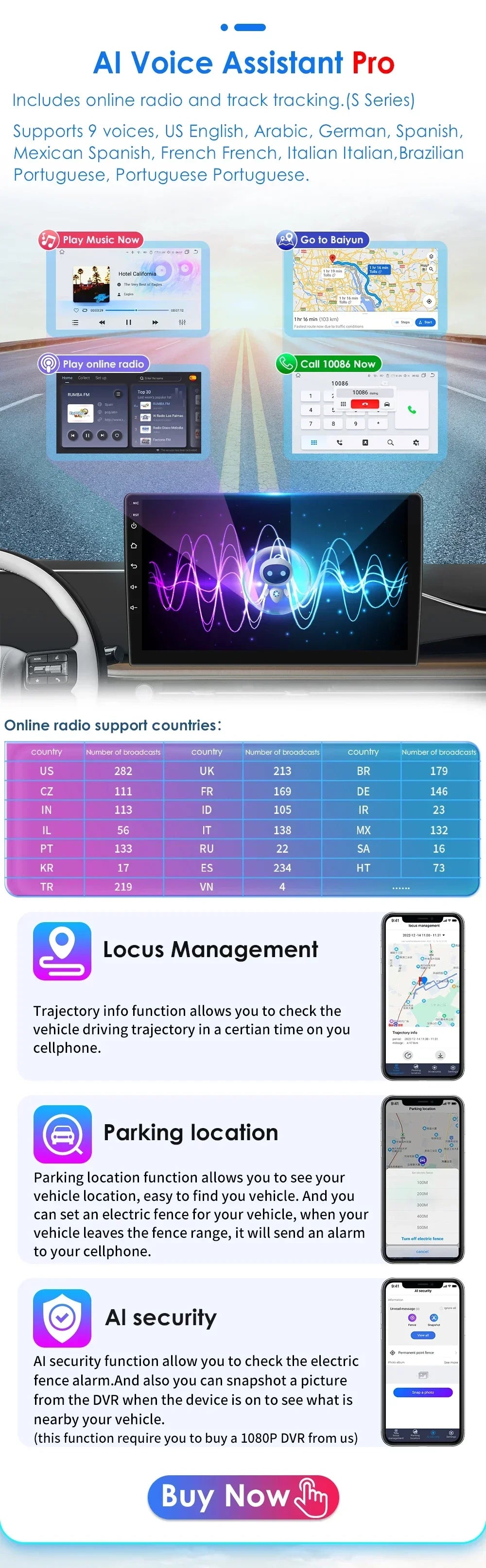 1) AI Voice Control: just say the command word control the radio without hands, make drive more safe;