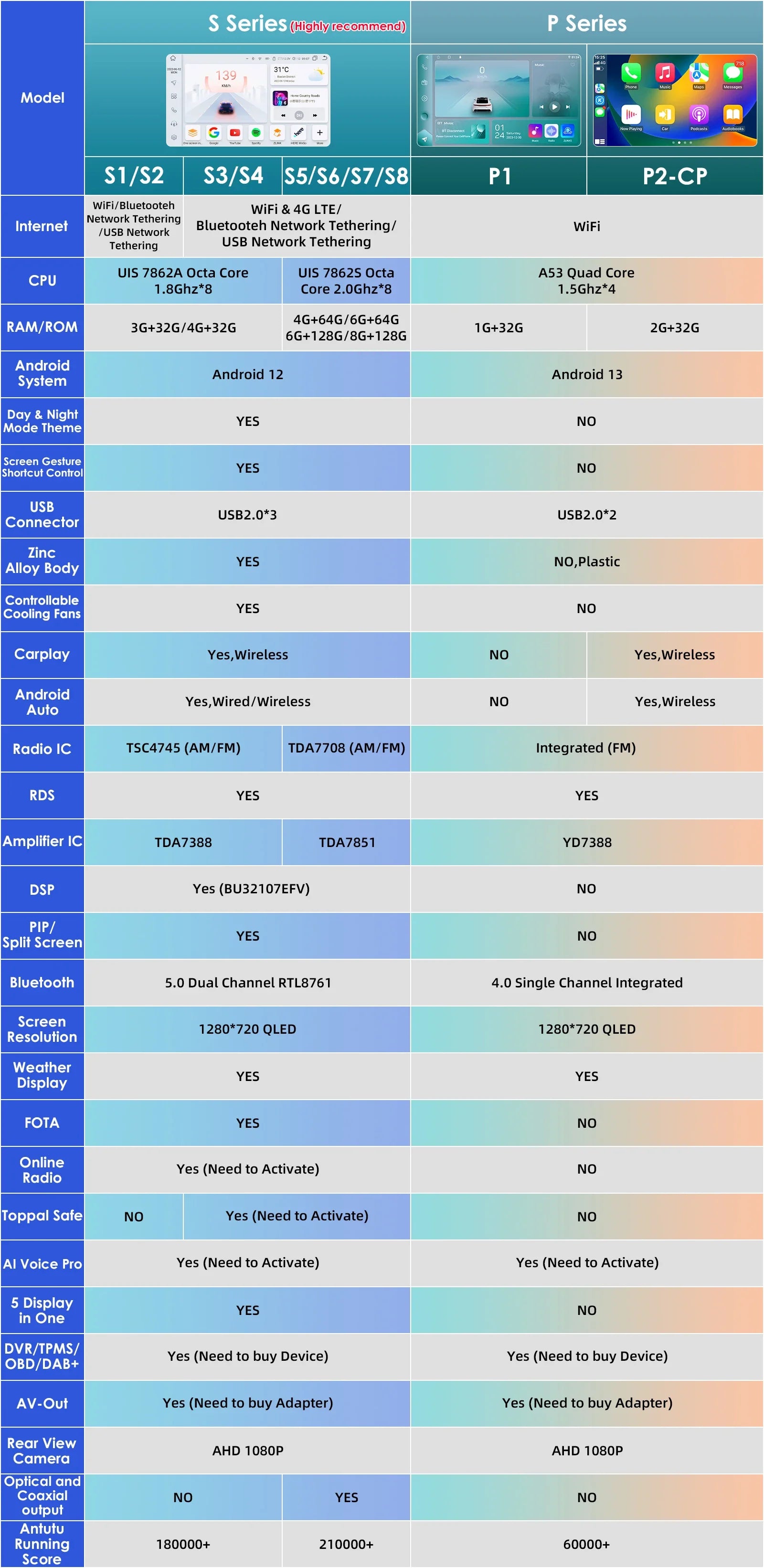 2) Built-in Carplay/ Android Auto: S1/S2/S3/S4/S5/S7/S8 version supporting, just use your phone cable connect it, stable and easy to use;