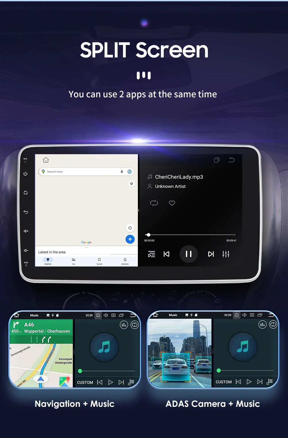 Supports AV-OUT: AV OUT box ( Needs to order separately) Split Screen : You can use 2 apps at the same time (such as: Navigation + Music , ADAS Camera + Music ,etc.)