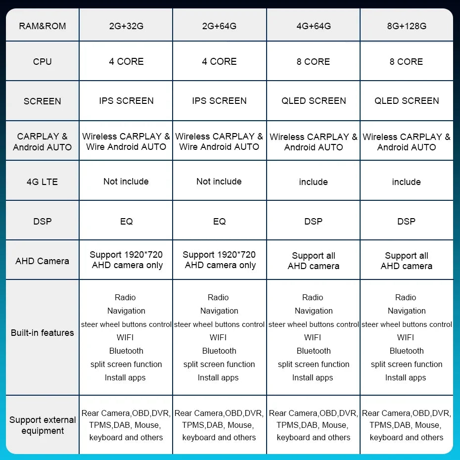 Special Features: wifi function,Support steering wheel control,Support 3G Network,Support 4G Network,Support Can-Bus,Built-in GPS,Charger,Mobile Phone,MP3 players,dsp,CarPlay,android auto,Reversing Input