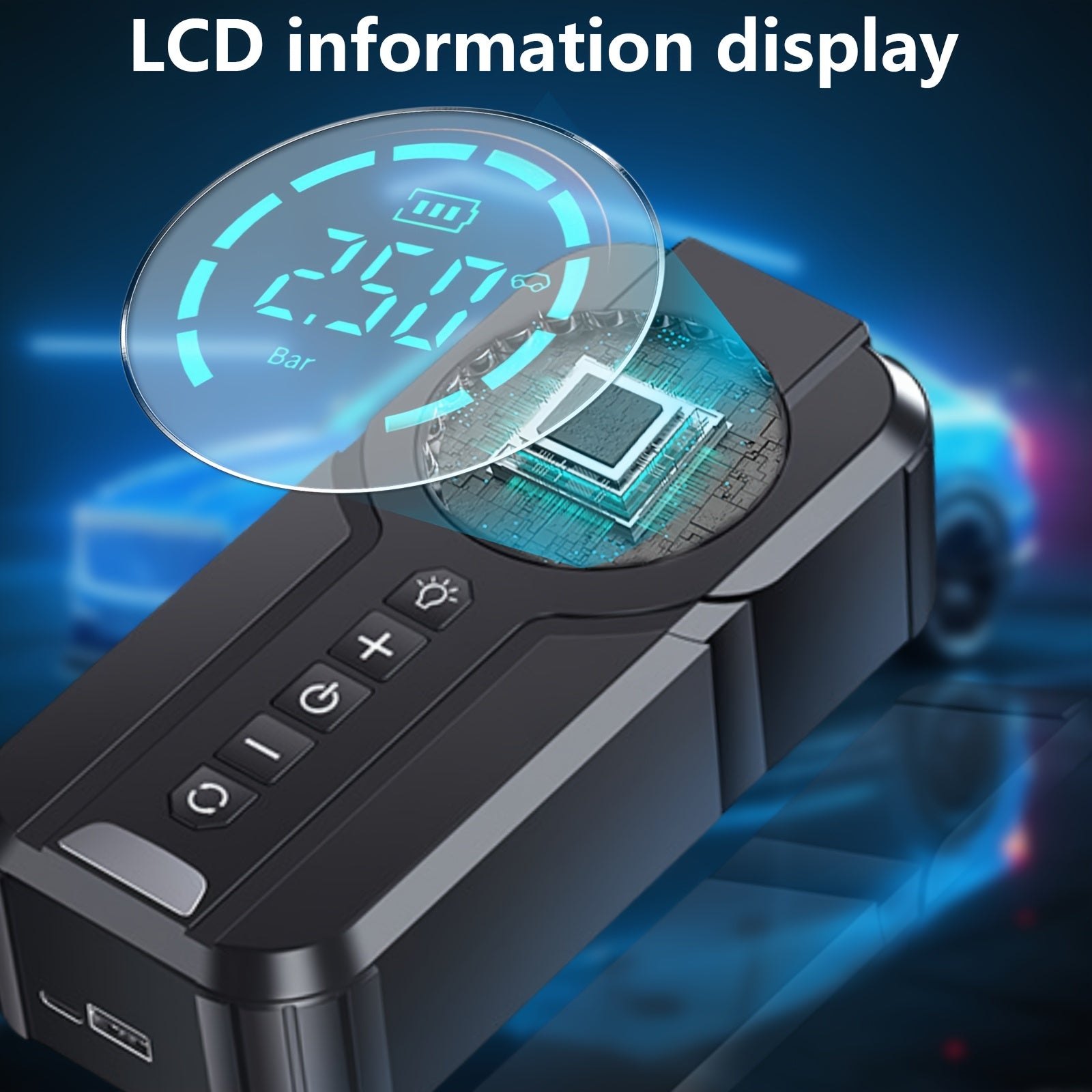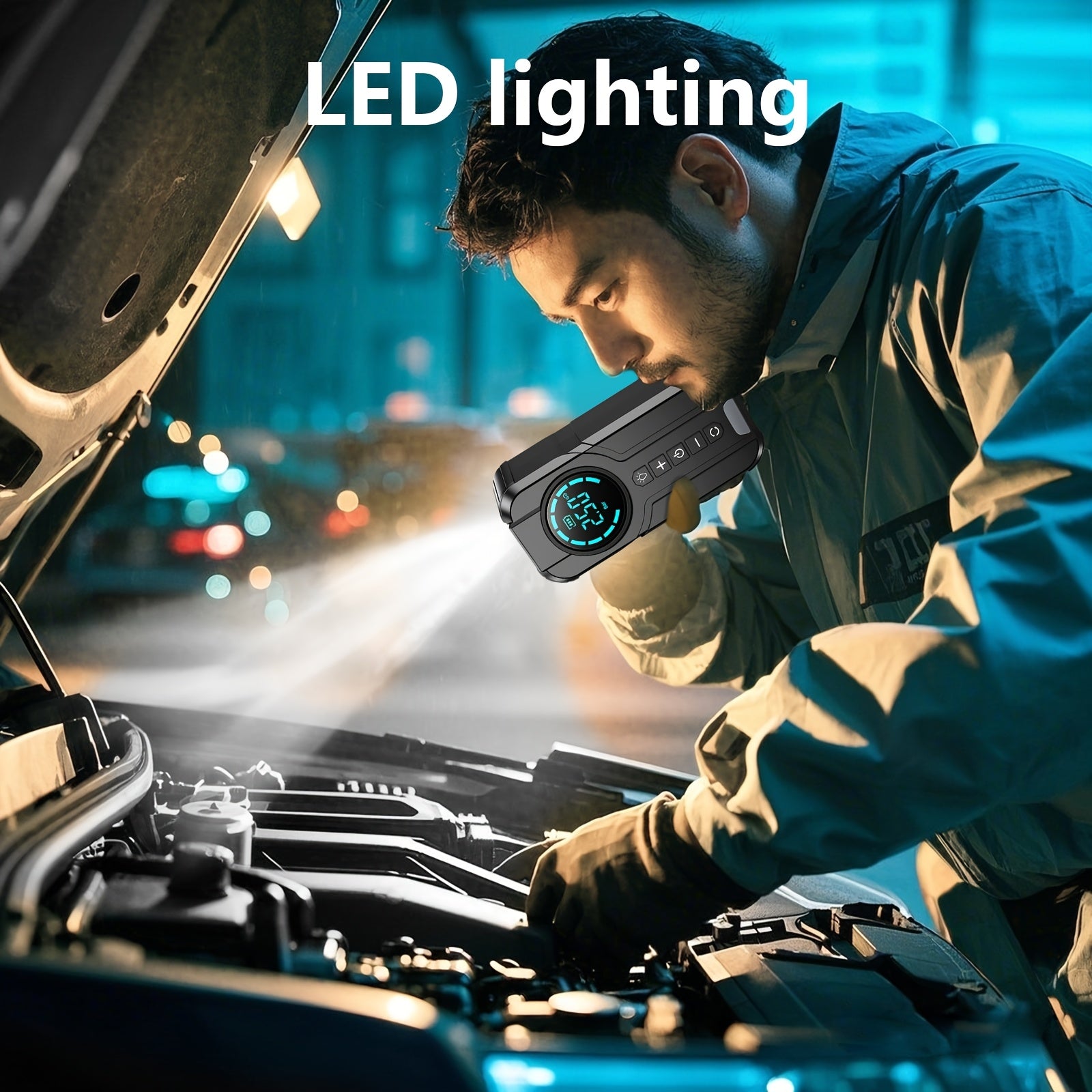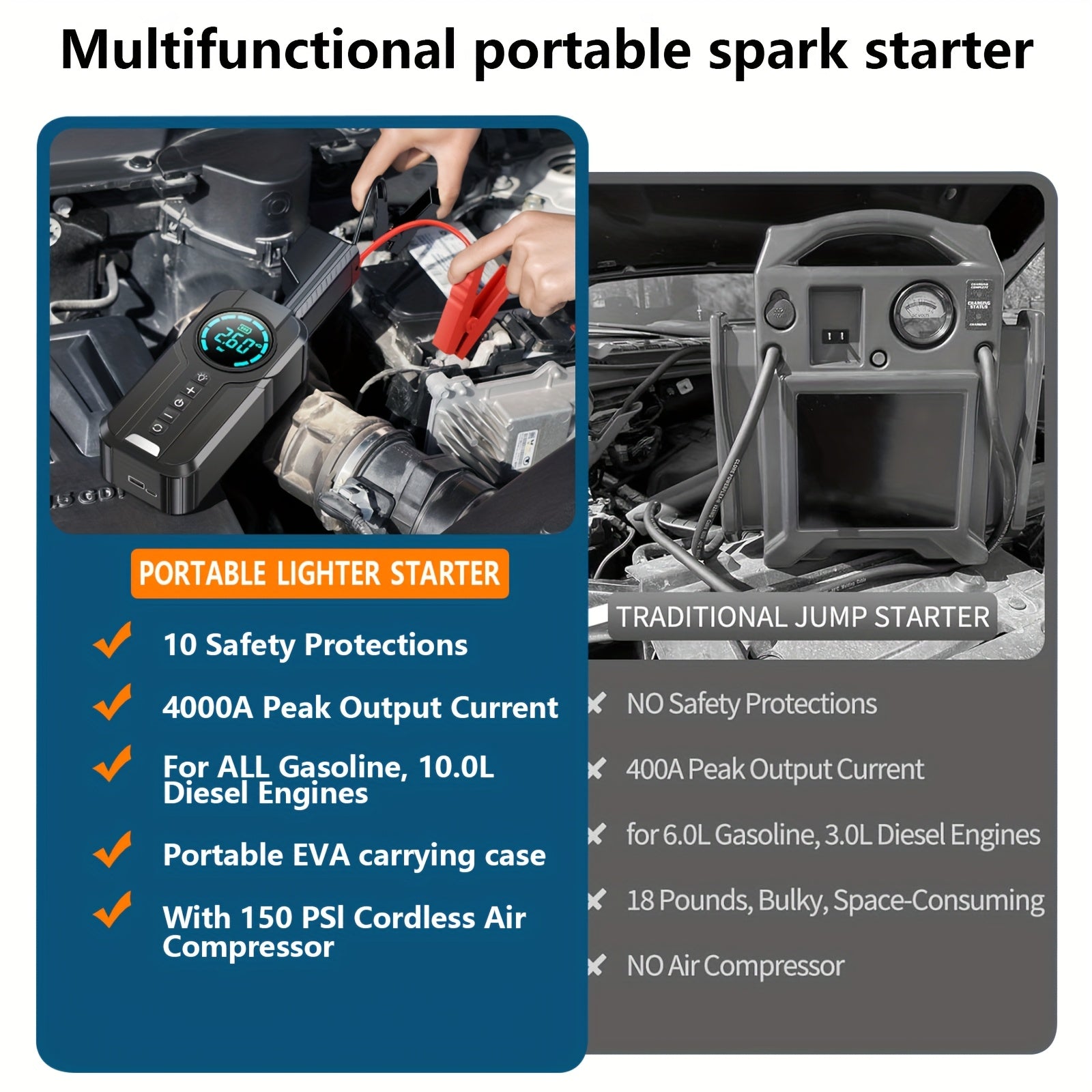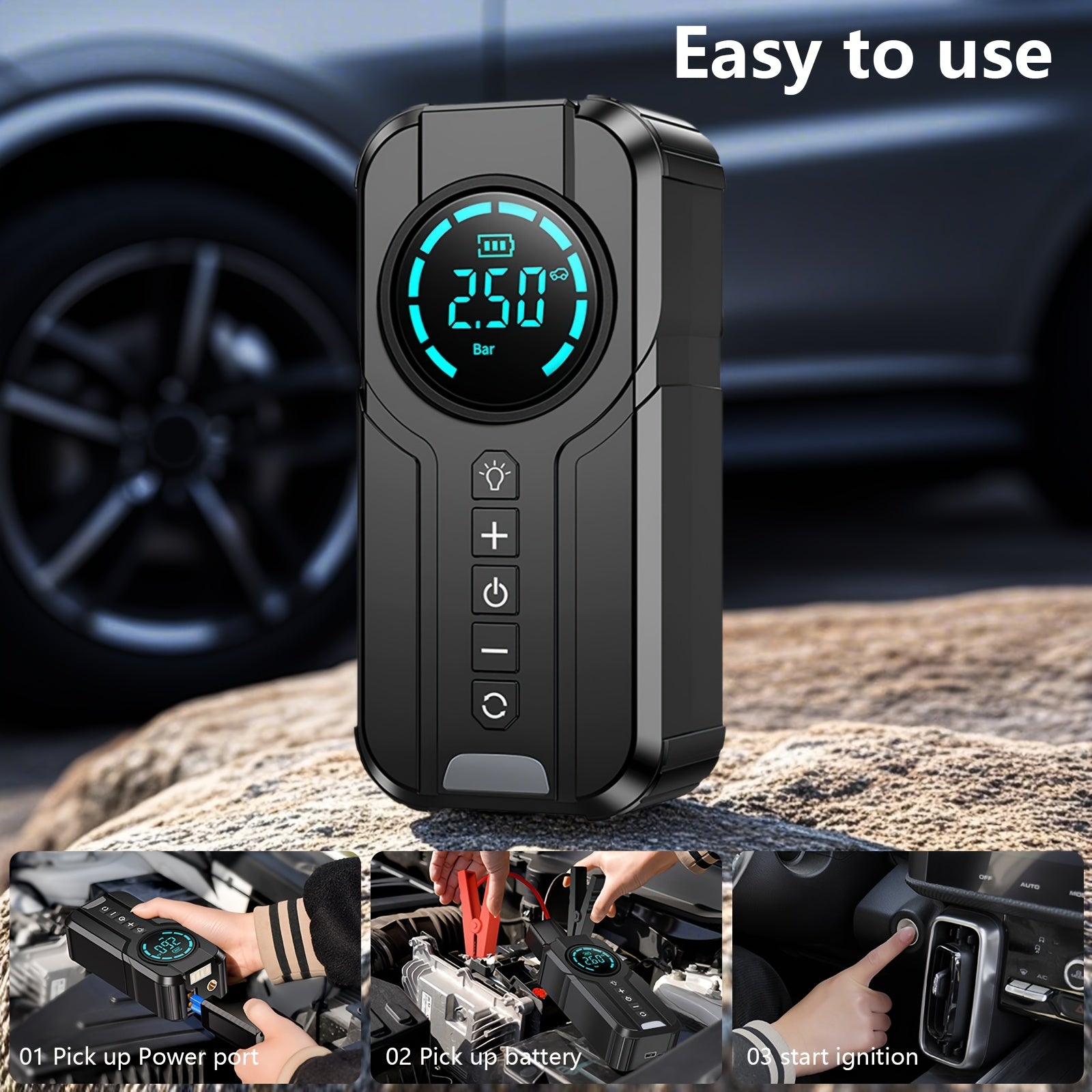 Avviatore Auto 4 in 1 & Gonfiapneumatici Portatile, Compressore d'Aria Multifunzione con Luce LED di Emergenza per Auto, SUV e Moto, Ricarica Rapida Batteria